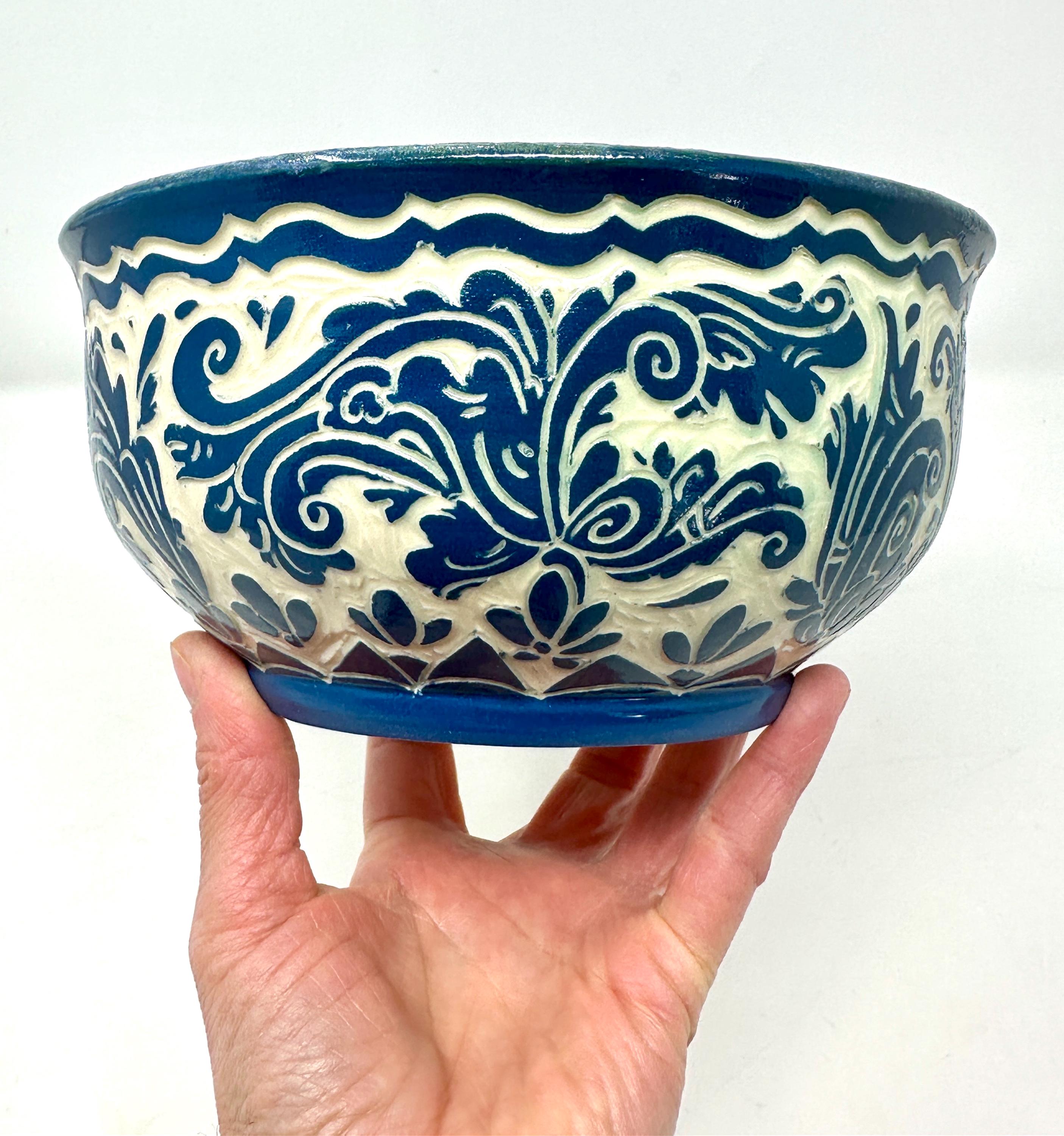 Wheel thrown stoneware bowl with hand carved Rosemaling designs in the round. Dark teal blue.