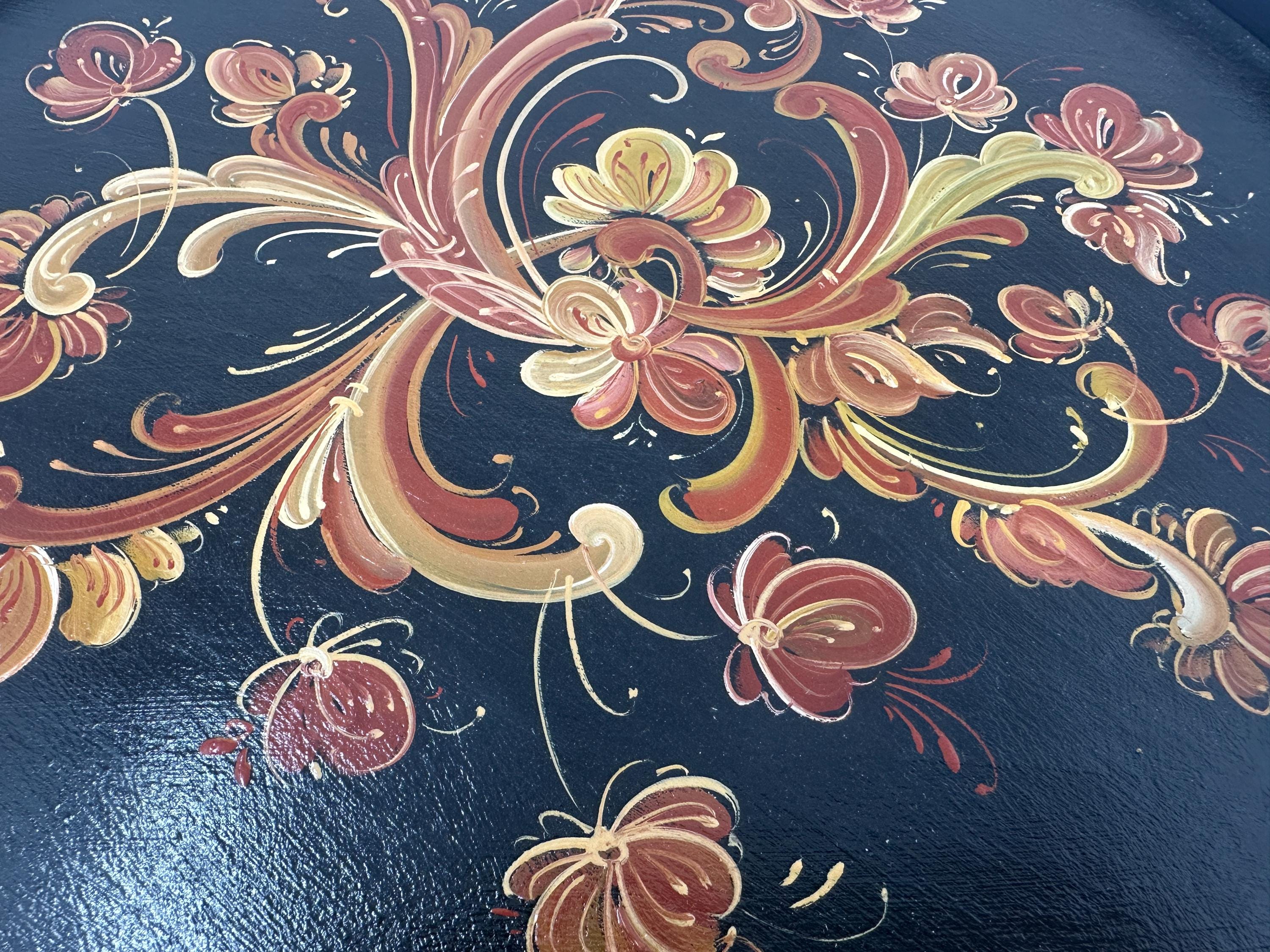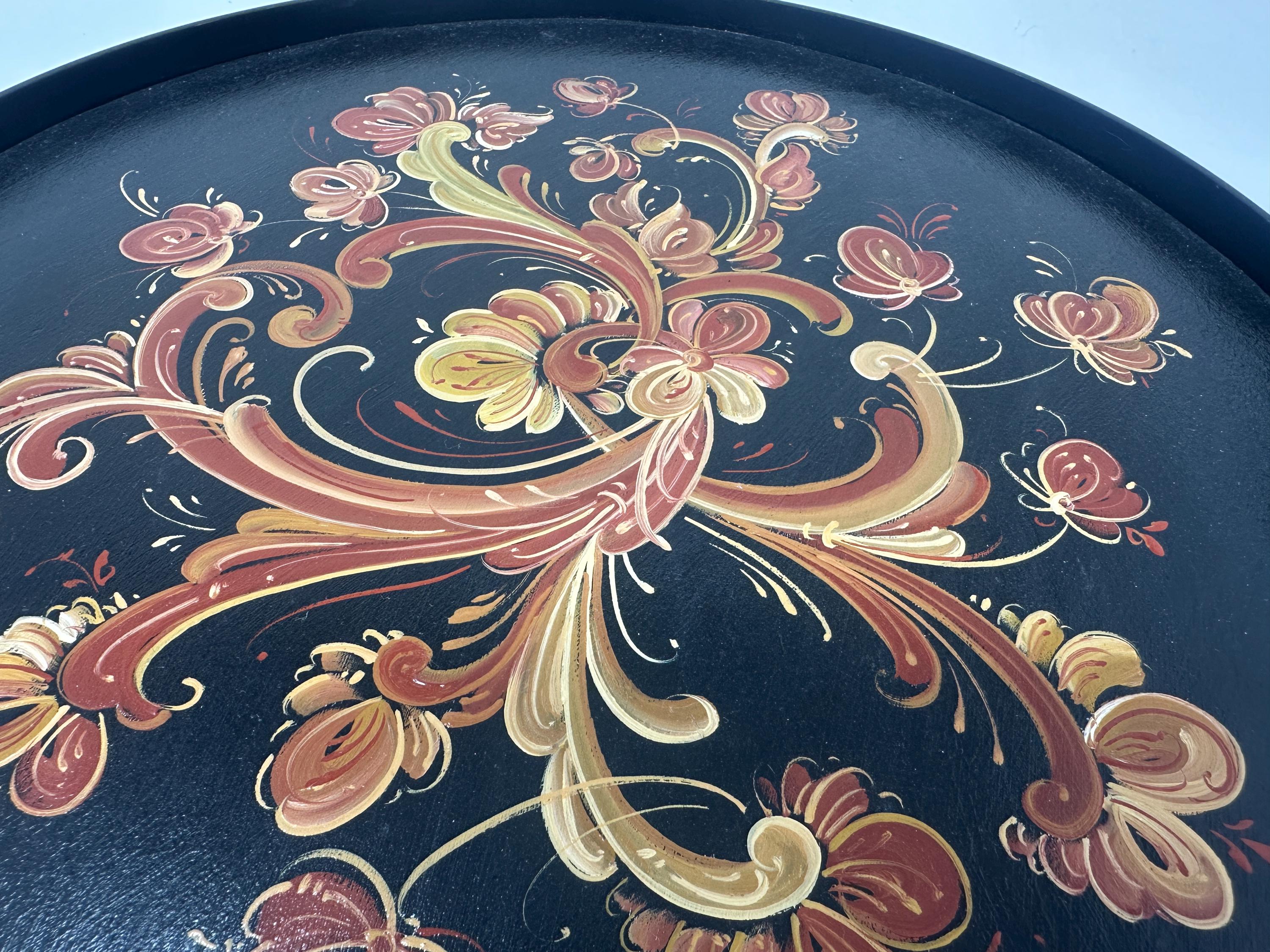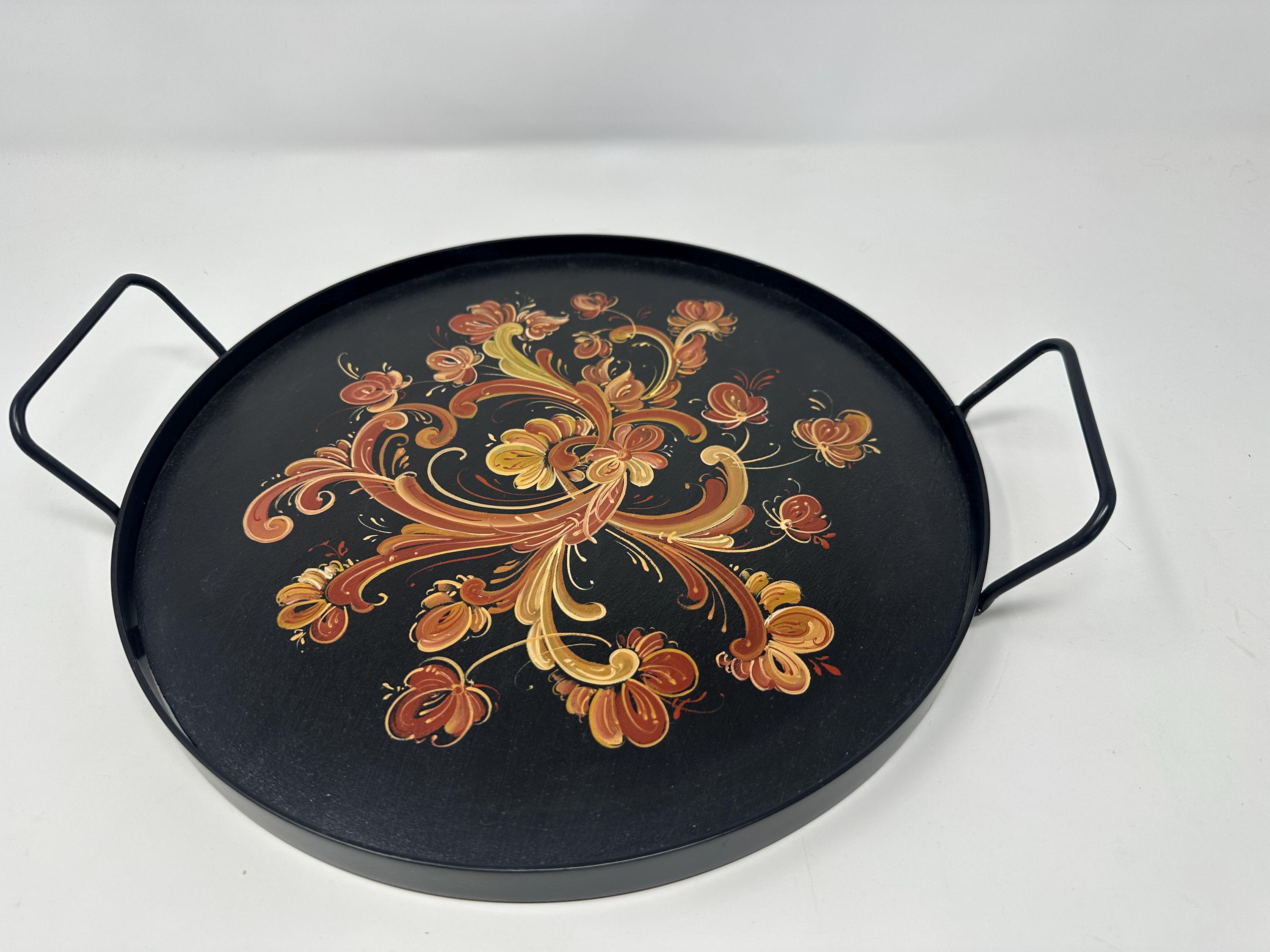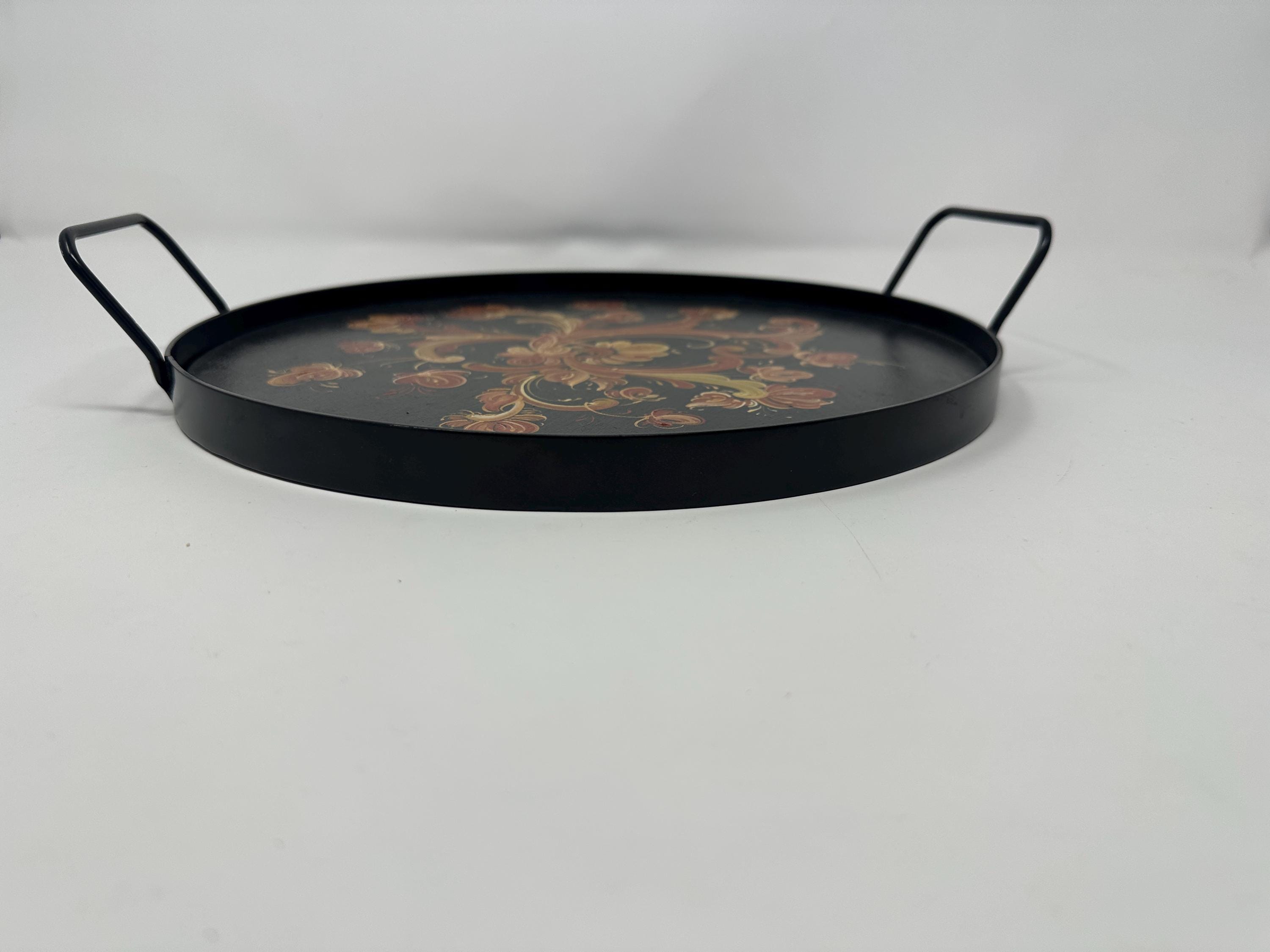 Black serving tay with handpainted Telemark Rosemaling, metal handles make it easy to carry, flay bottom easy to serve. Clean with a damp cloth, do not use knife as a cutting board.