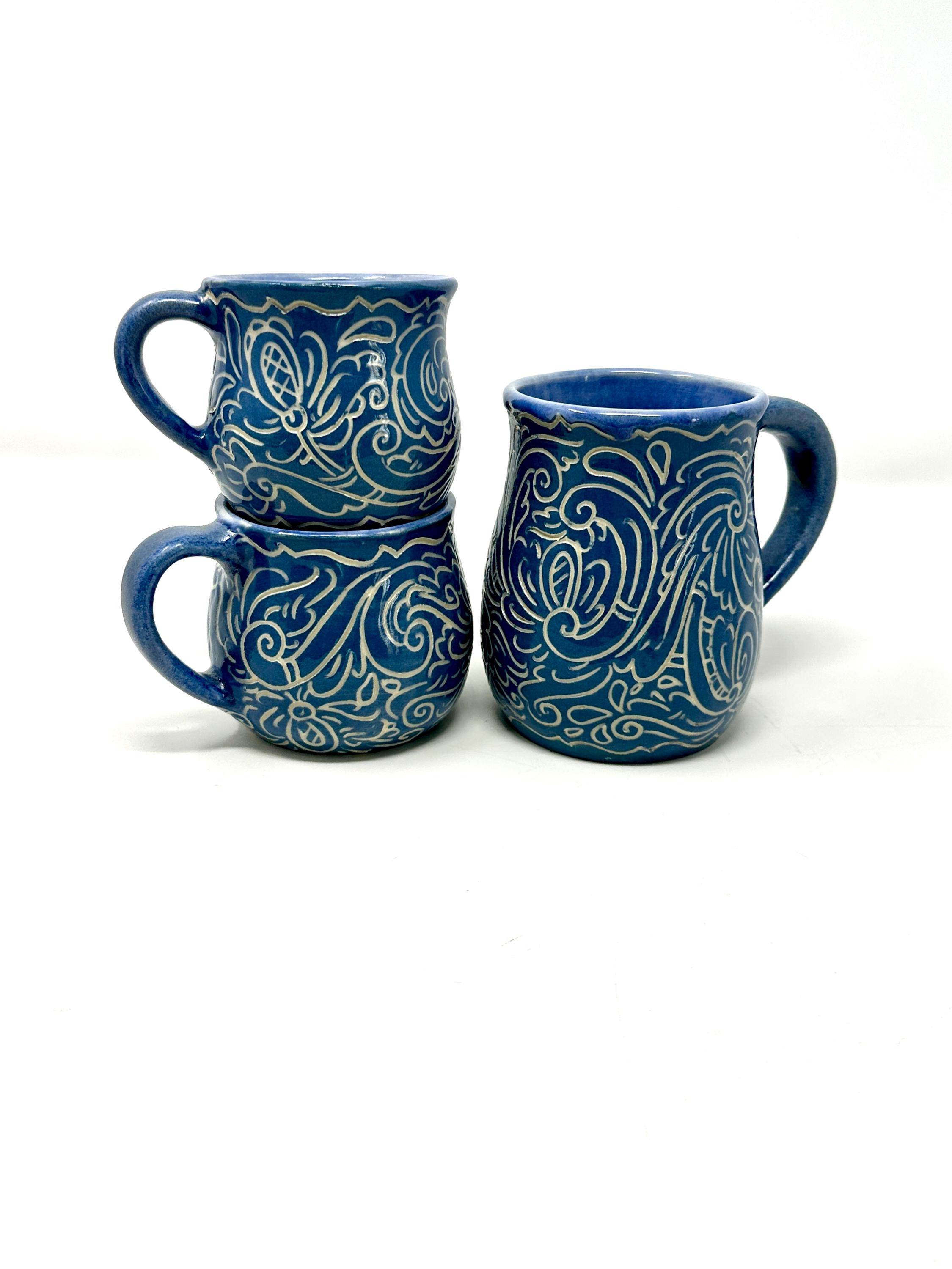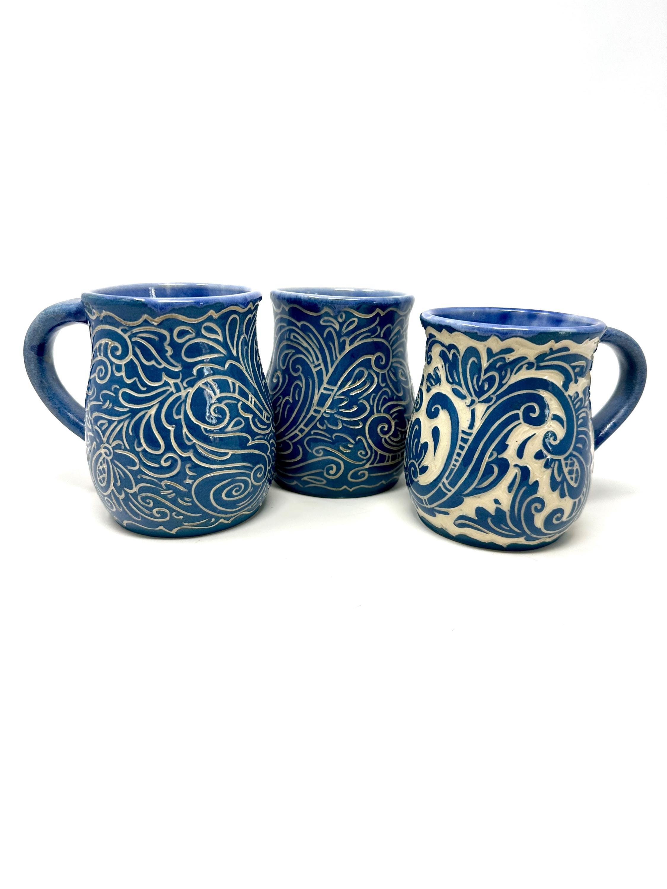 These mugs are wheel thrown and when leather hard an underglaze is applied (light blue) and the Rosemaling design is freestyle carved in.