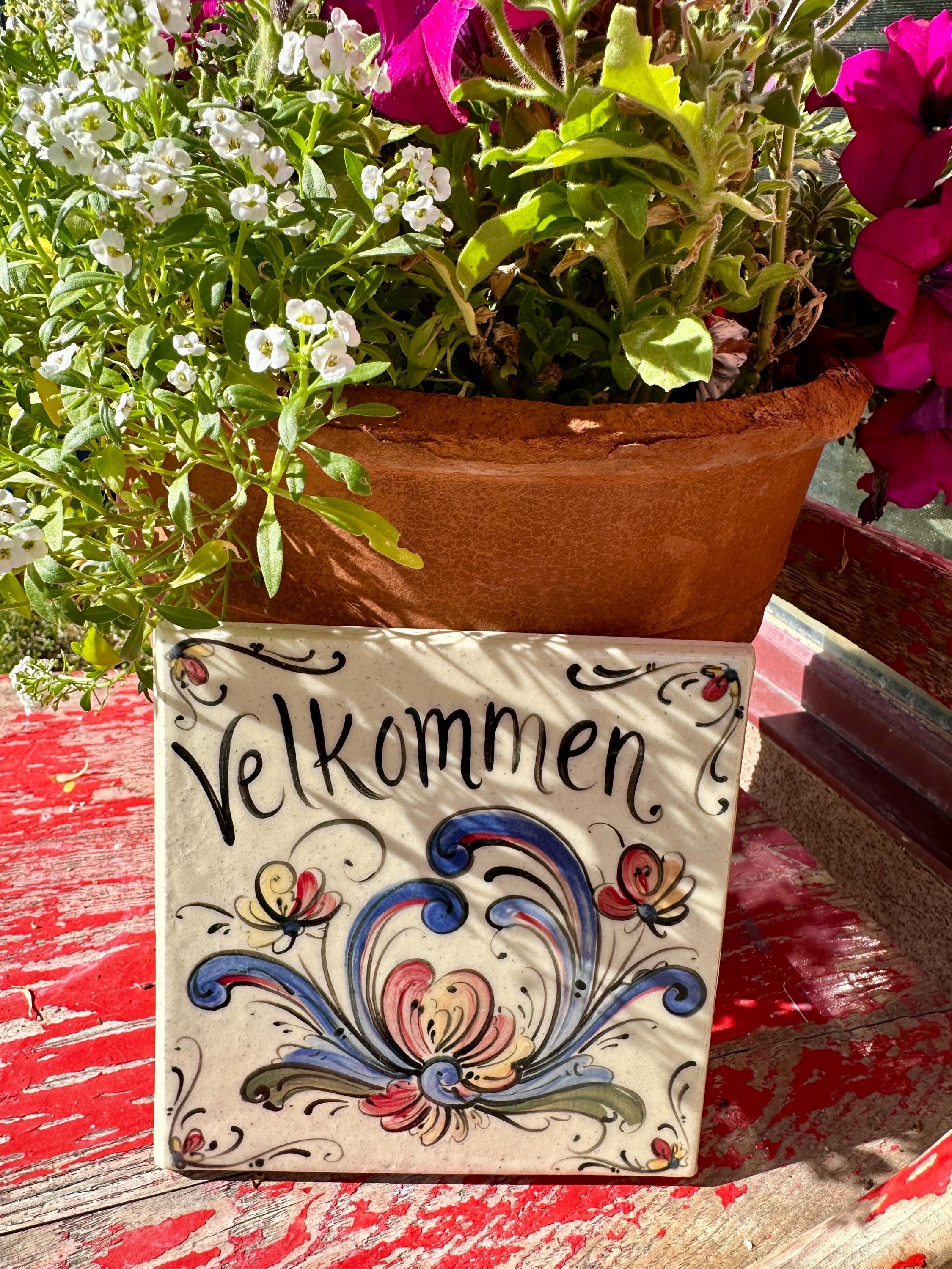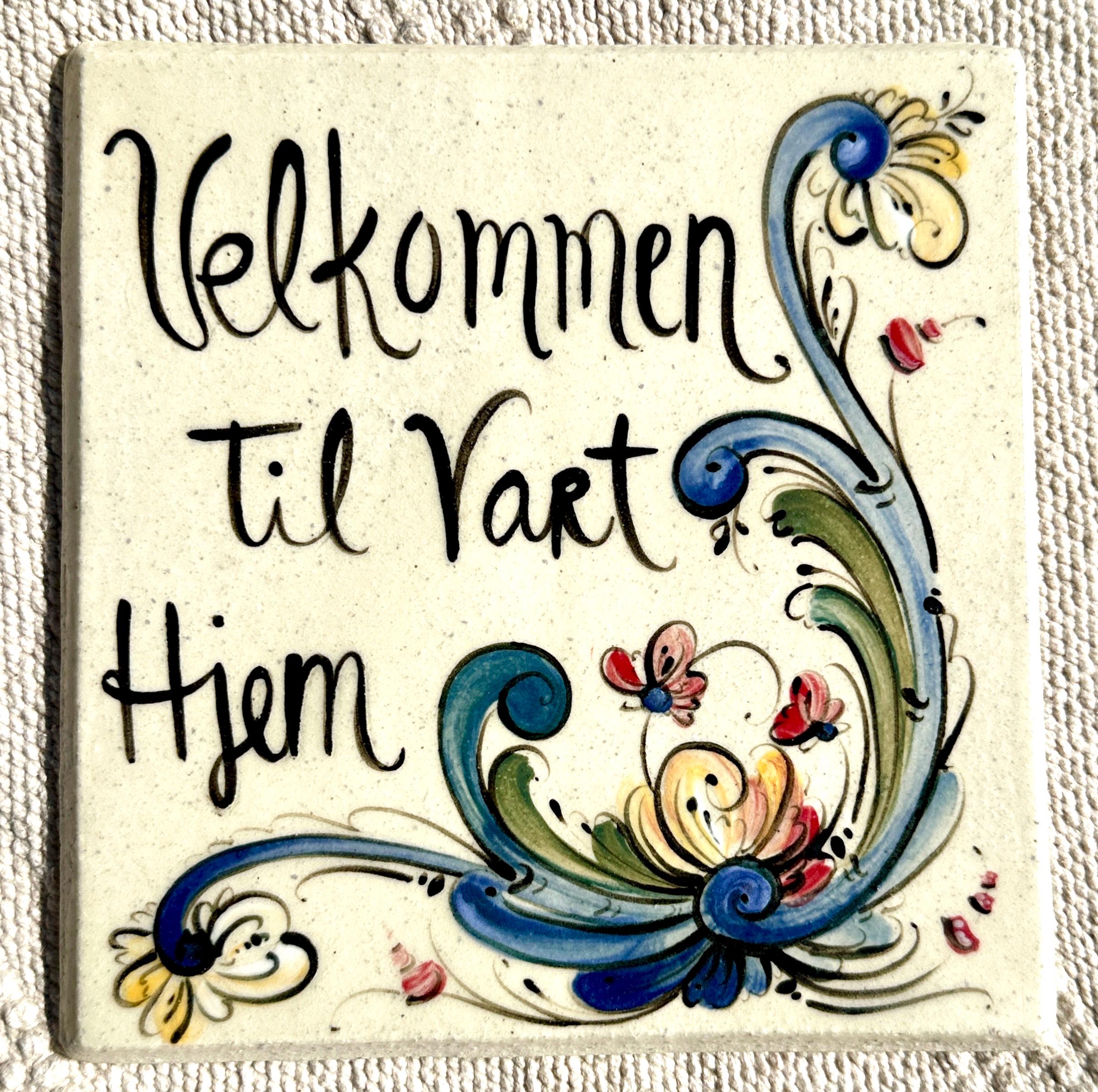 slab built, hand painted stoneware tiles with Telemark and Os Rosemaling. Rugged stoneware clay has sand for use outdoors; can be mounted with mastic like any tile or used in the kitchen as a spoon rest, trivet or as a decorative accent.