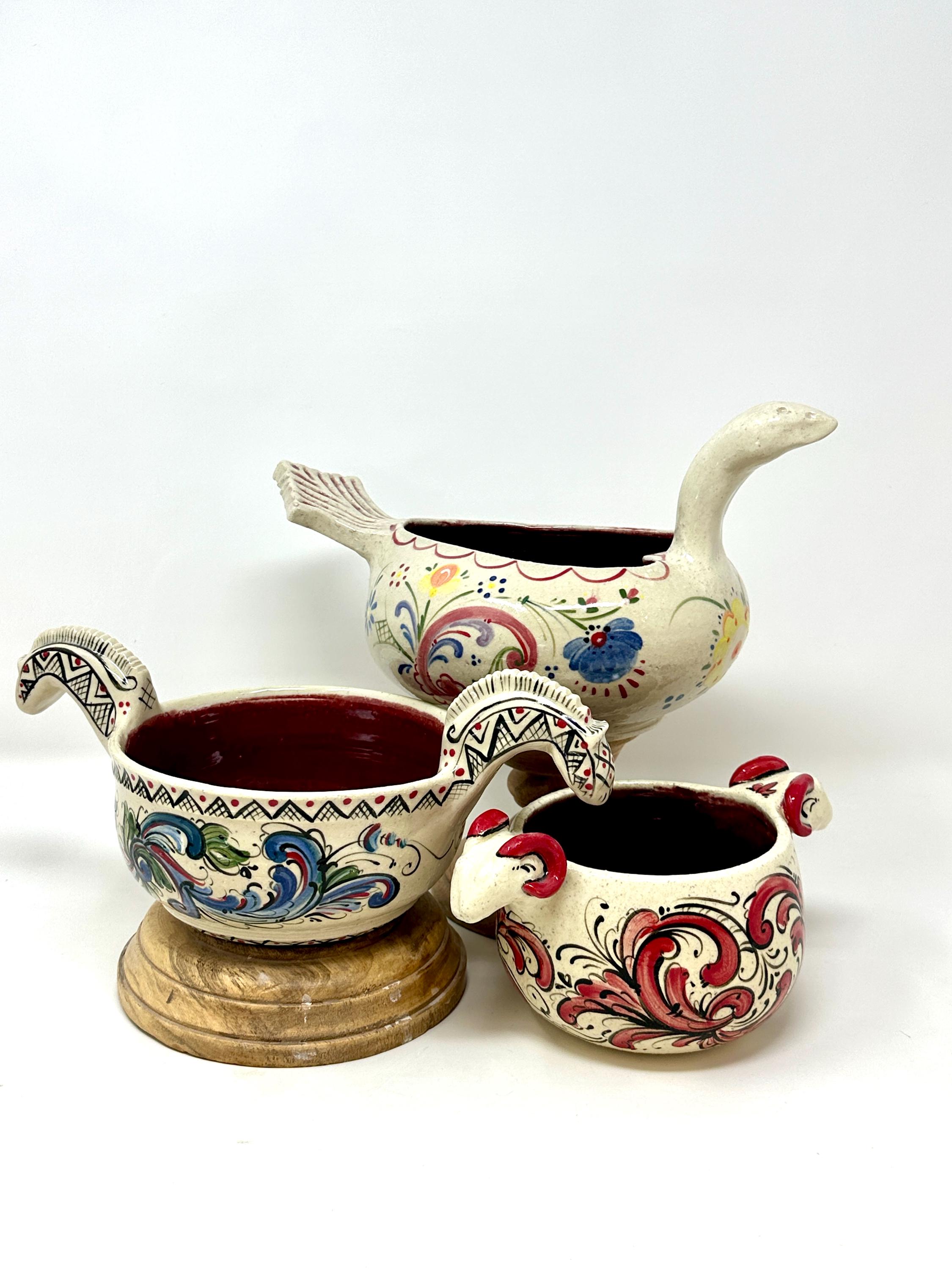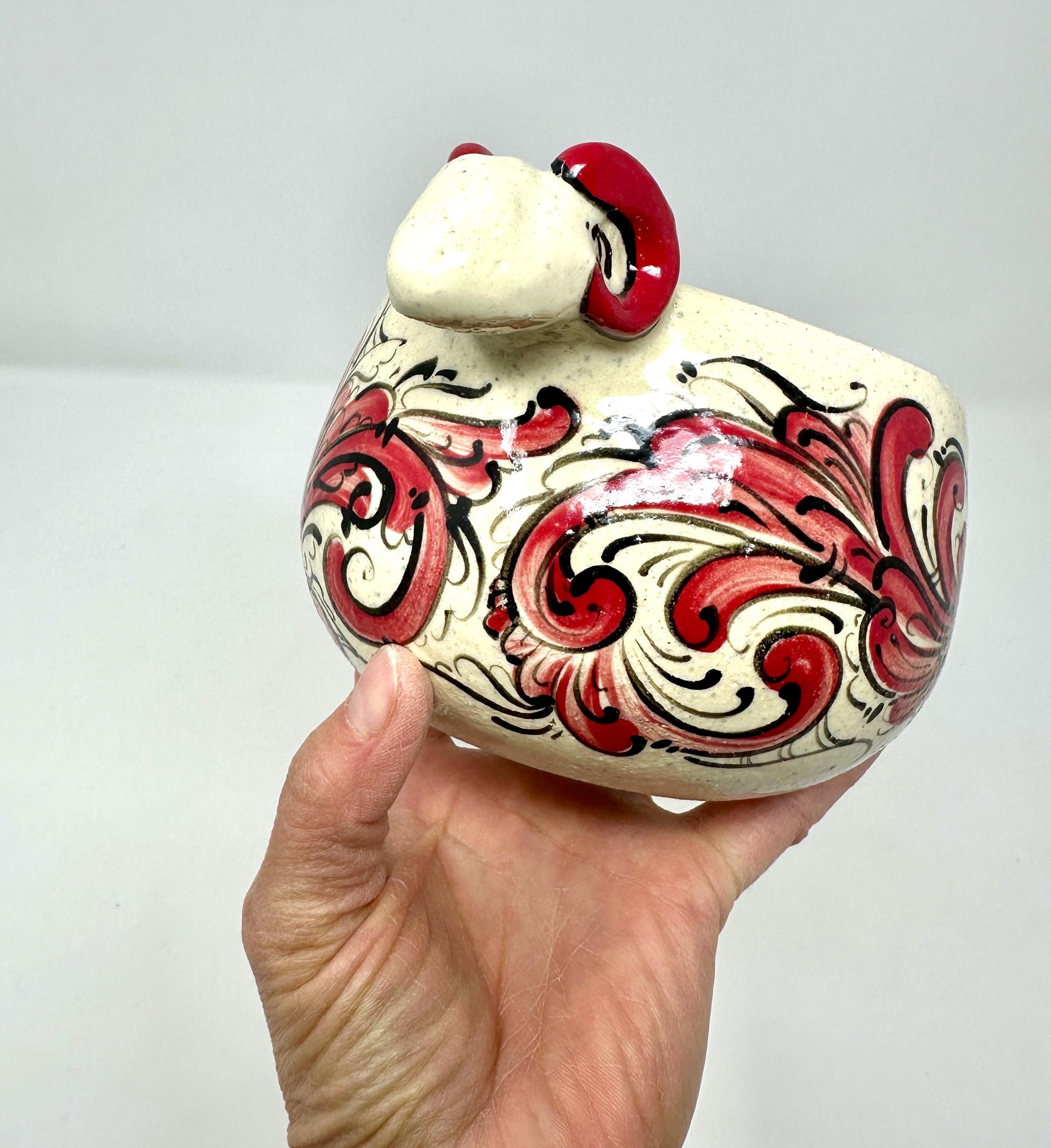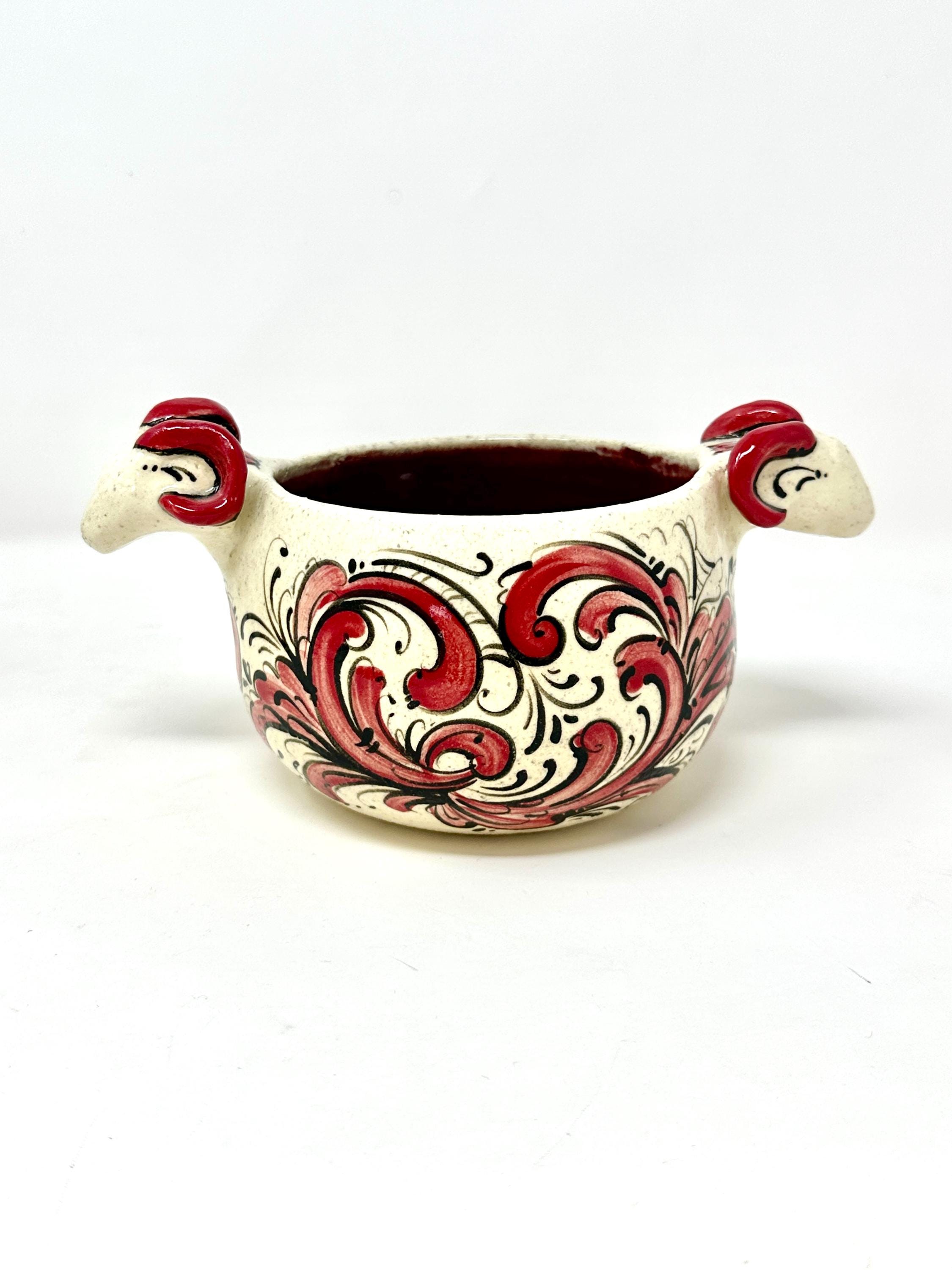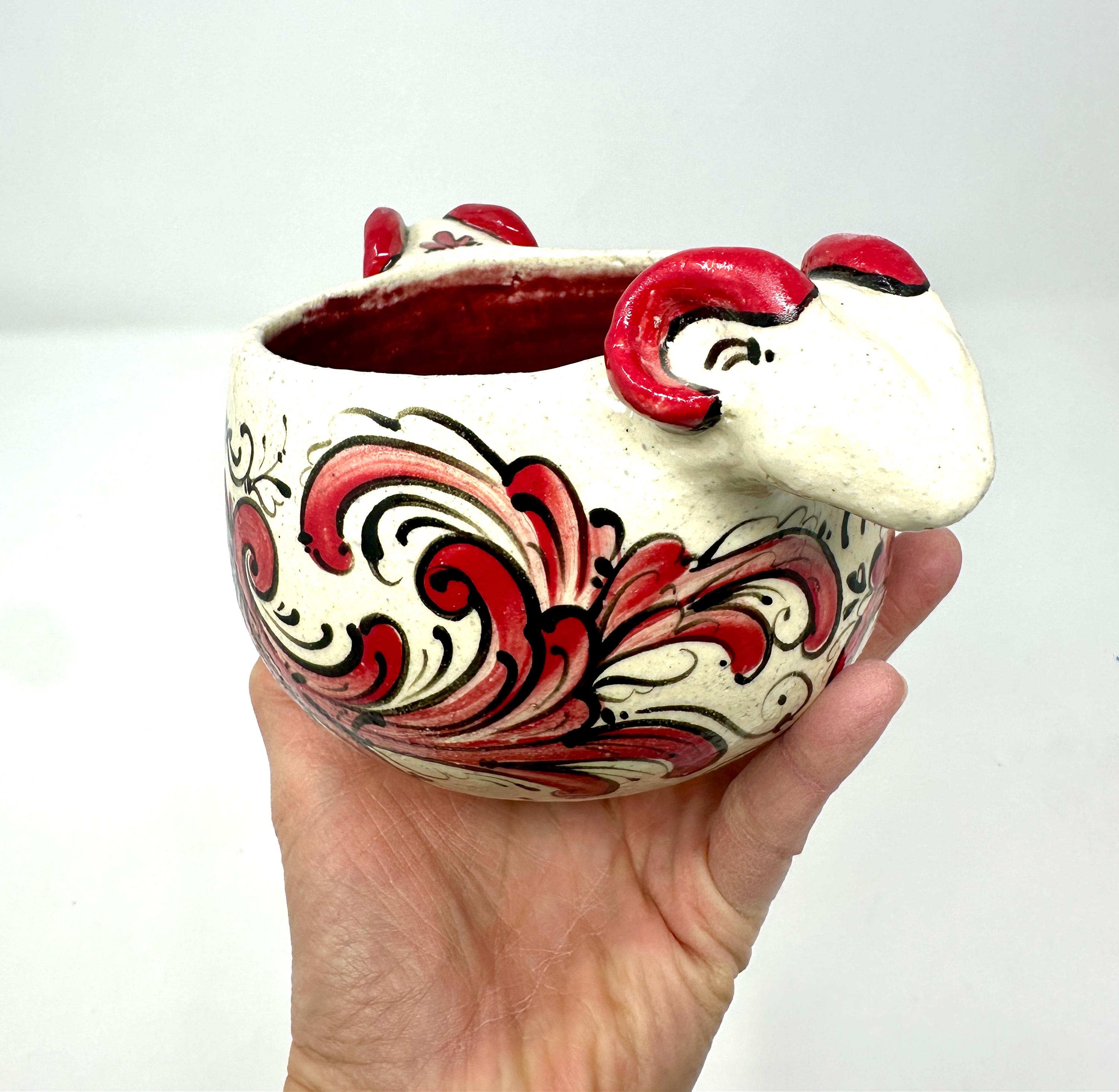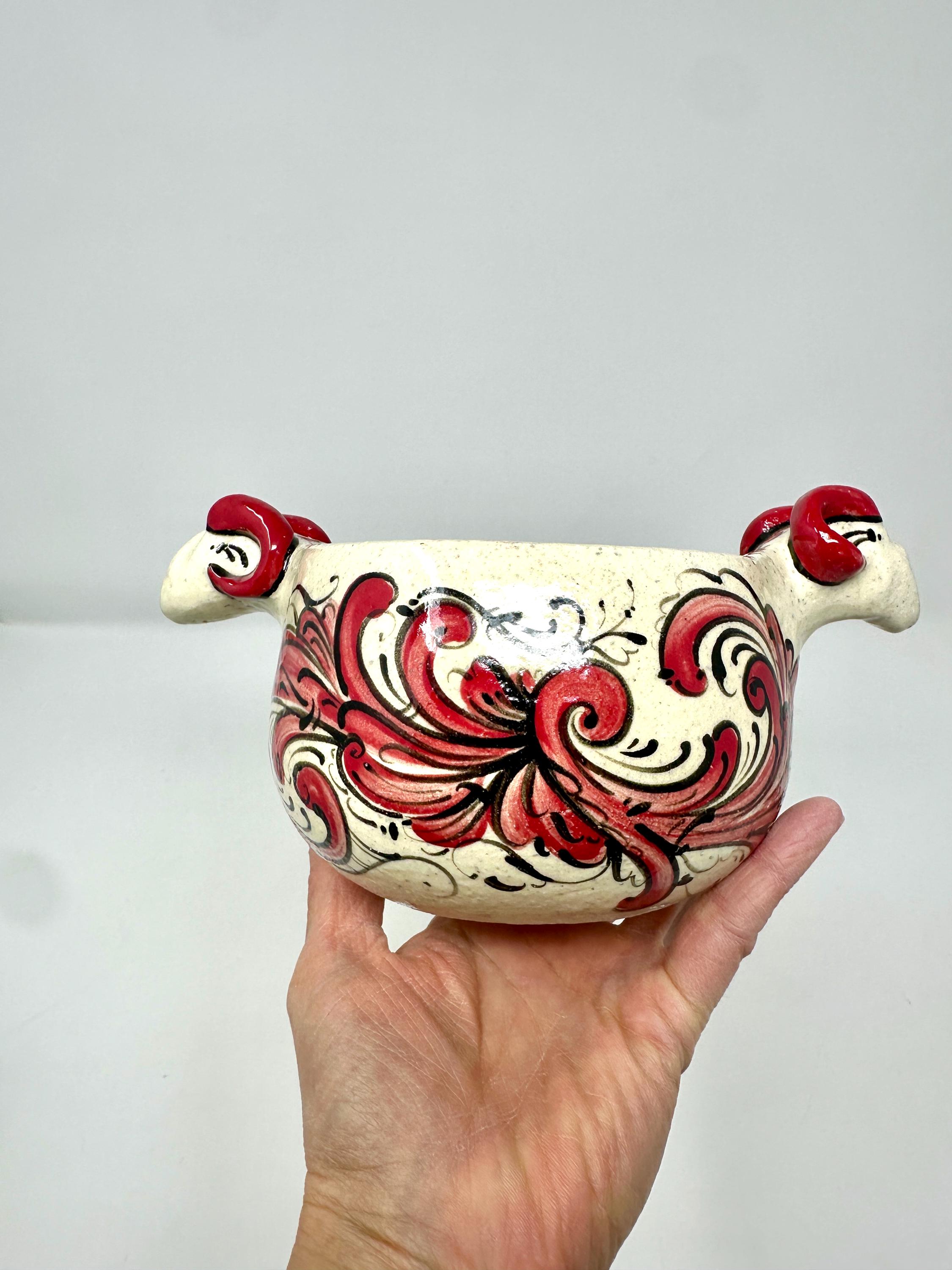 Wheel thrown stoneware bowl with hand built rams heads, handpainted with Telemark Rosemaling. One of a kind, decorated in the round.