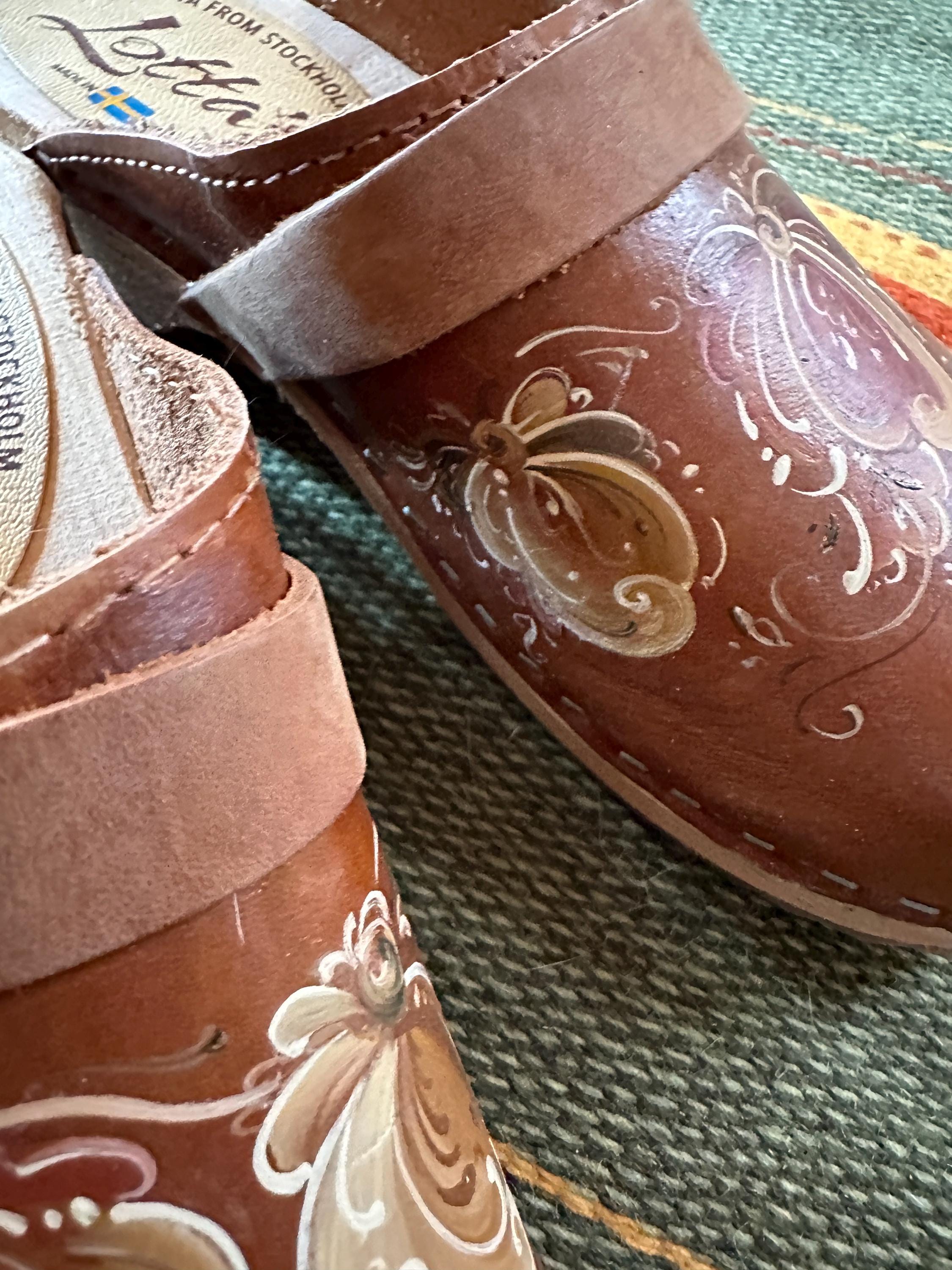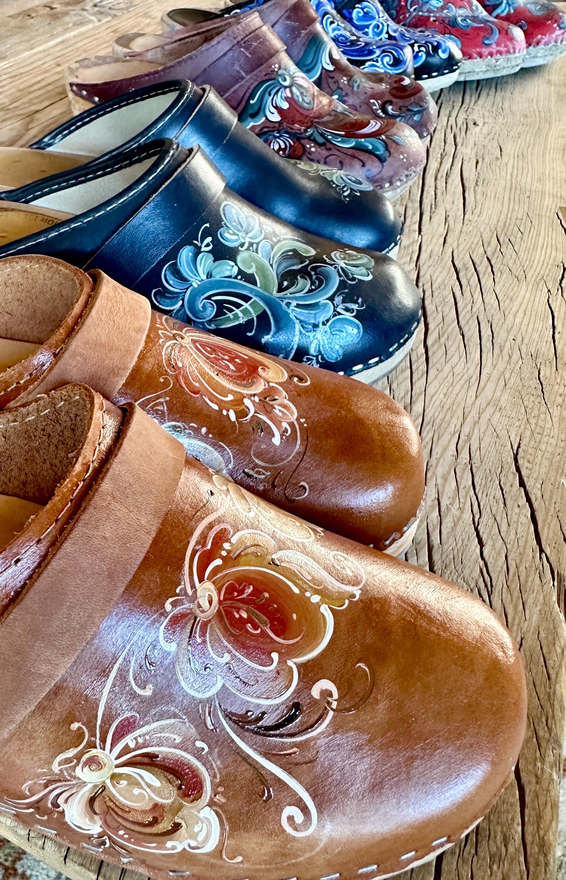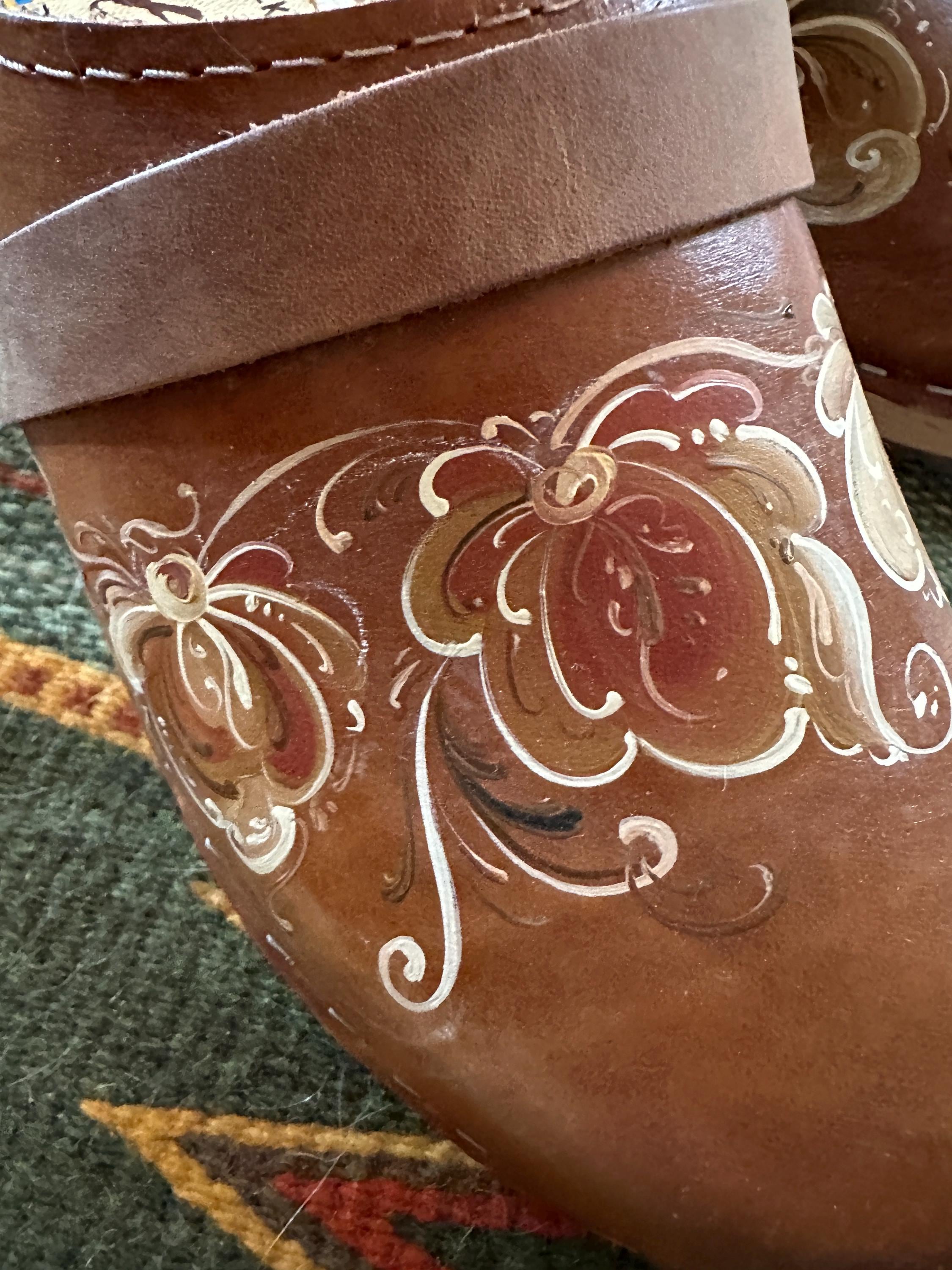 Handpainted traditional Swedish clogs with Norwegian Rosemaling. Telemark flower design across the top of the clog, leather sealed, leather strip suede