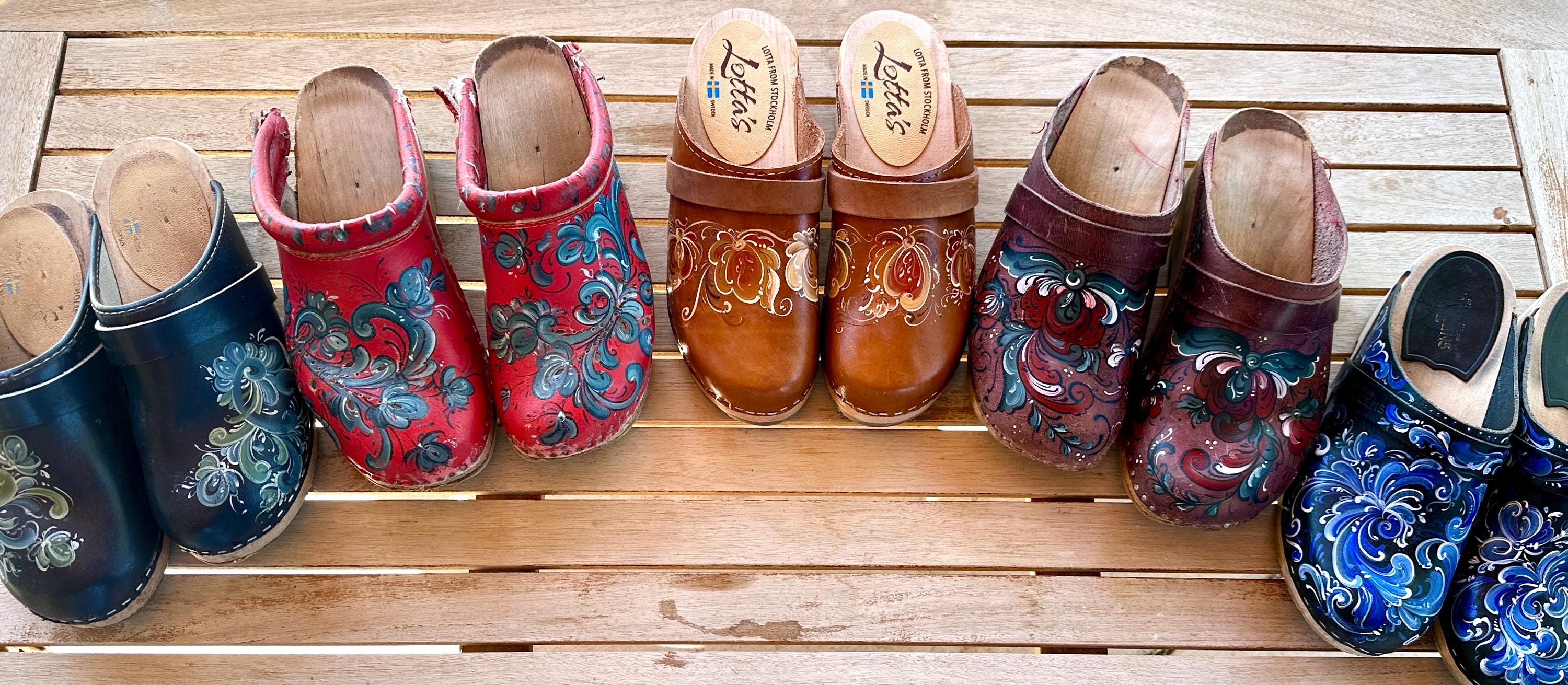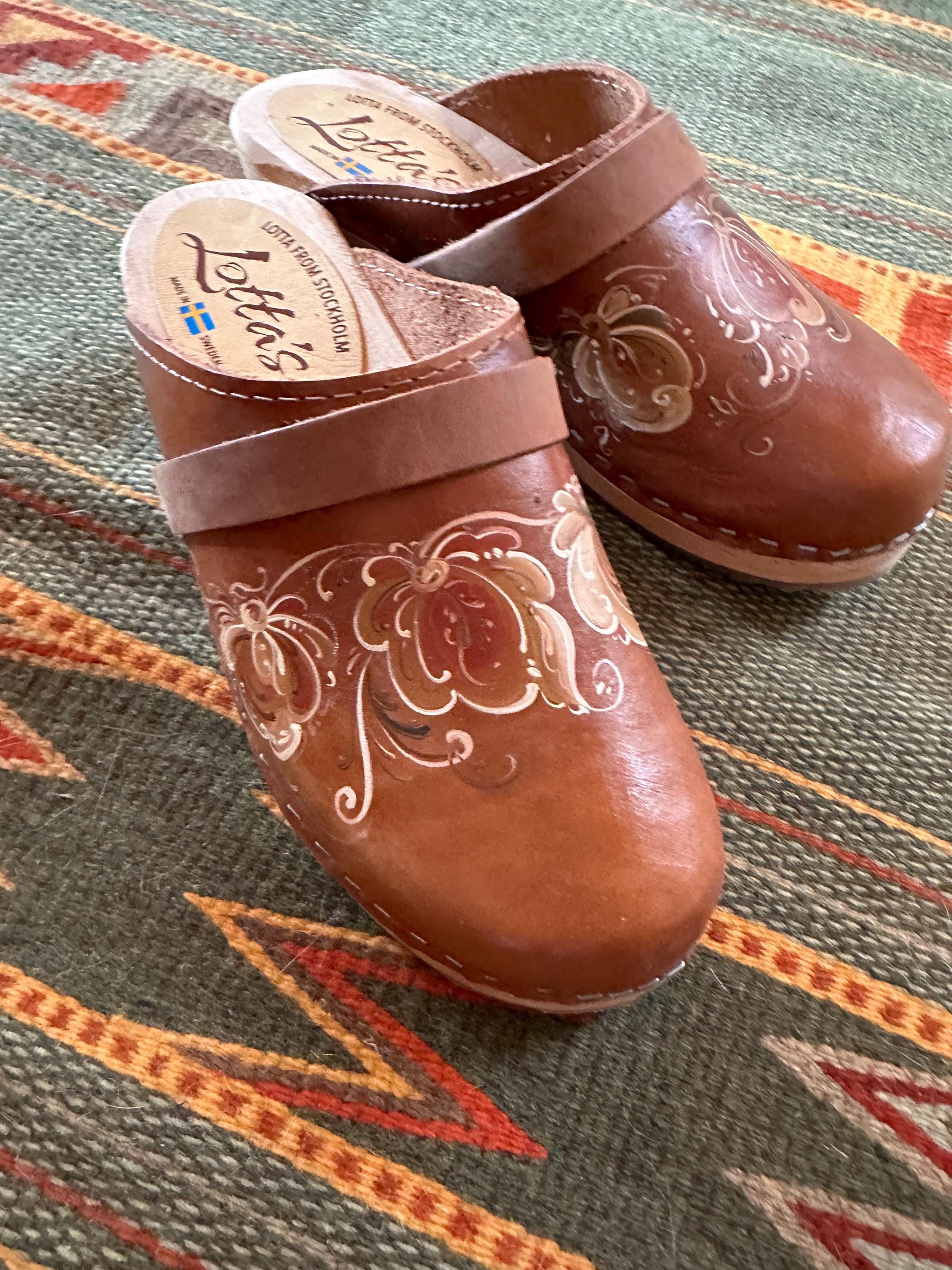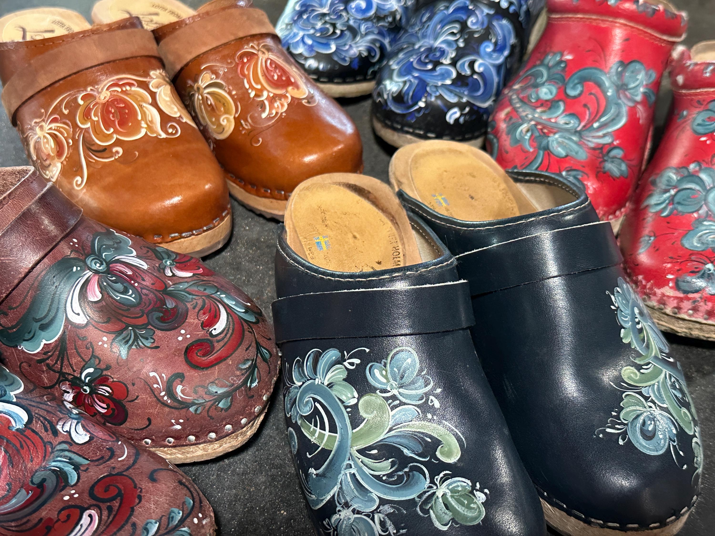 Handpainted traditional Swedish clogs with Norwegian Rosemaling. Telemark flower design across the top of the clog, leather sealed, leather strip suede
