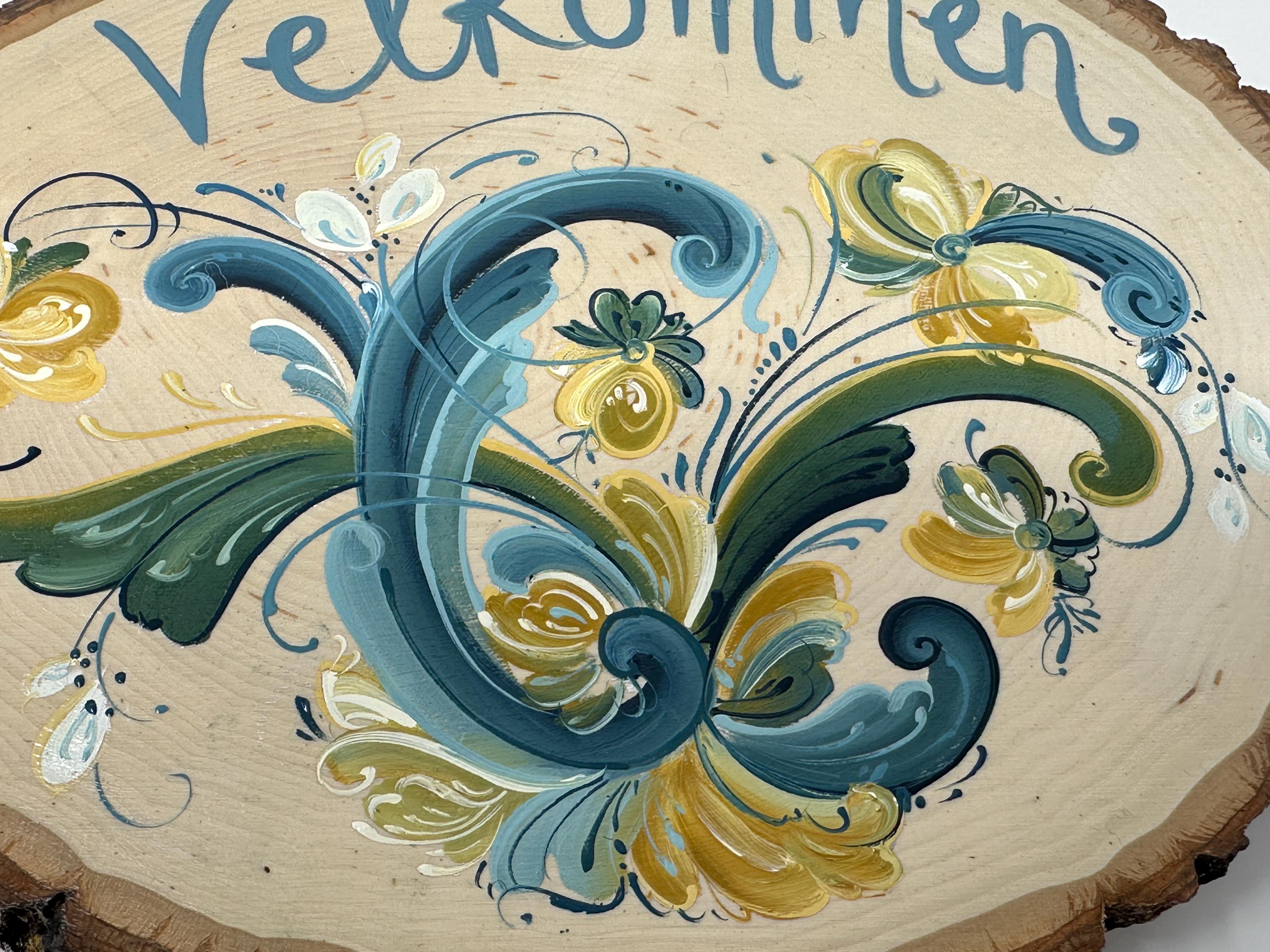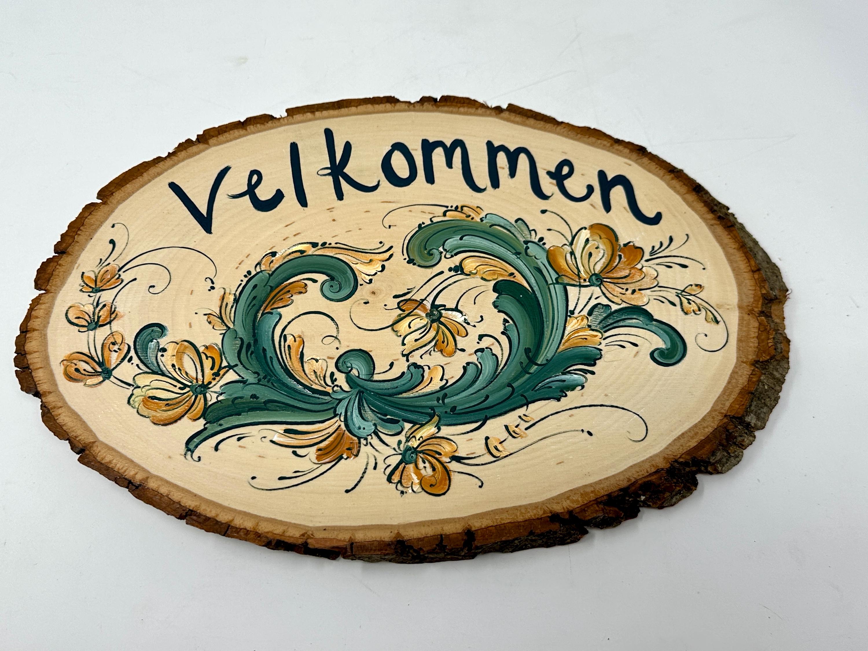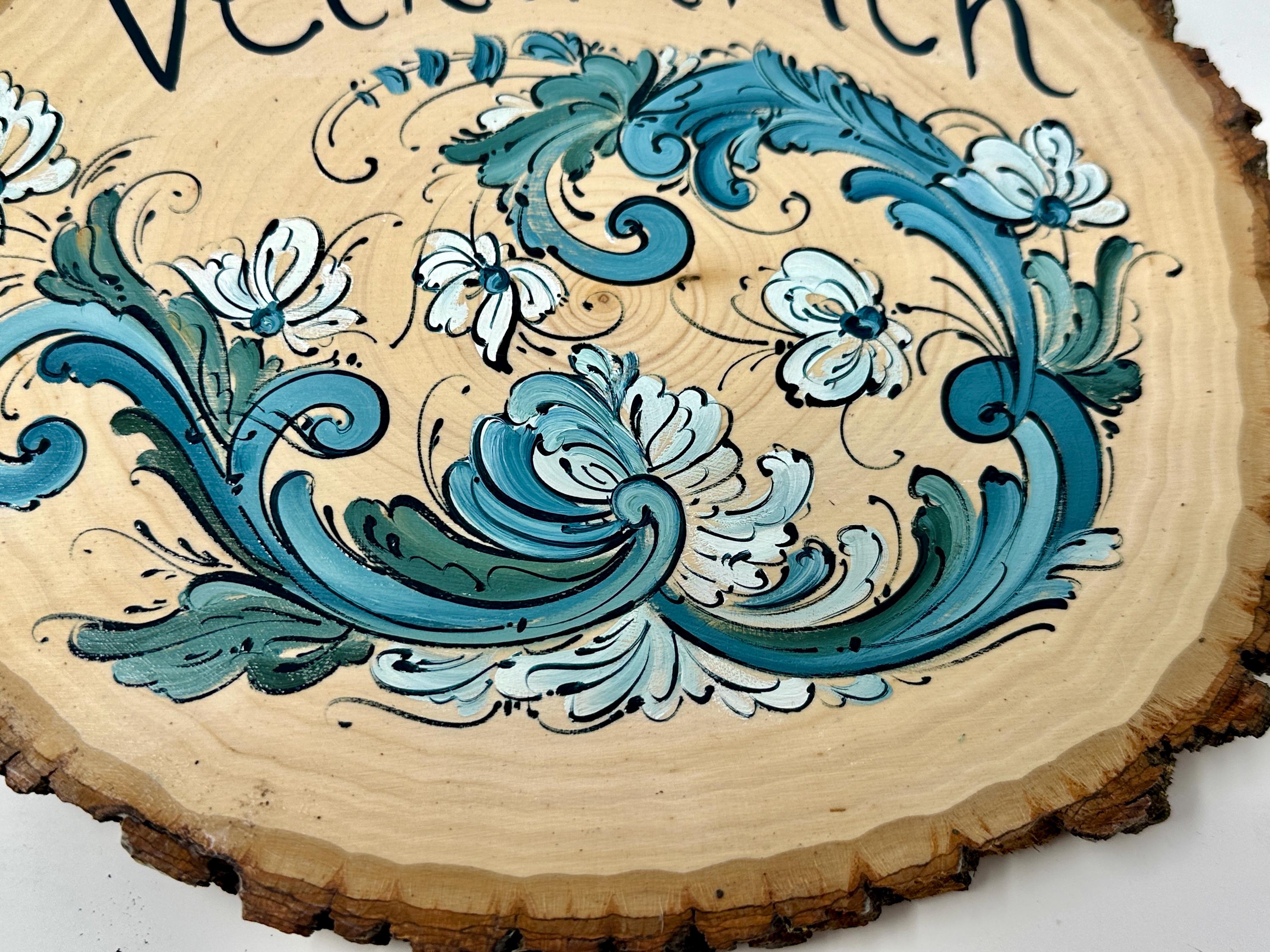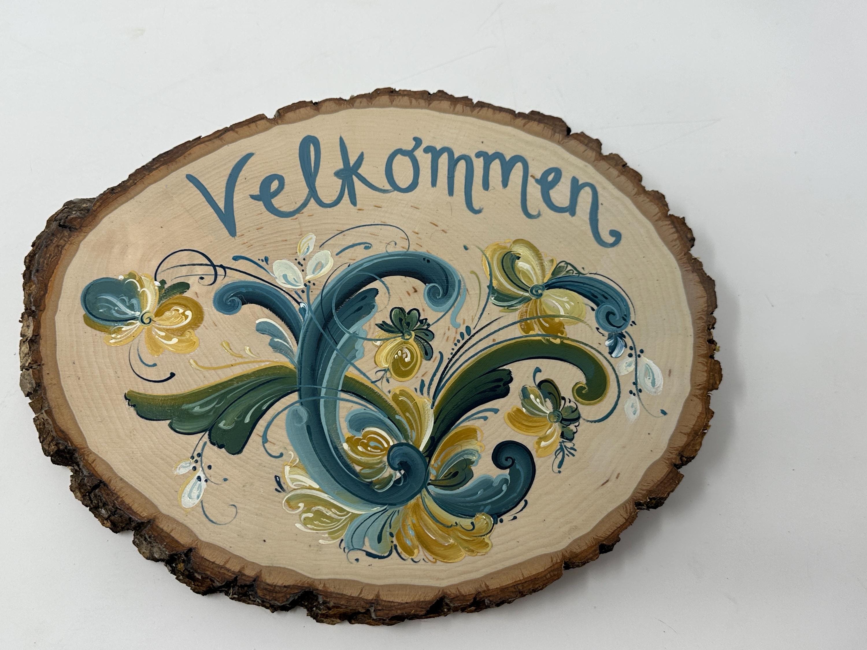 Velkommen (welcome!). Norwegian Telemark Rosemaling. Handpainted oil on pine with natural bark edge.