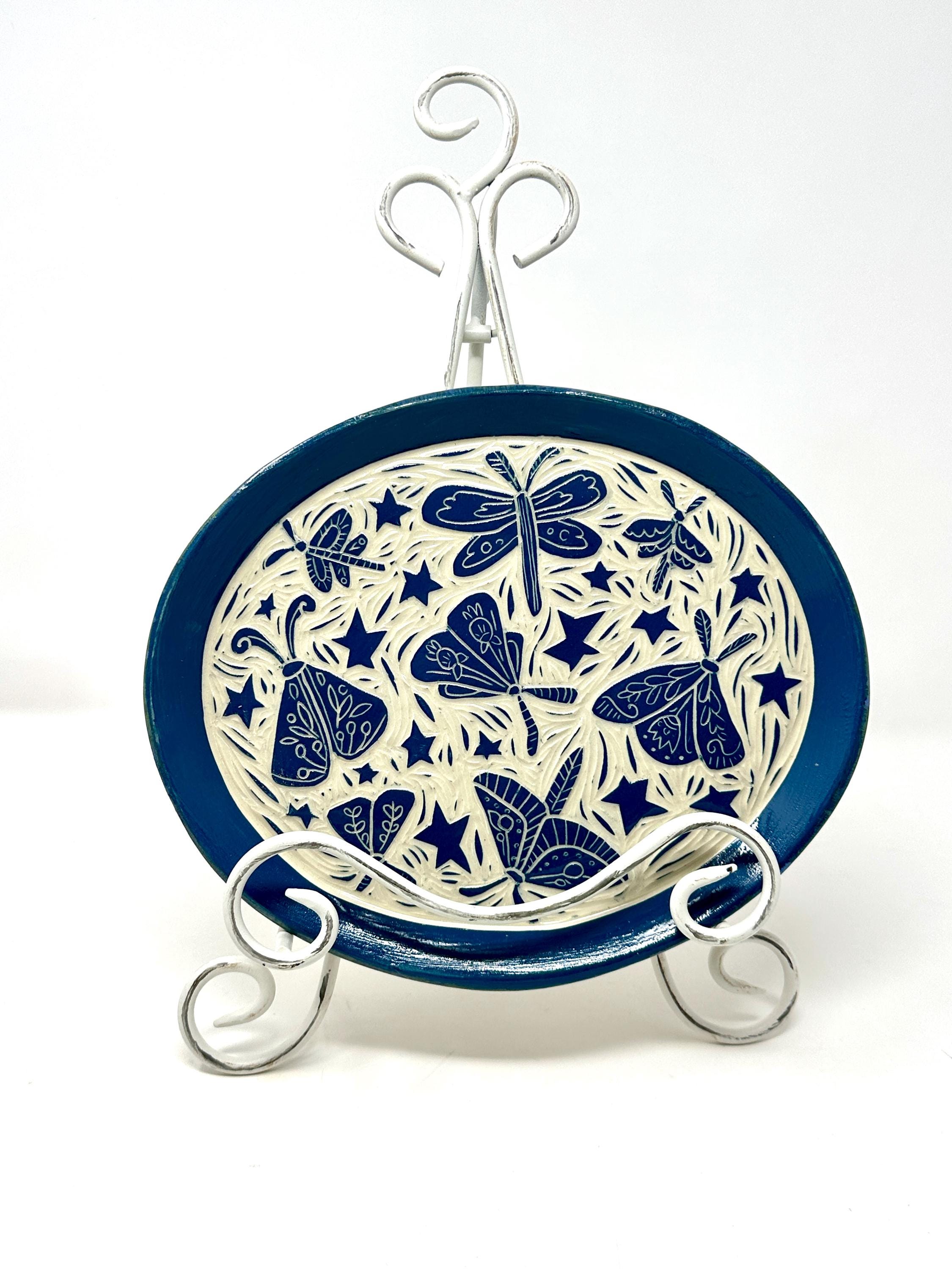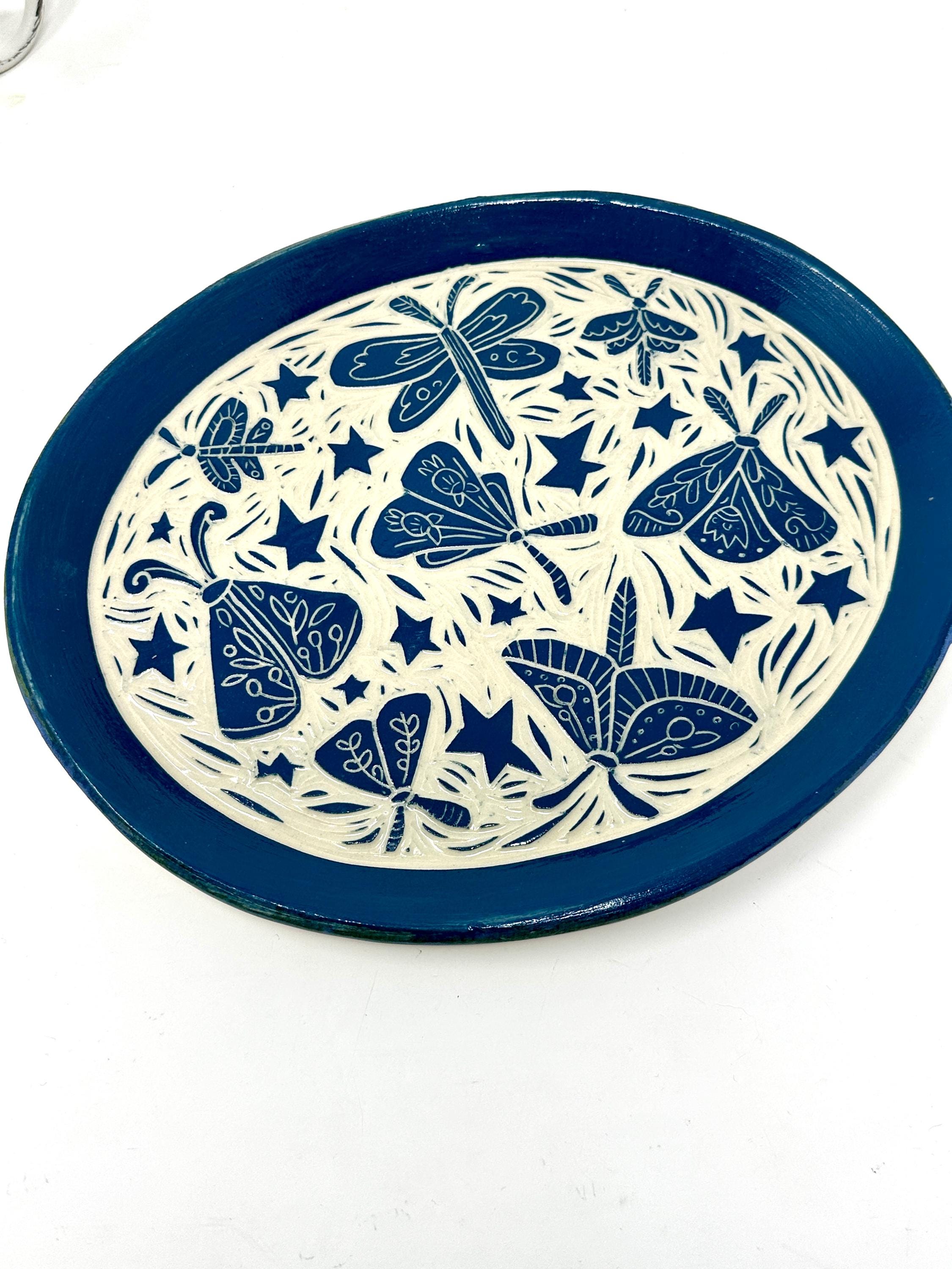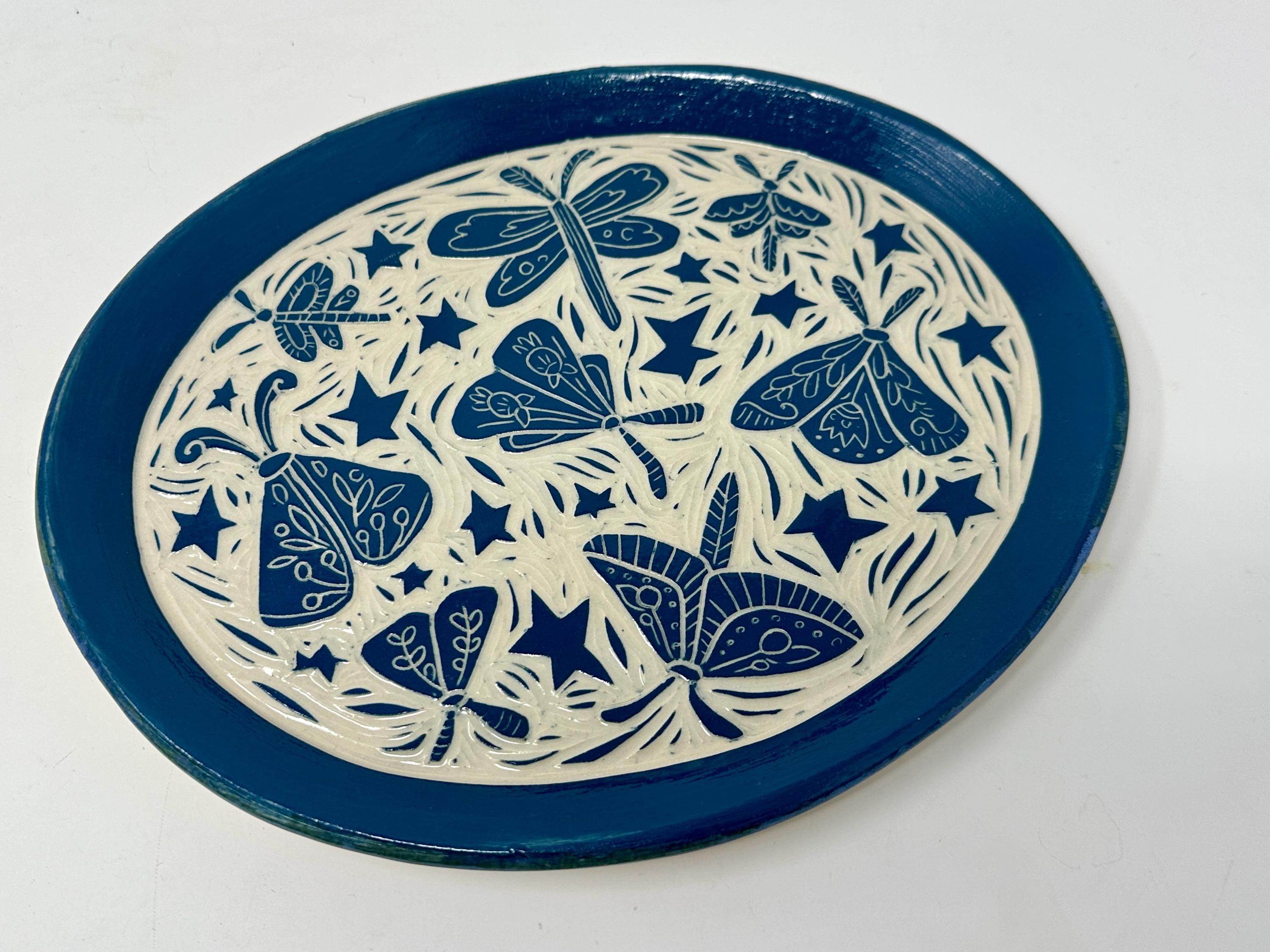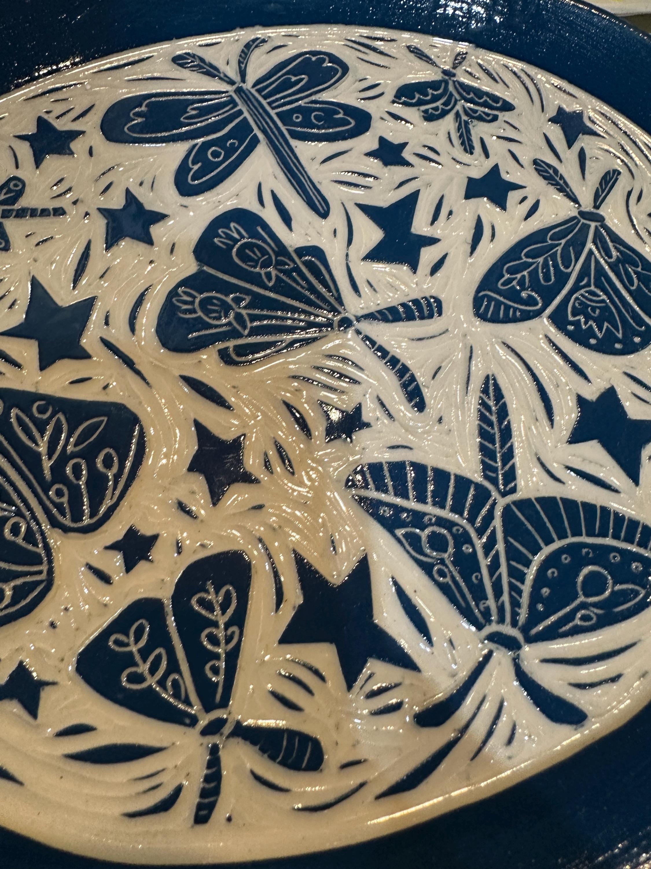Moth tray. Slab built serving or decorative tray with folk art moths and stars.