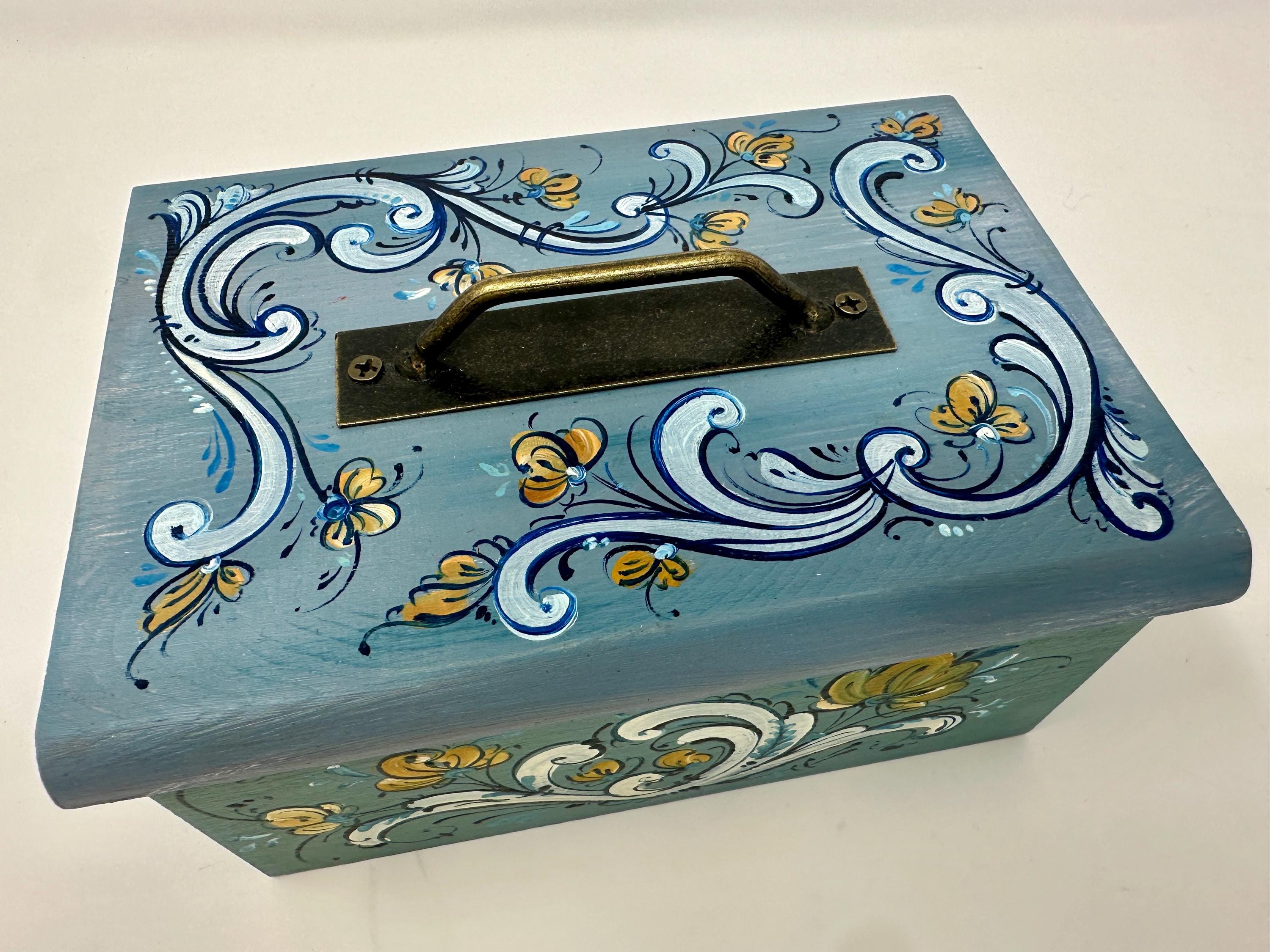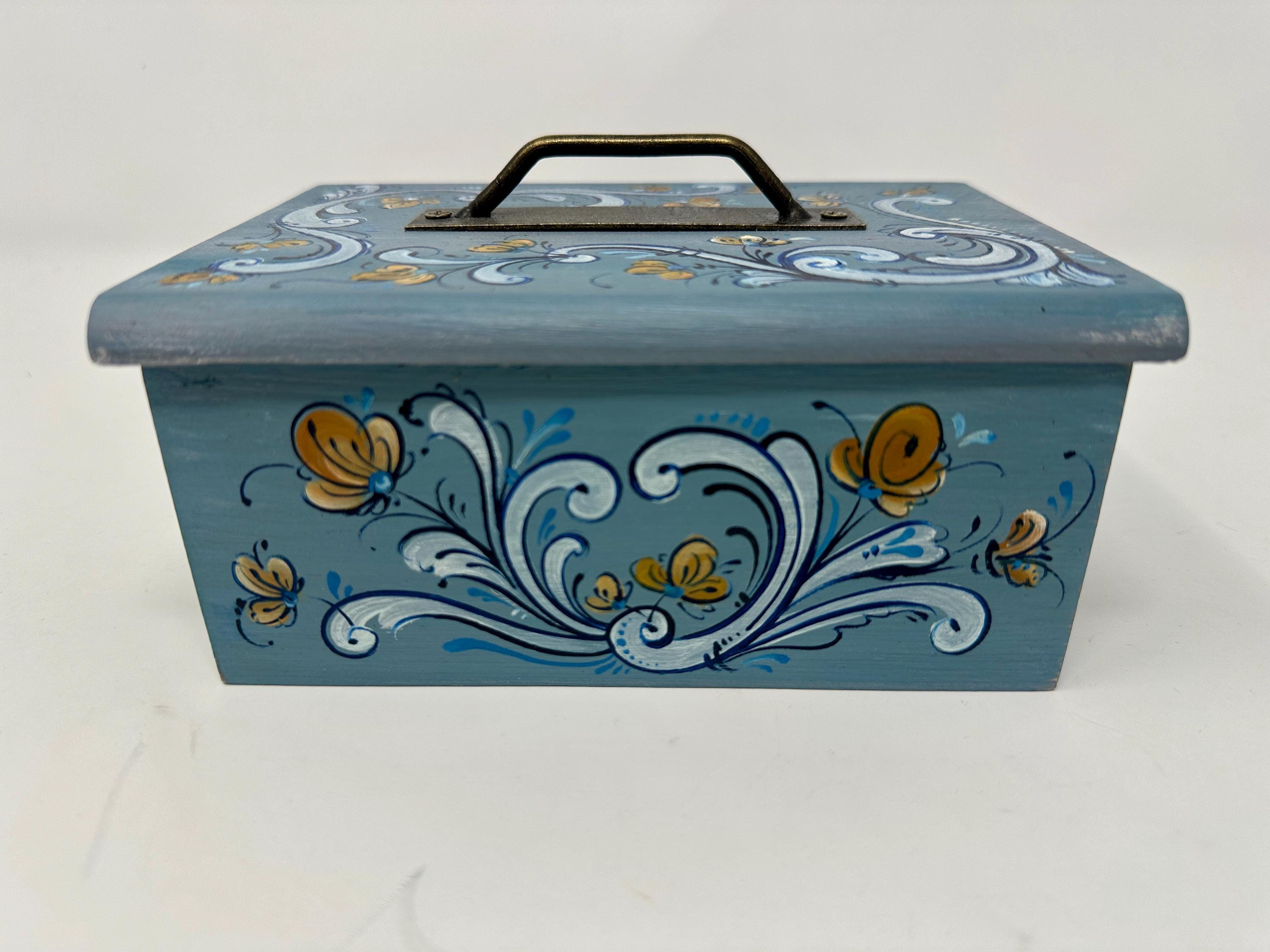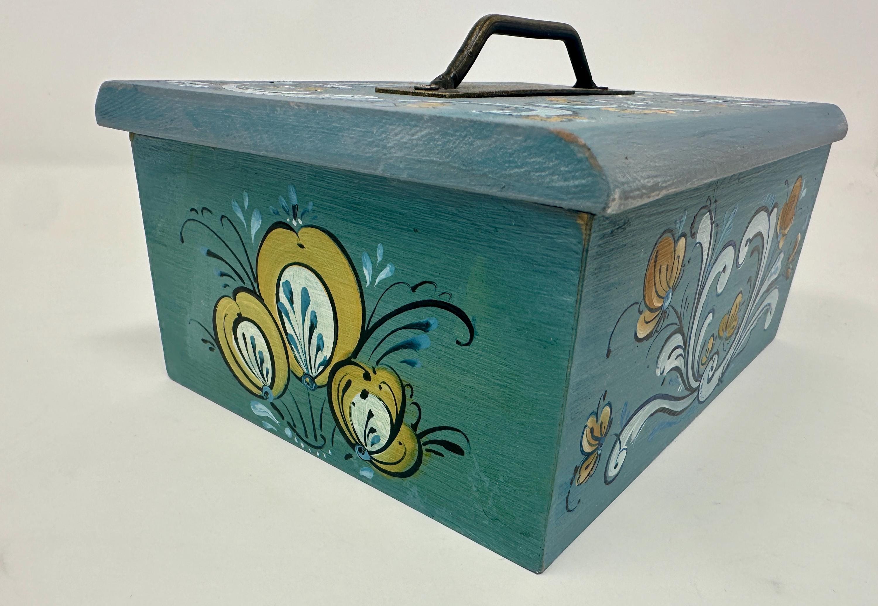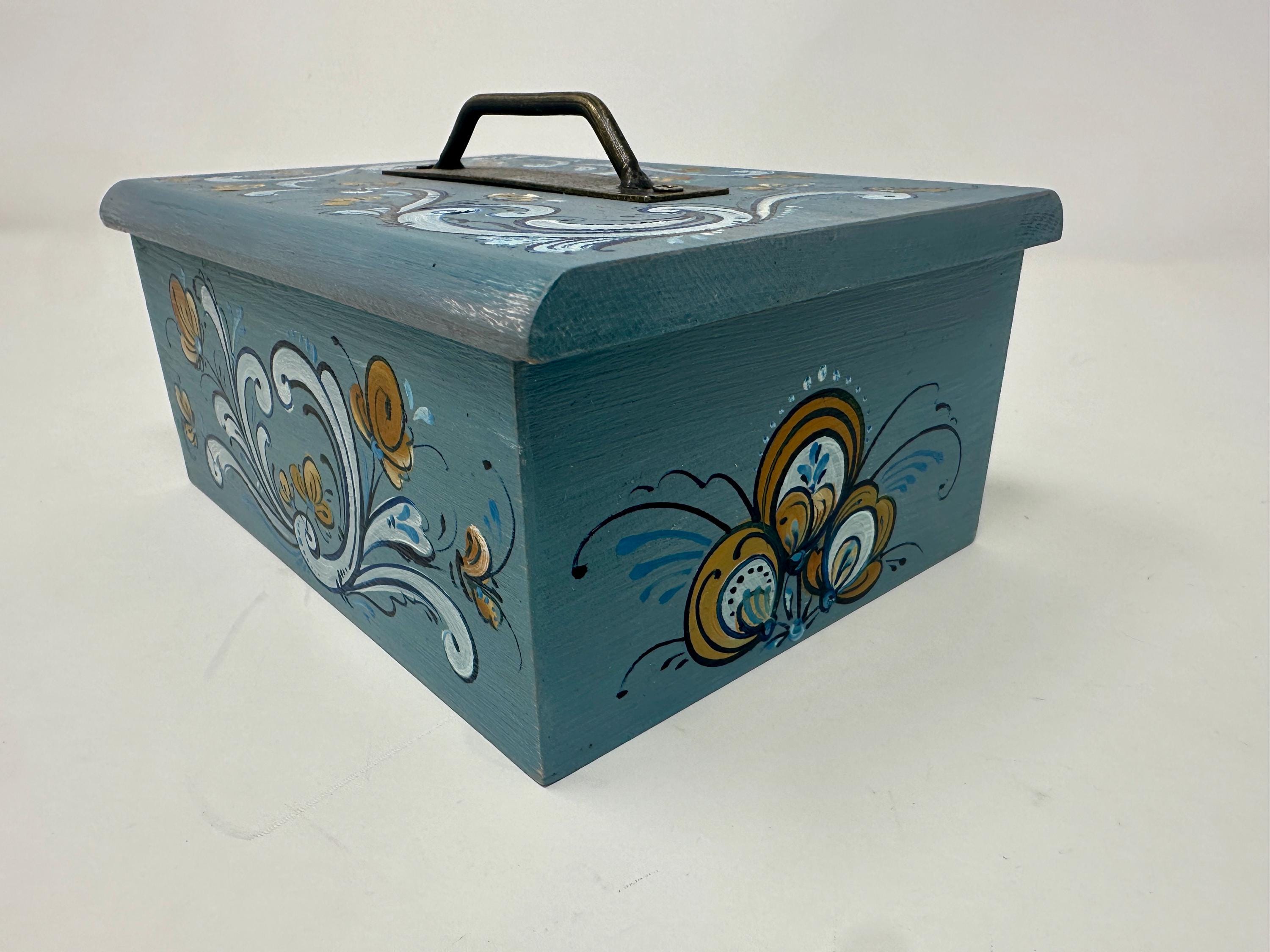 Small chest with hand painted traditional Os Rosemaling on vibrant red, or Telemark Blue.   Metal handle on lid that fits secure. Perfect for storing anything in an artistic and beautiful way~jewelry, money, jewelry, candy or special treasures.
