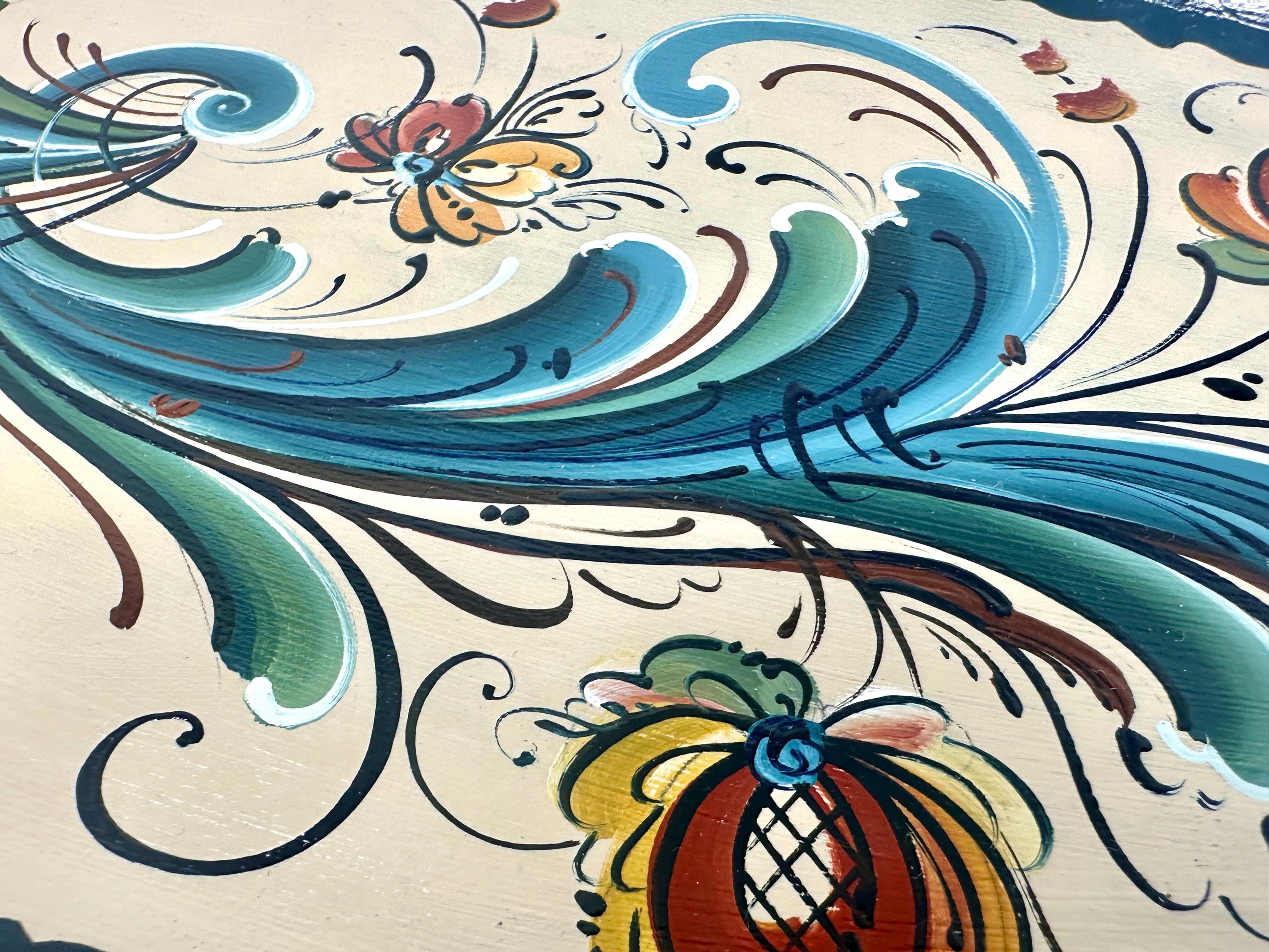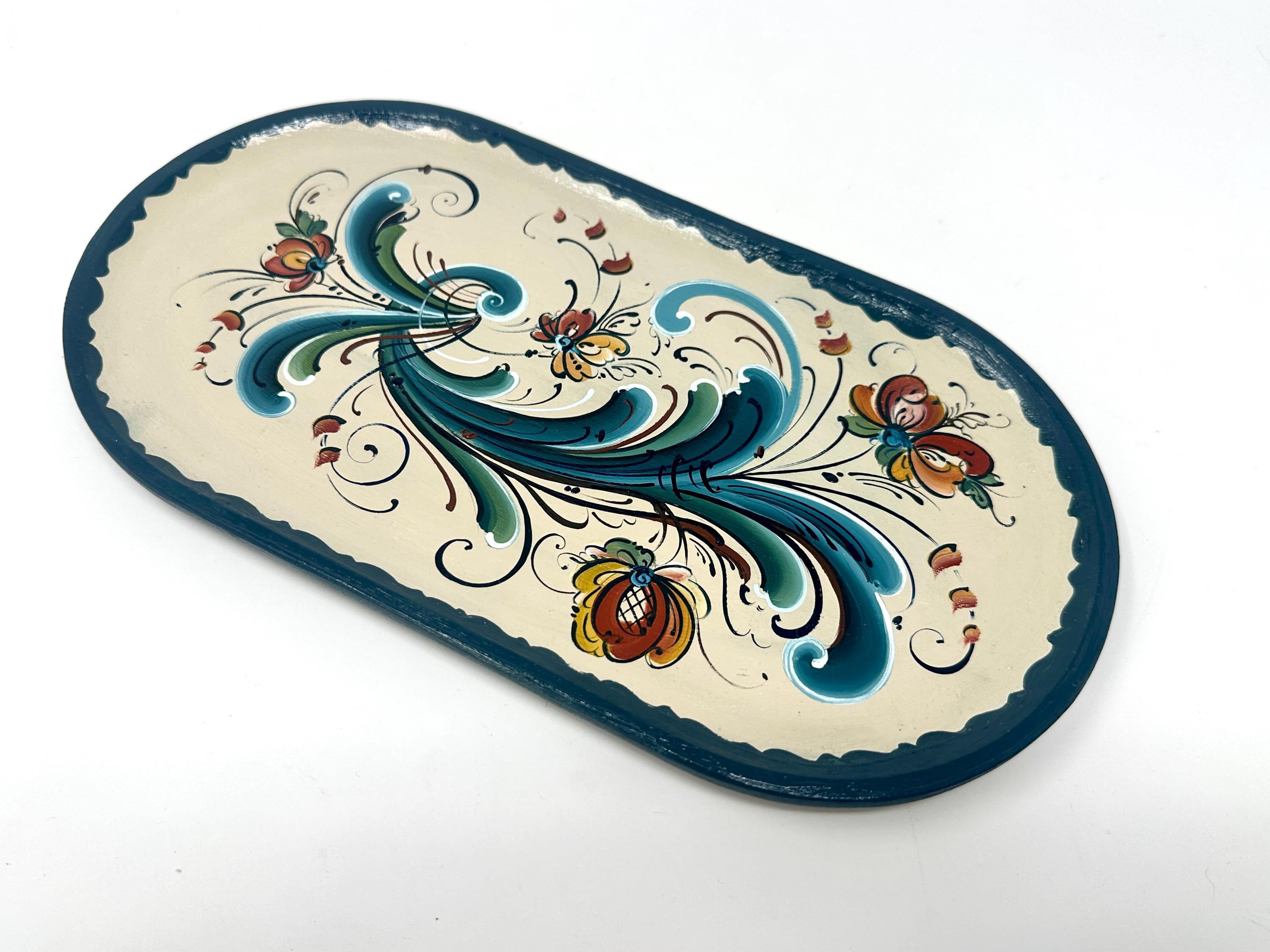 Birchwood tray with handpainted Telemark Rosemaling design. Functional for dry use such as cookies, breads, fruit or crackers, or rings, jewelry, and other trinkets.