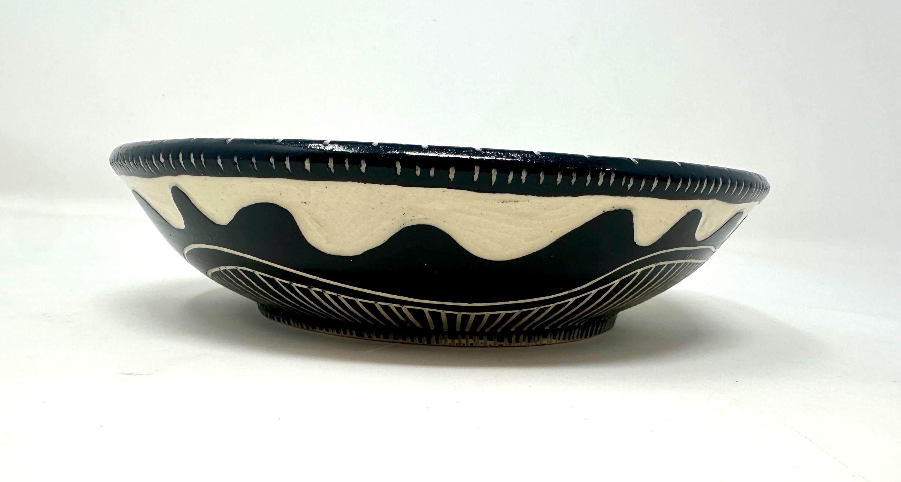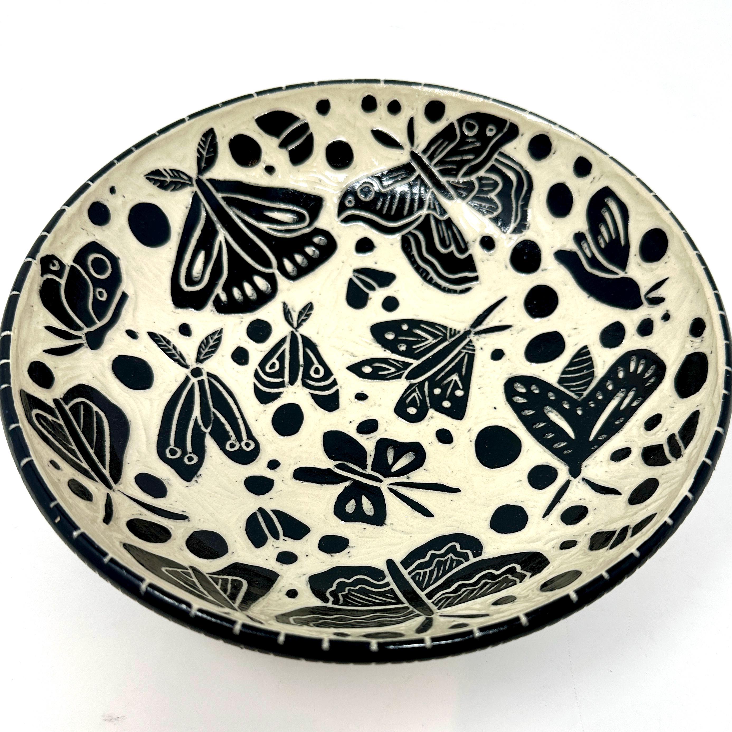 Hand carved bowl with flying moths, and a decorative base. Wheel thrown stoneware functional for daily use.