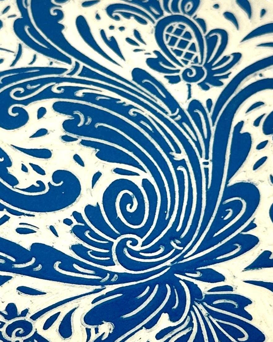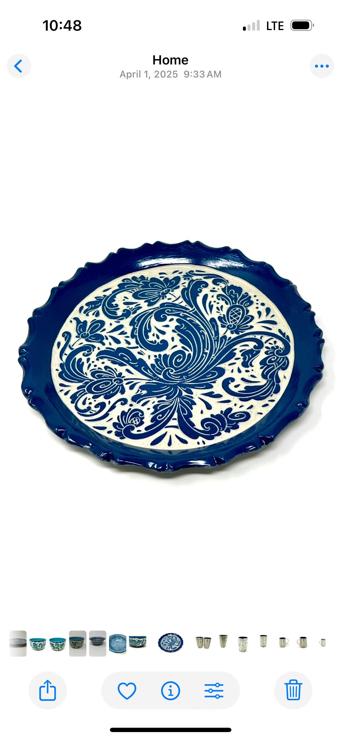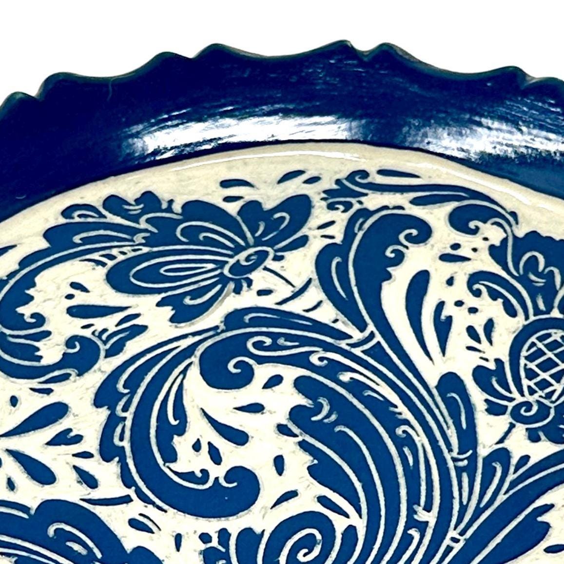 Hand carved plate with Rosemaling, a decorative edge and built in hanger for display. Wheel thrown stoneware functional for daily use or as a wall hanging.