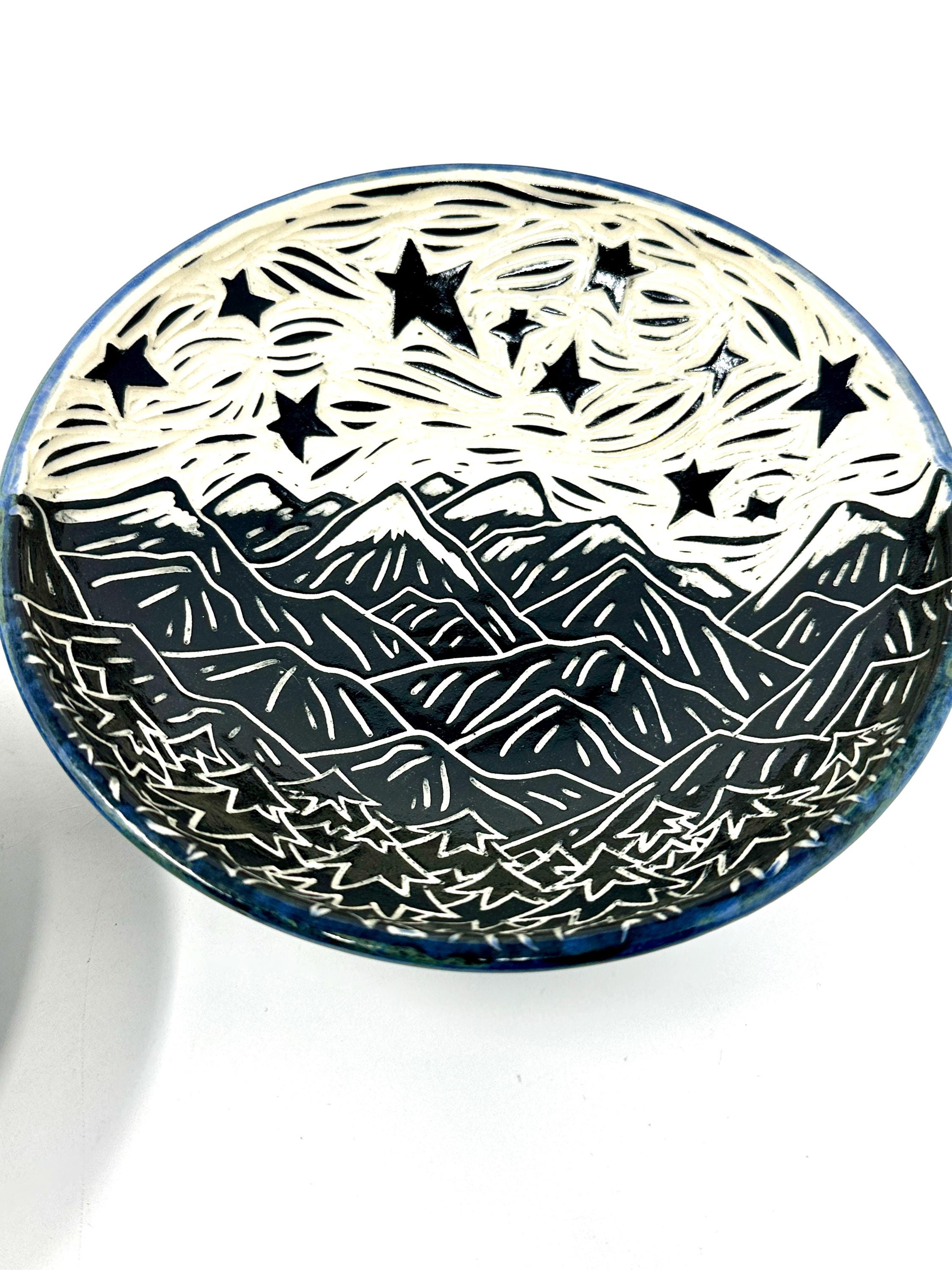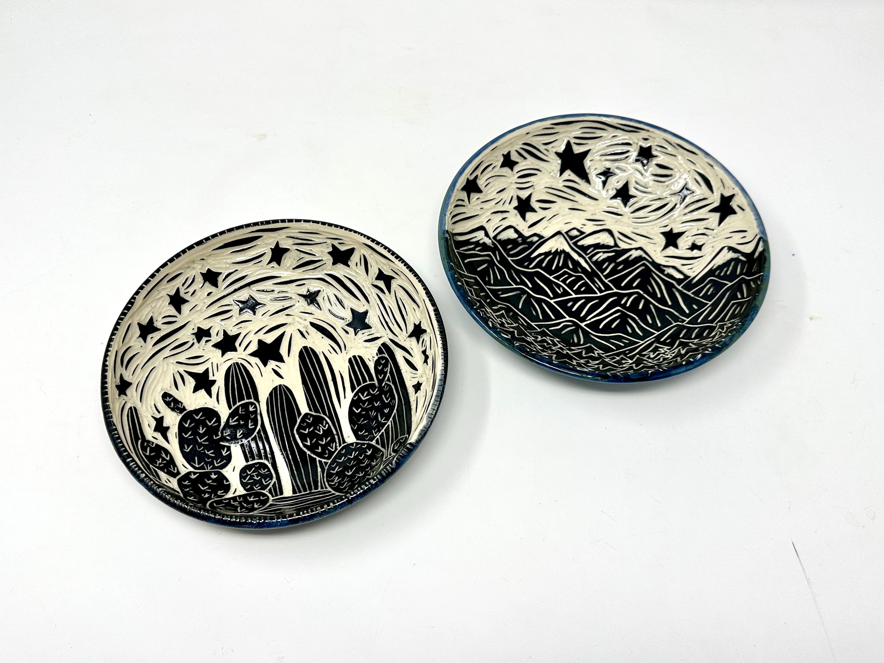 Stoneware shallow bowls with slip carved mountain and desert landscapes.