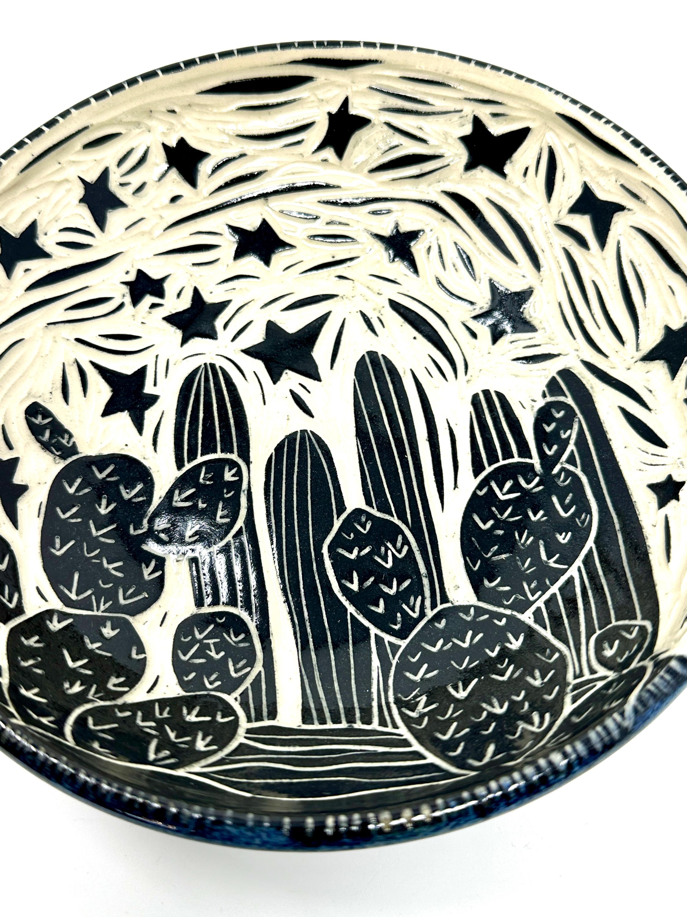 These bowls are wheel thrown with hand carvings of a mountain landscape and cactus scene.