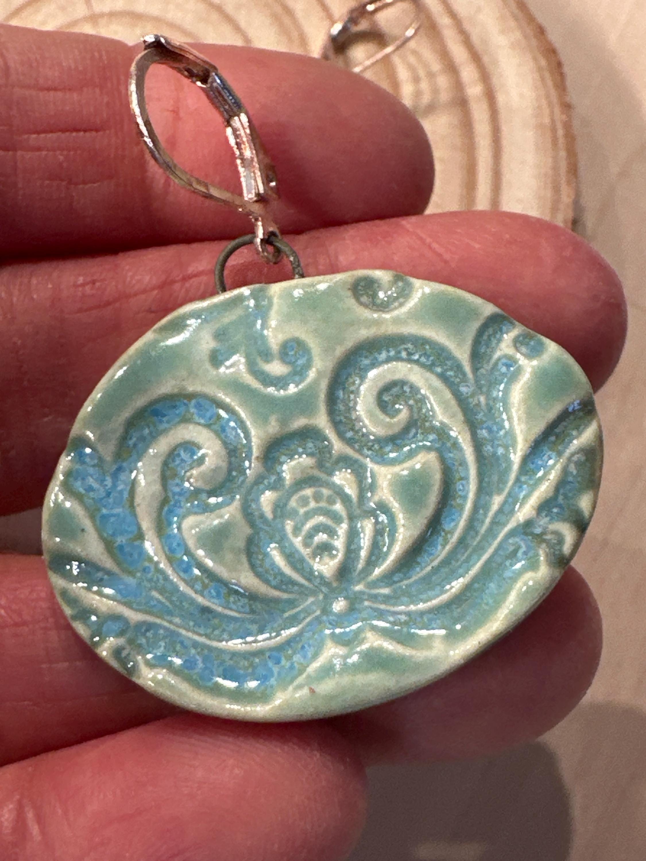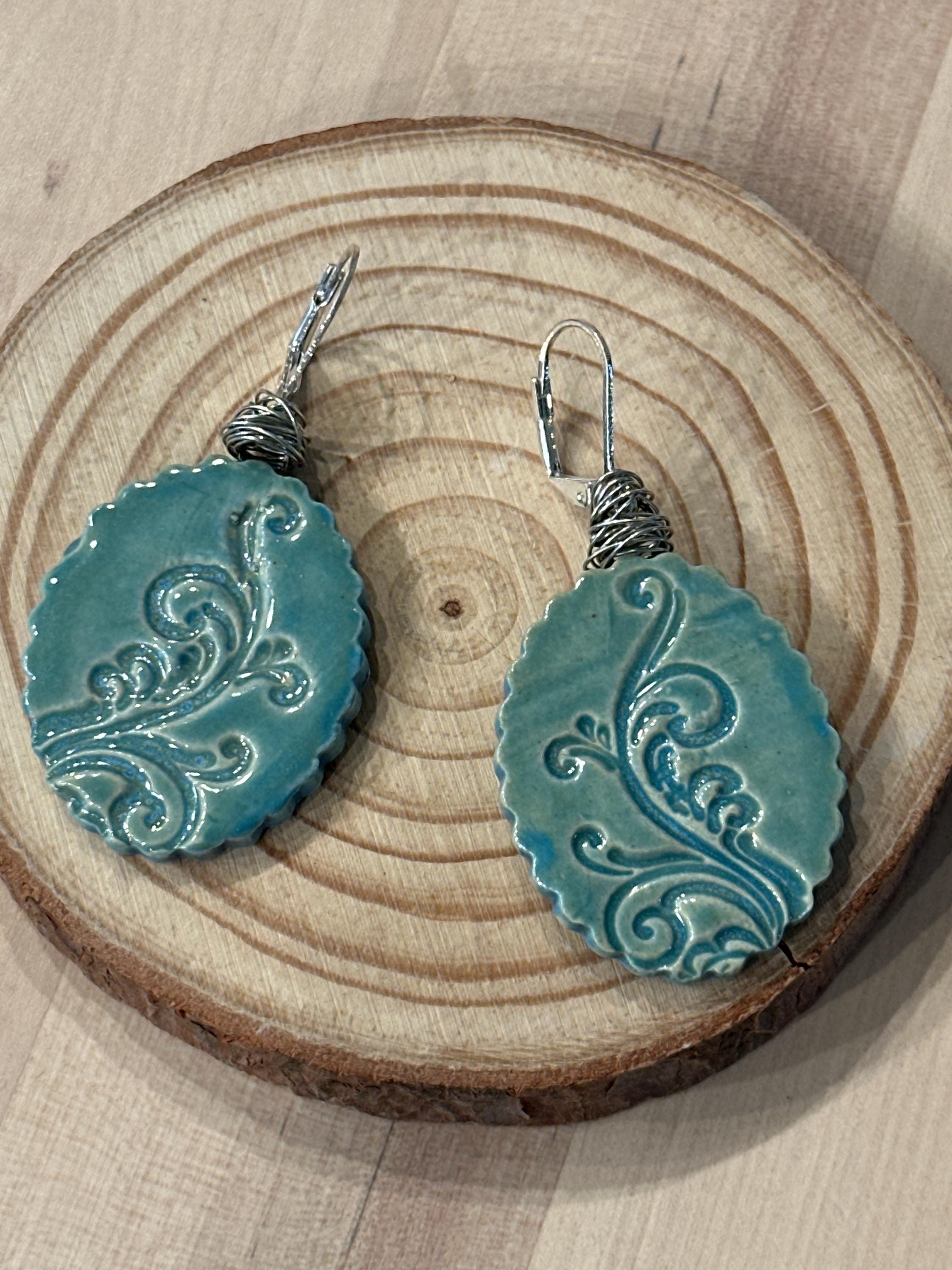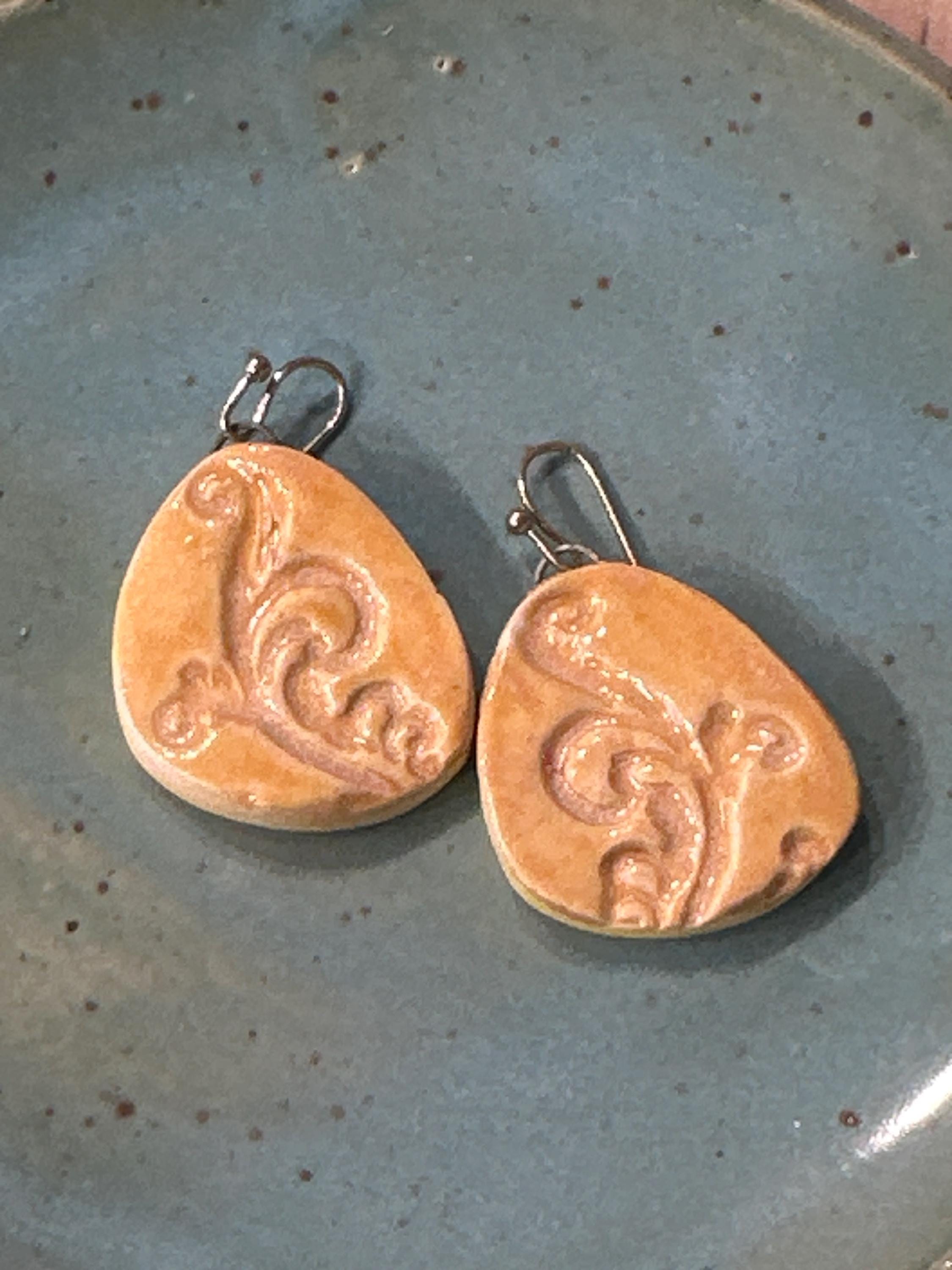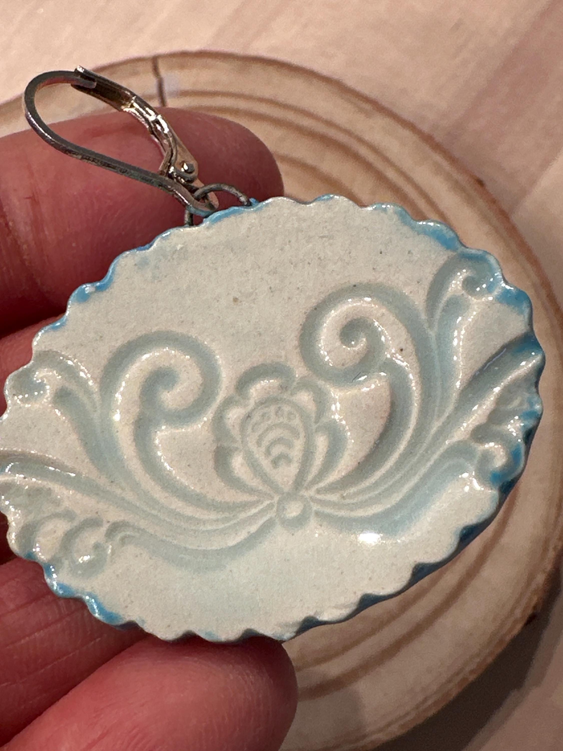 Handmade ceramic earrings. Each pair of earrings is handmade and unique, handpainted, Sgraffito carved, or stamped. They are delicate, simple but have a nice weight to them.