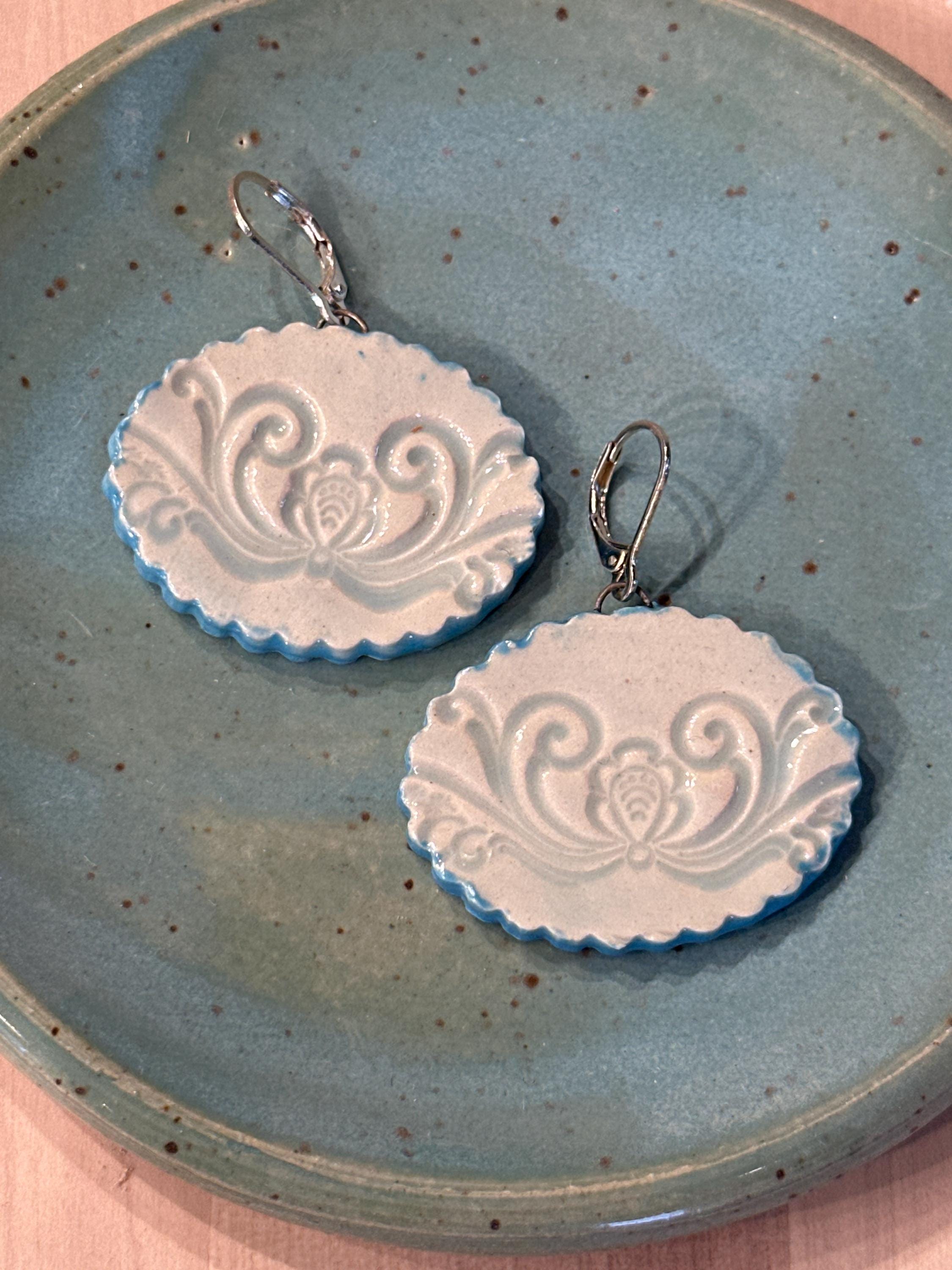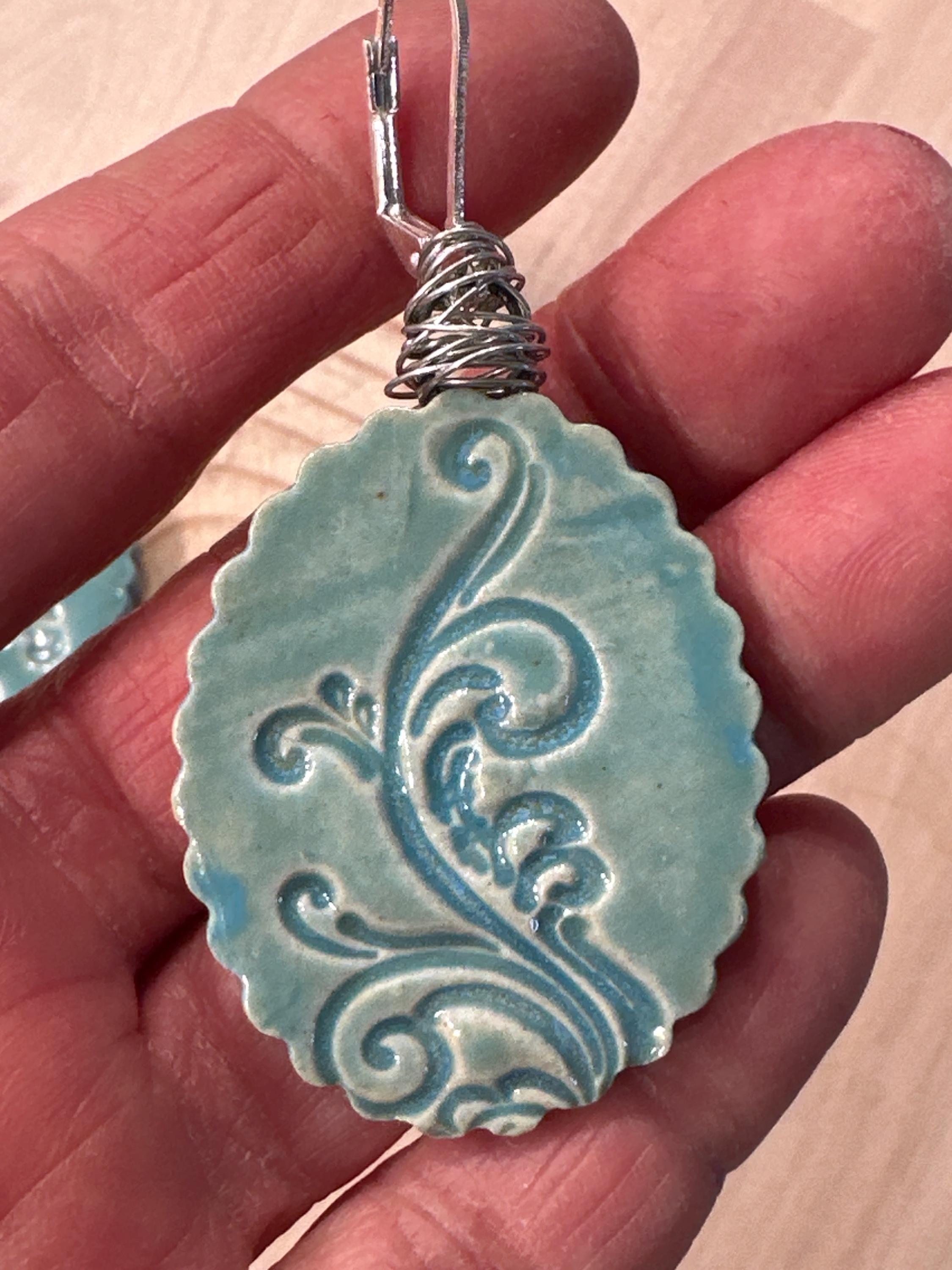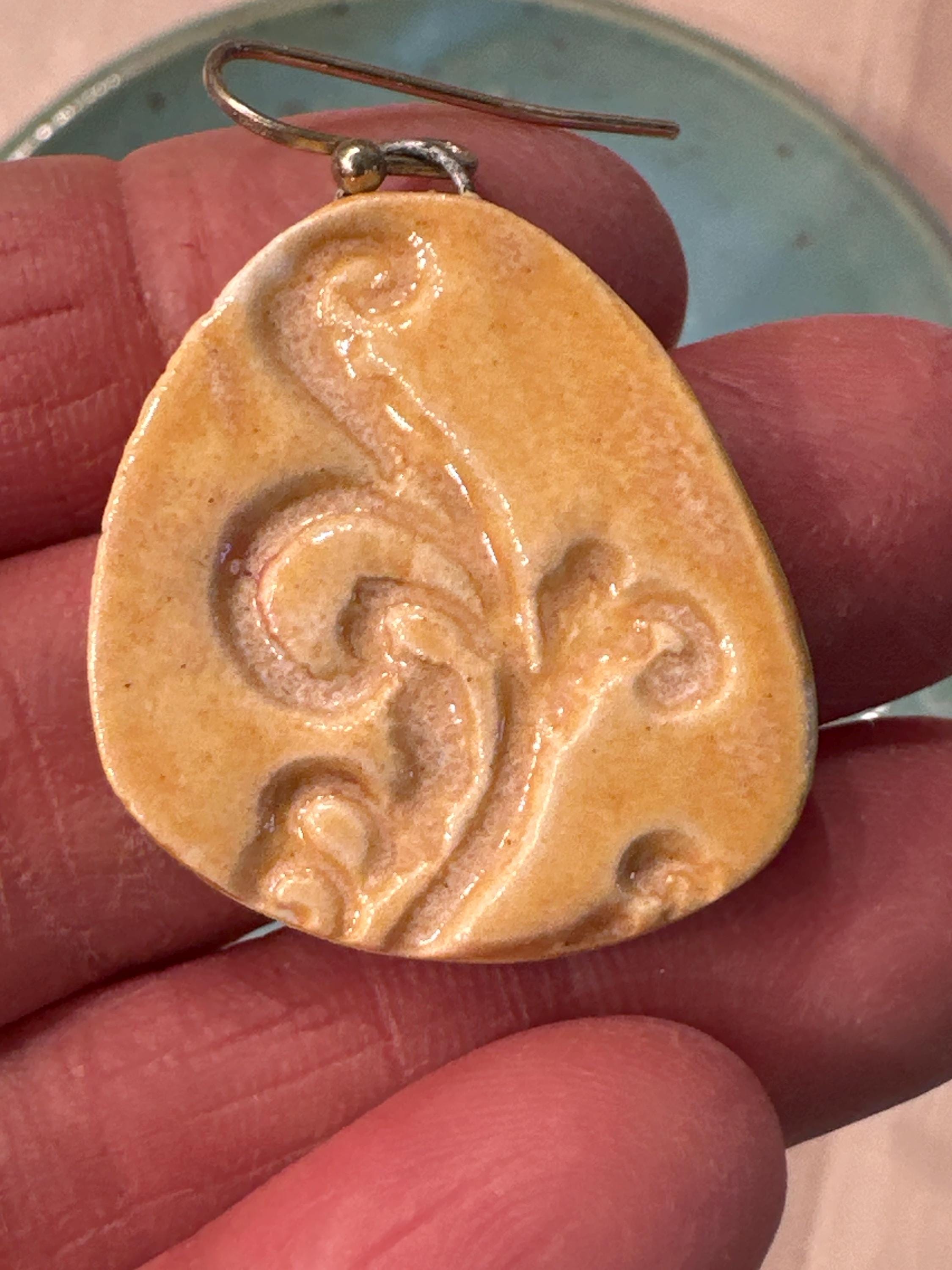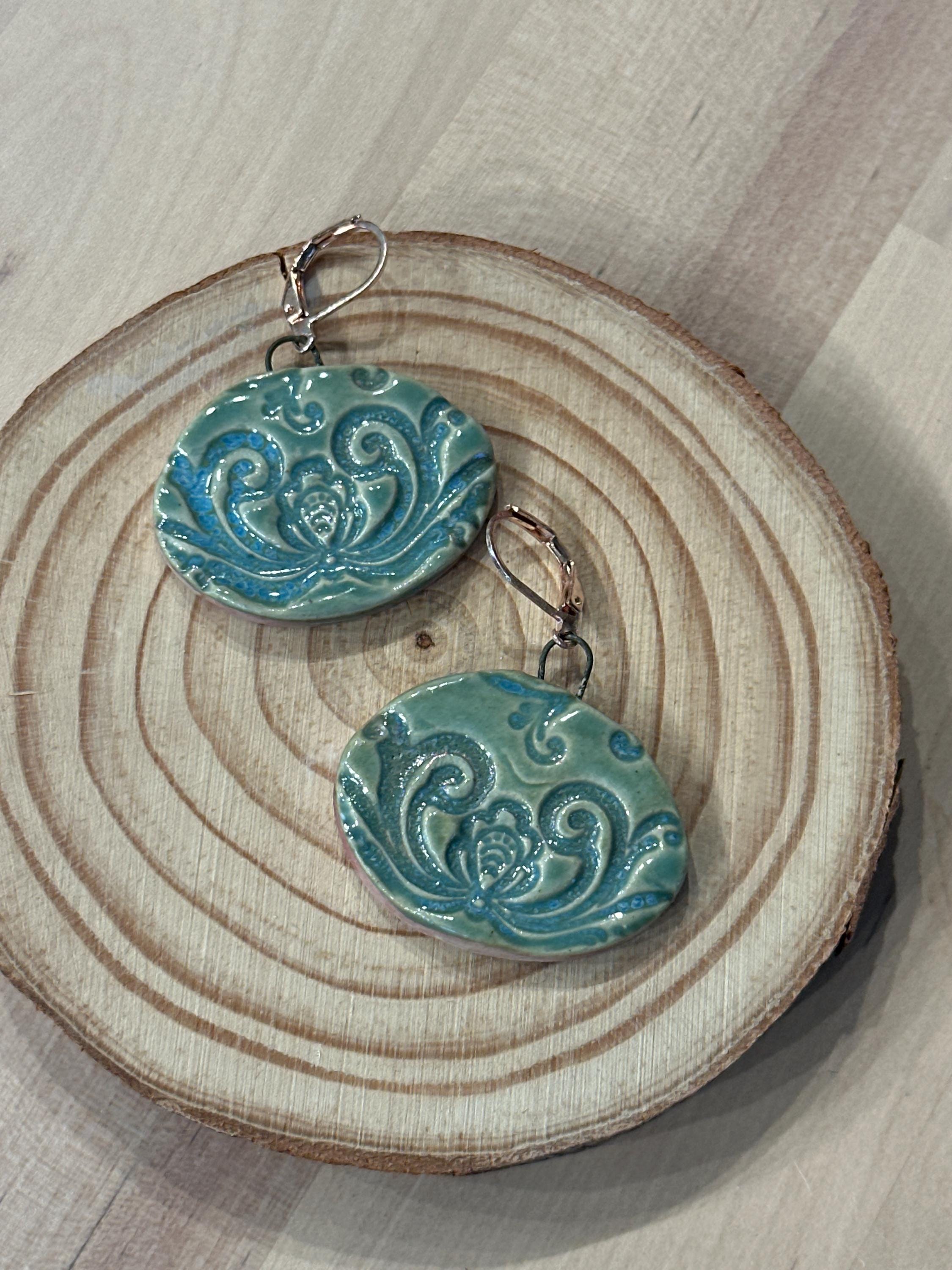 Handmade ceramic earrings. Each pair of earrings is handmade and unique, handpainted, Sgraffito carved, or stamped. They are delicate, simple but have a nice weight to them.