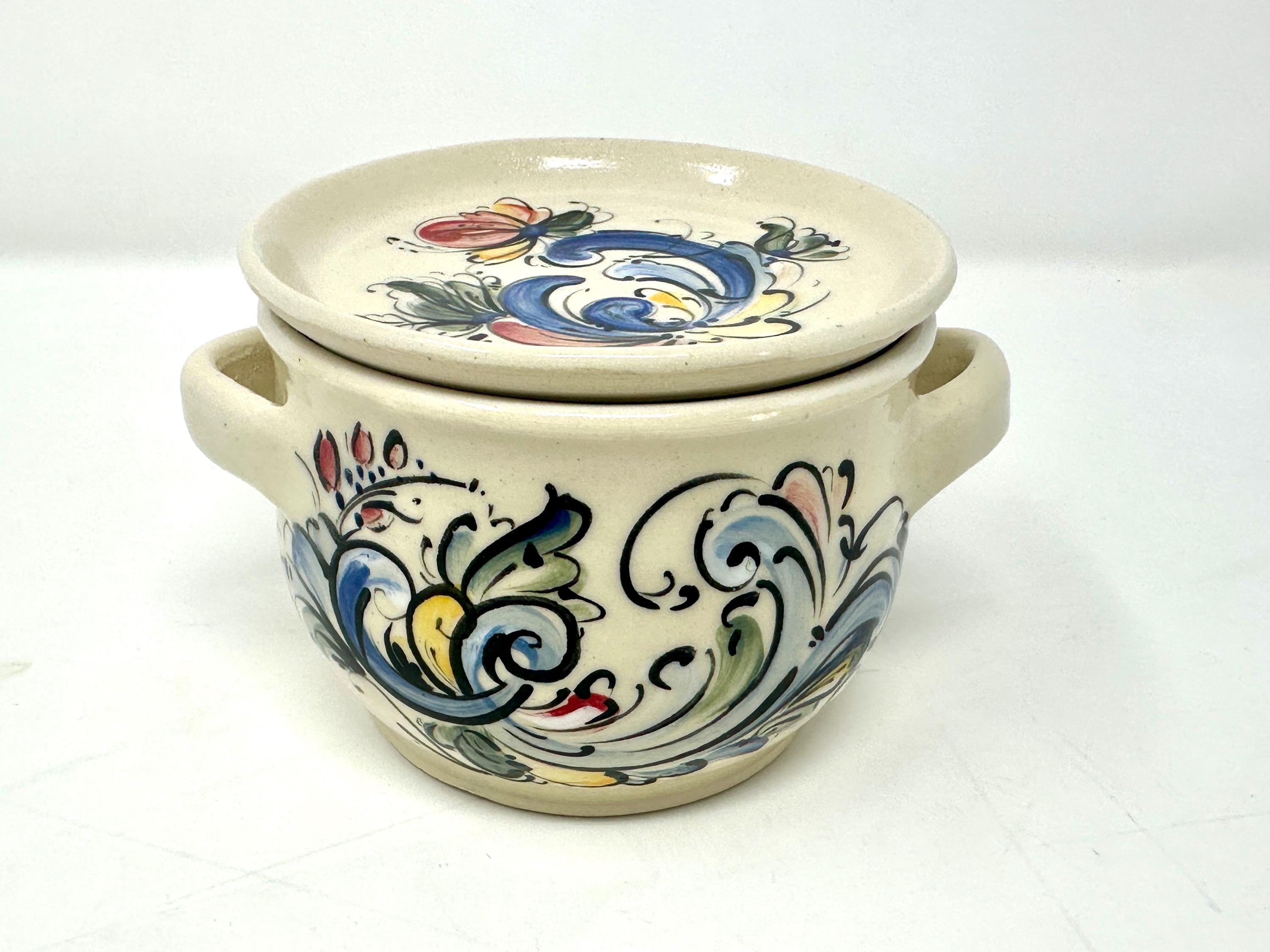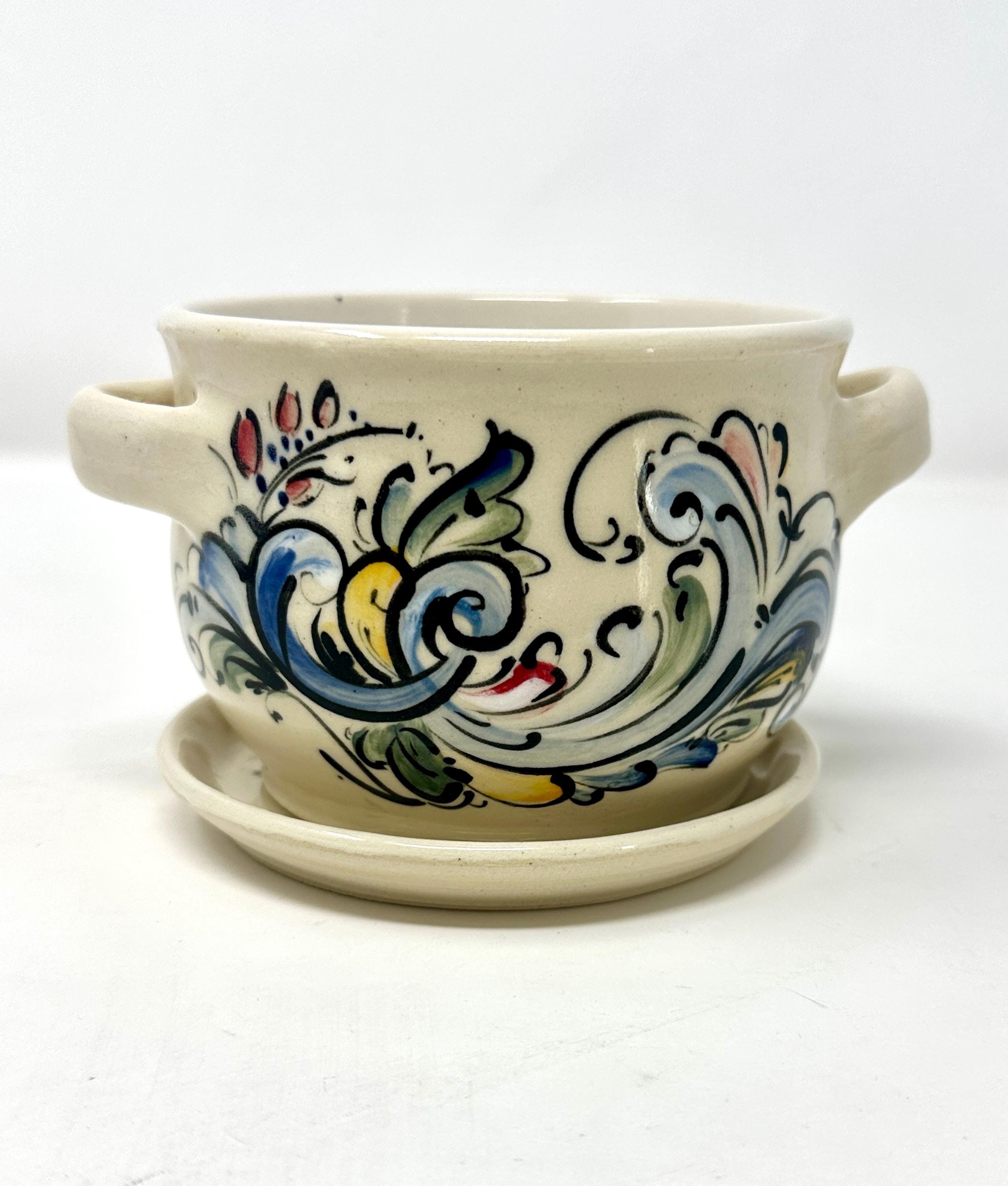 Wheel thrown handpainted Rosemaling cup with white interior. Telemark Rosemaling decorated in the round in blue and green scrolls and red, yellow, white and green flowers. Nice size for a latte, soup, cereal or steeping tea with a lid and base for the tea bag.