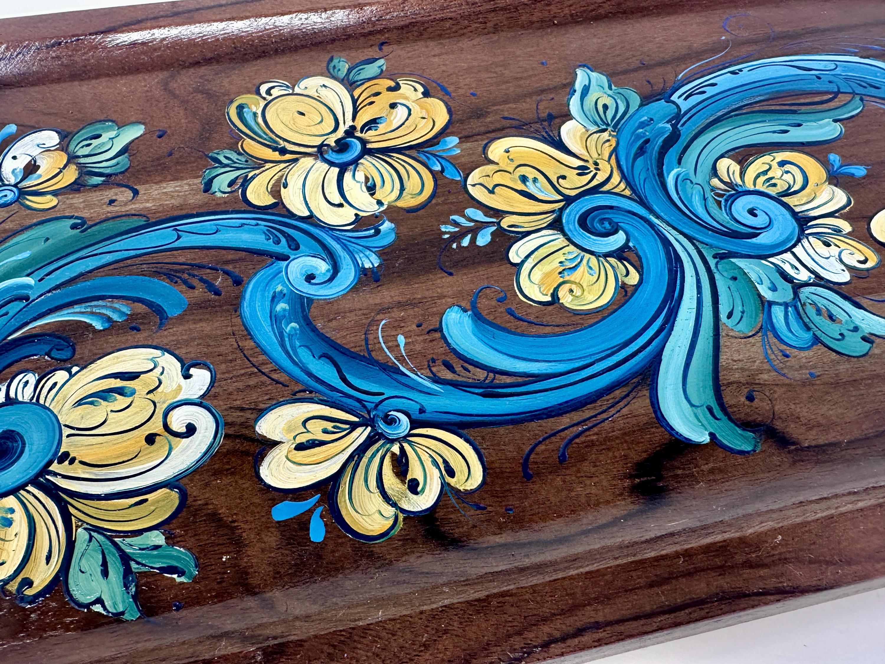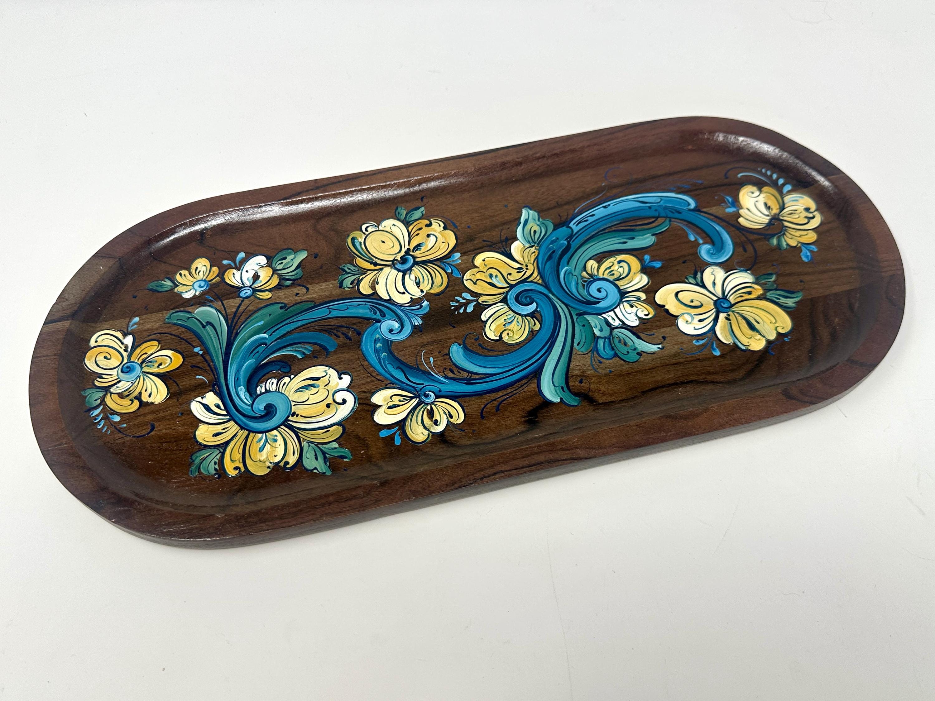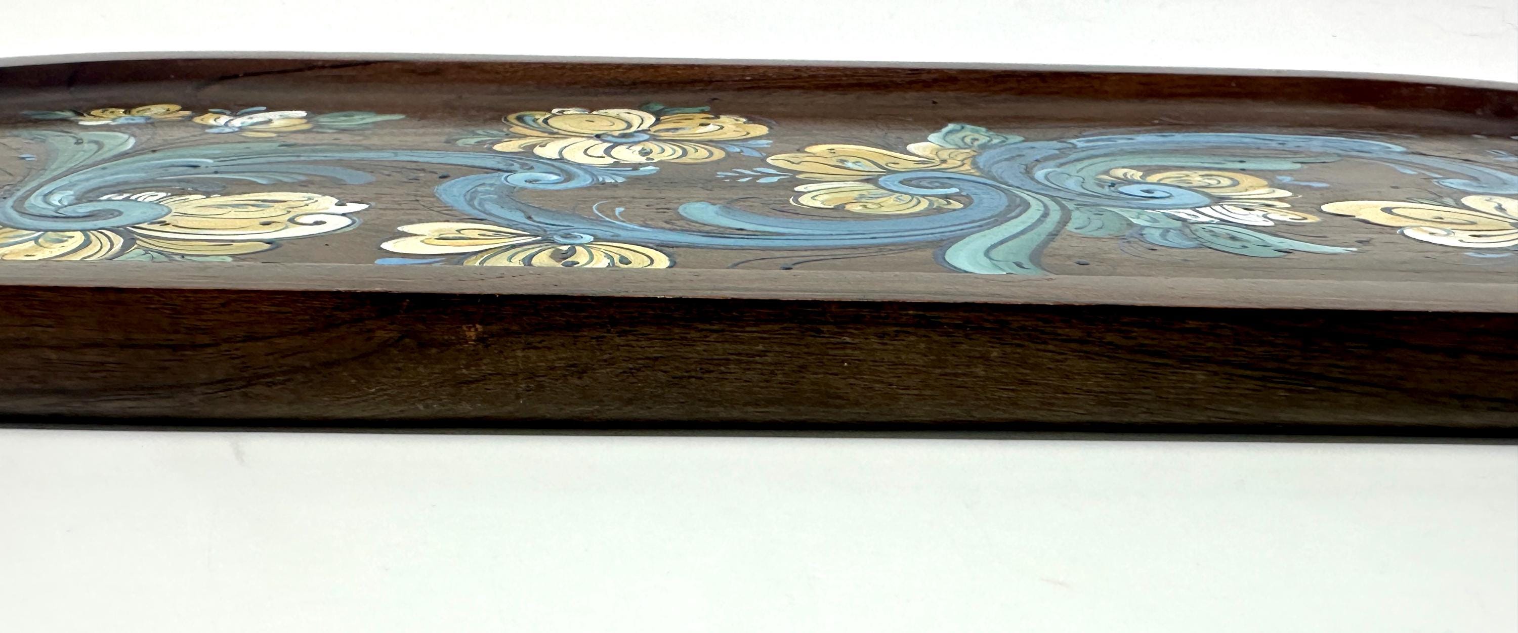 Dark wooden tray with handpainted Telemark Rosemaling design. Functional for dry use such as cookies, breads, fruit or crackers, or rings, jewelry, and other trinkets. Clean with damp cloth, do not use knife as a cutting board.