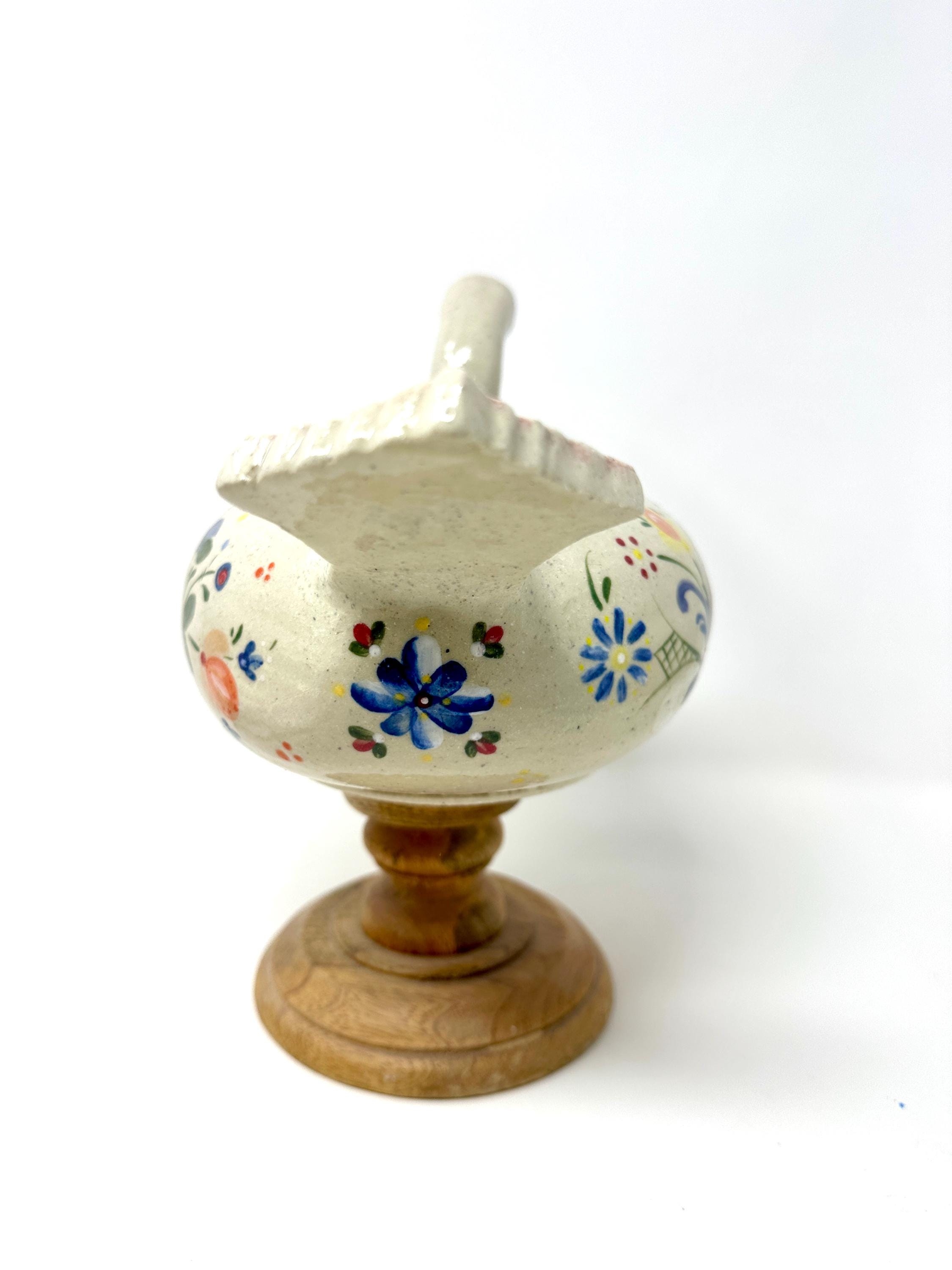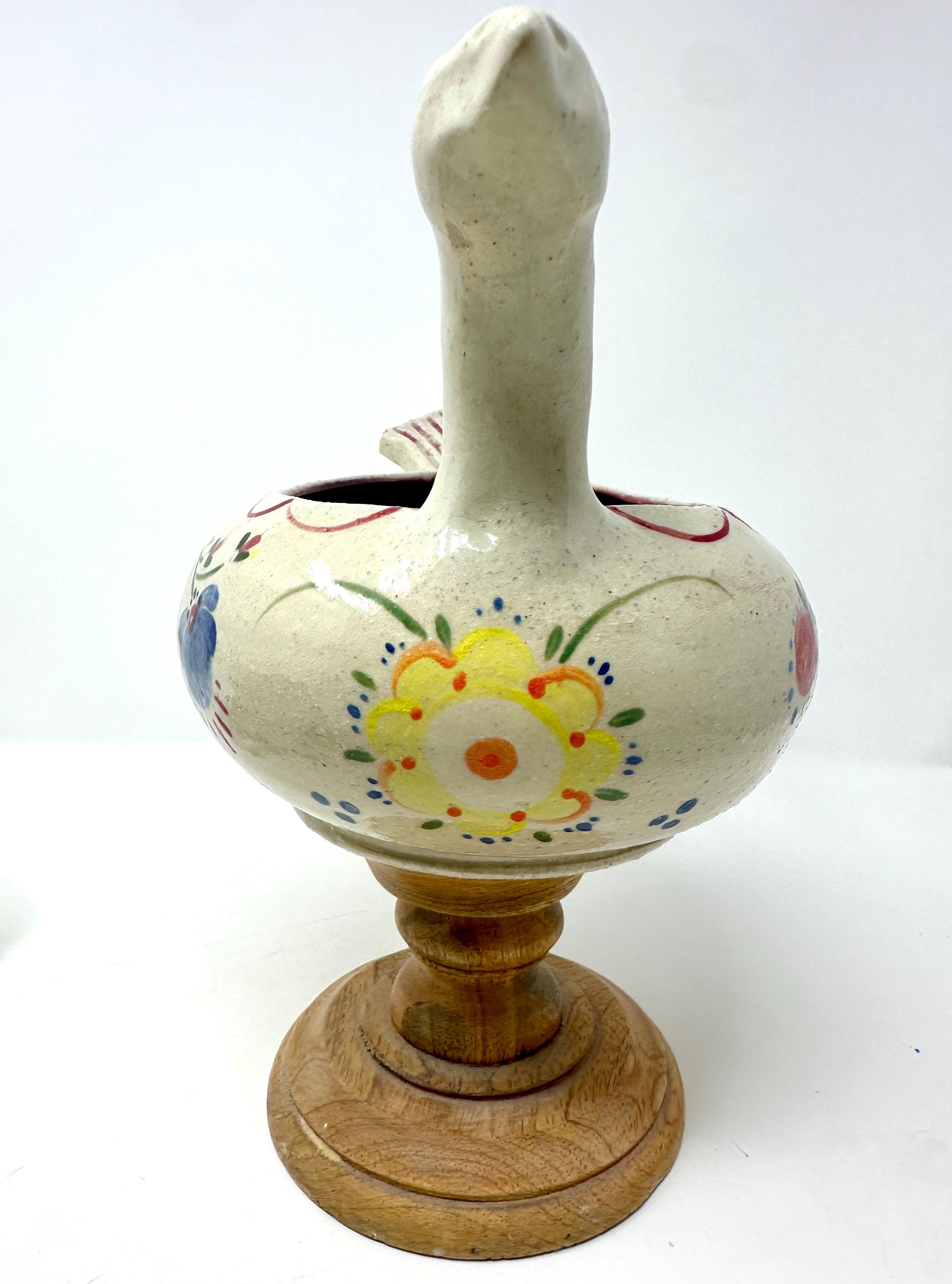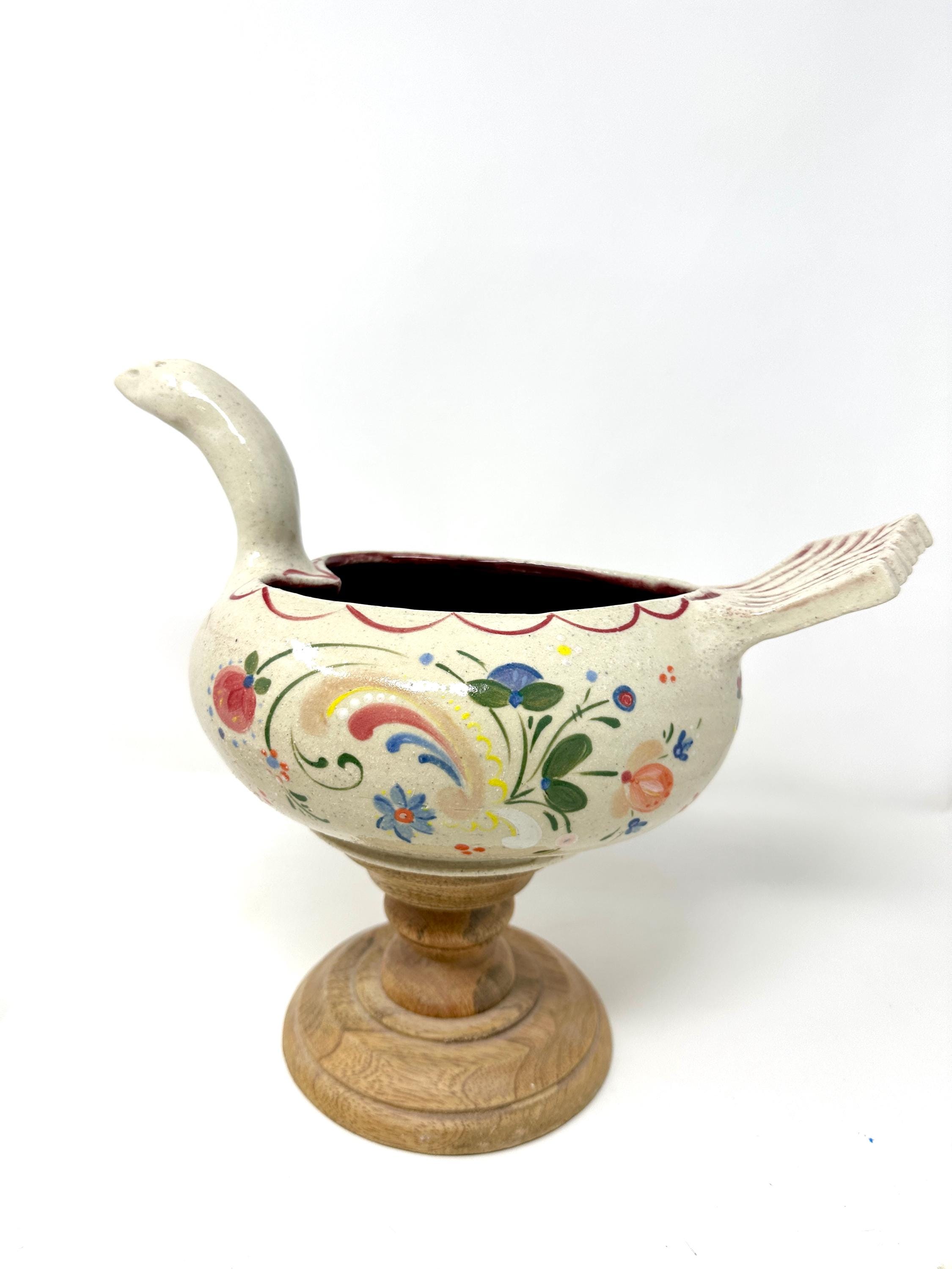Ceramic goose ale bowl. Traditional Scandinavian ale bowls were made of wood, but I make mine out of clay! This bowl is wheel thrown with stoneware clay, with handbuilt head and tail. The bowl is handpainted with Os Rosemaling, the heart interior is based on an ale bowl from the Vesterheim collection. This and all my pottery is food safe and functional.
