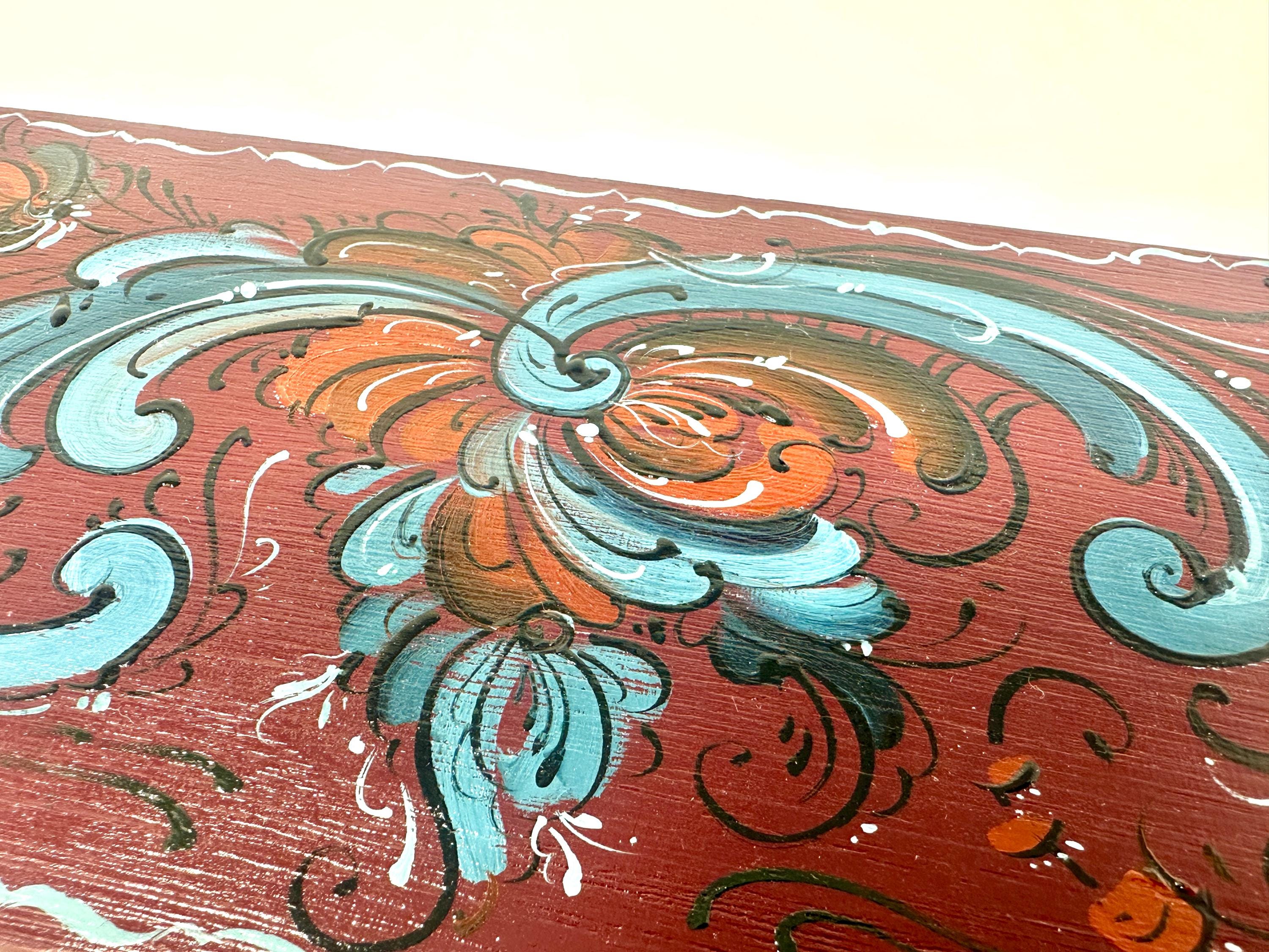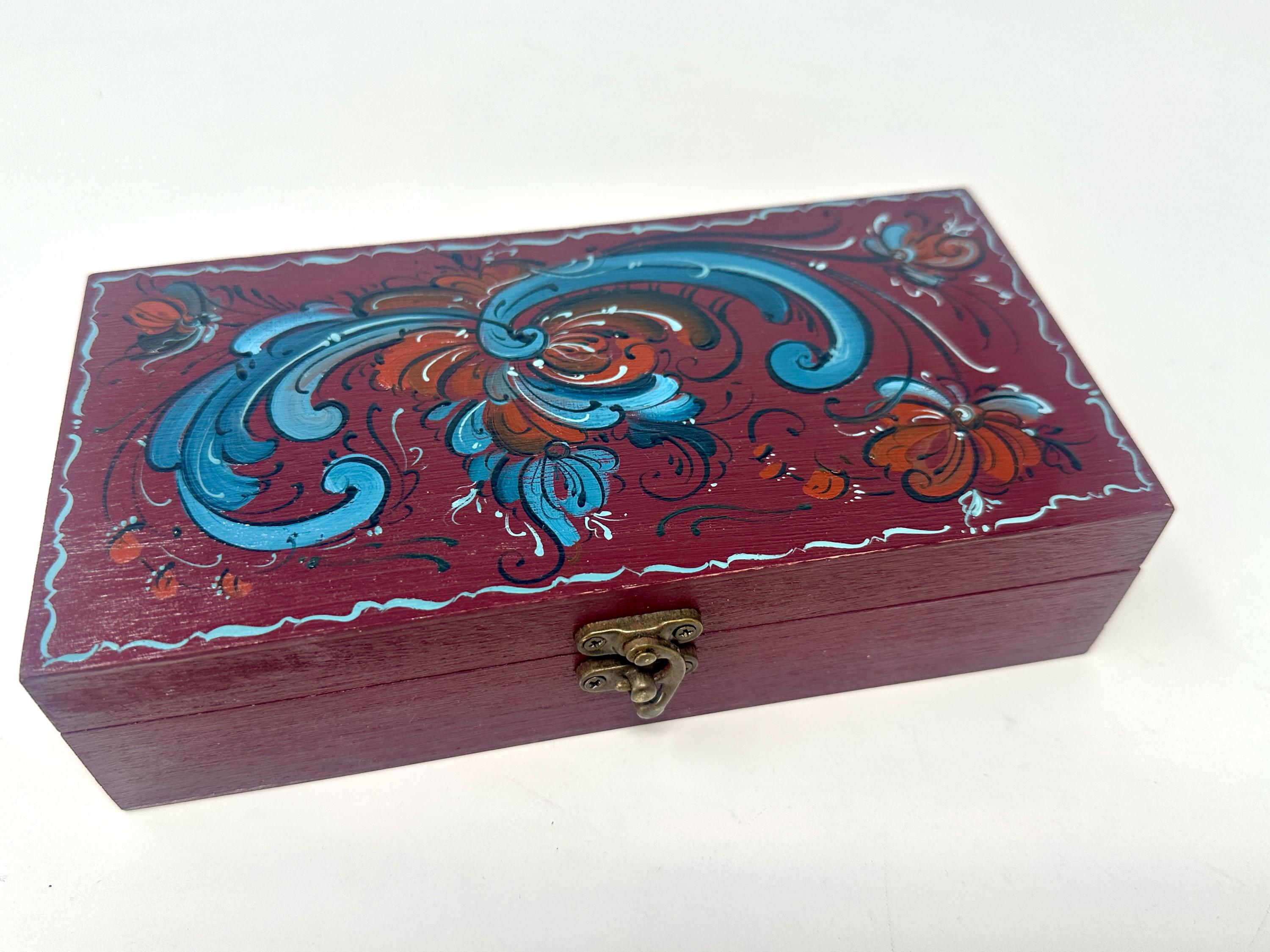 Hand Painted Telemark Rosemaling, oil on wood, sealed with shellac to protect against use.