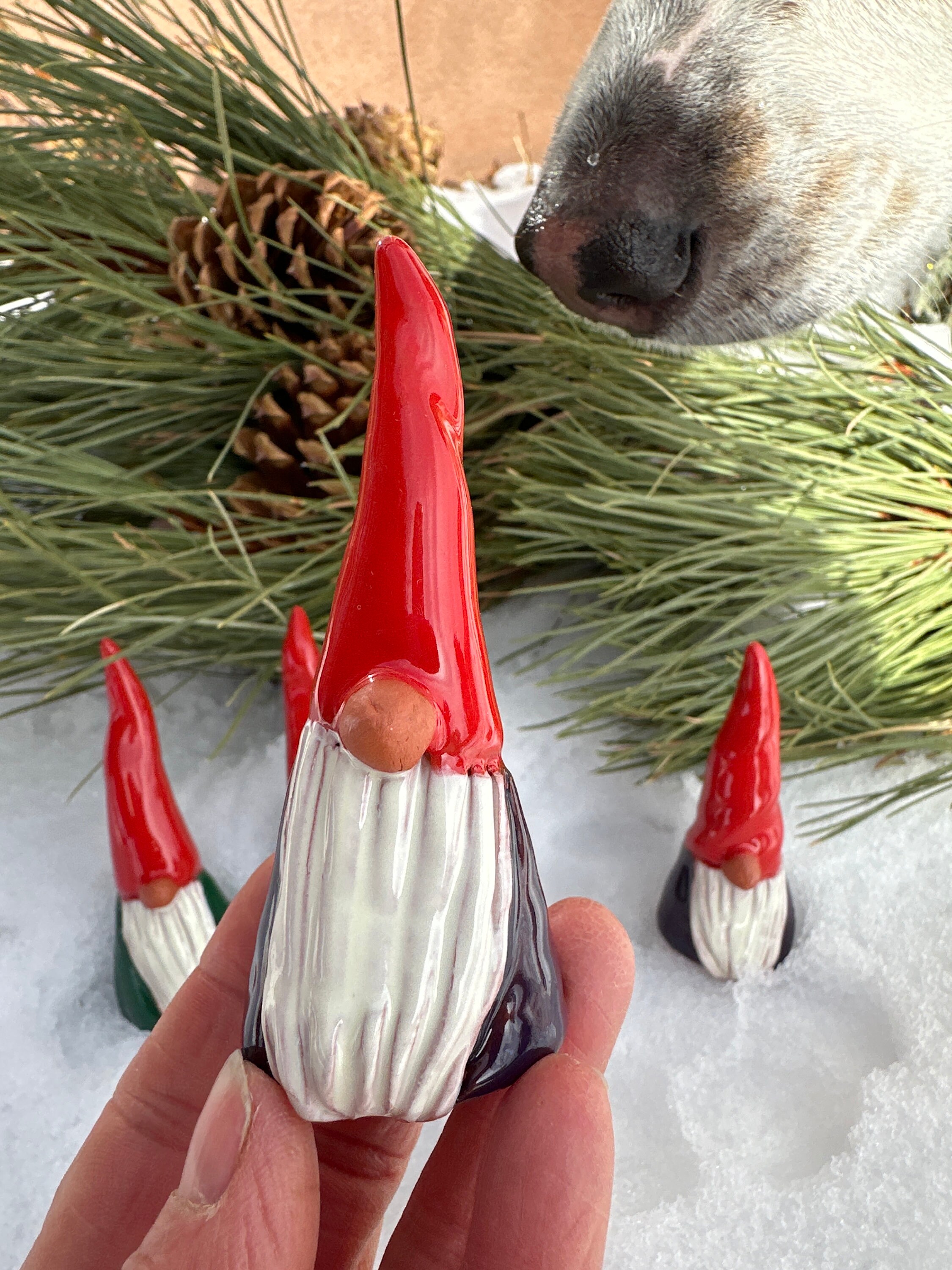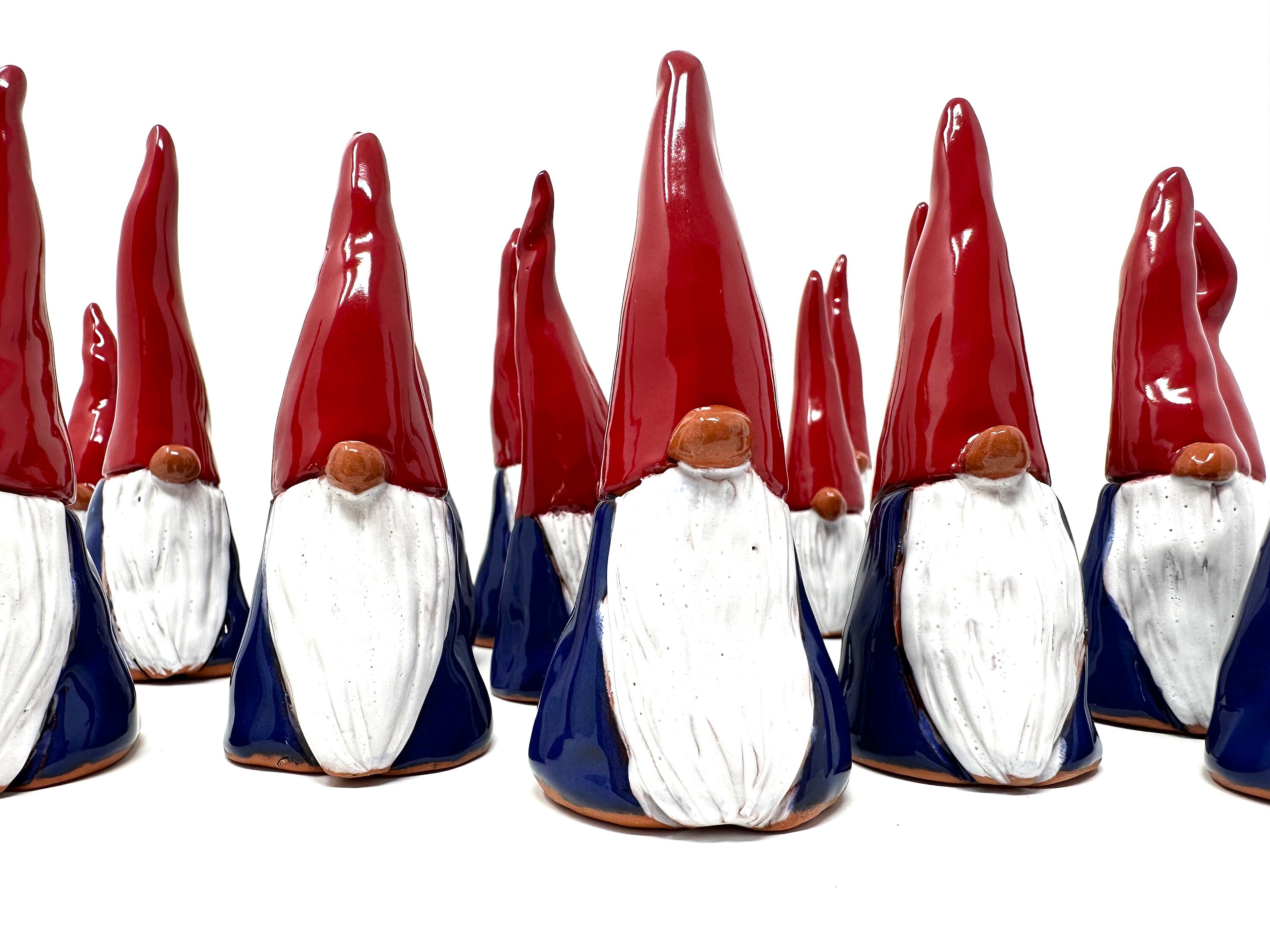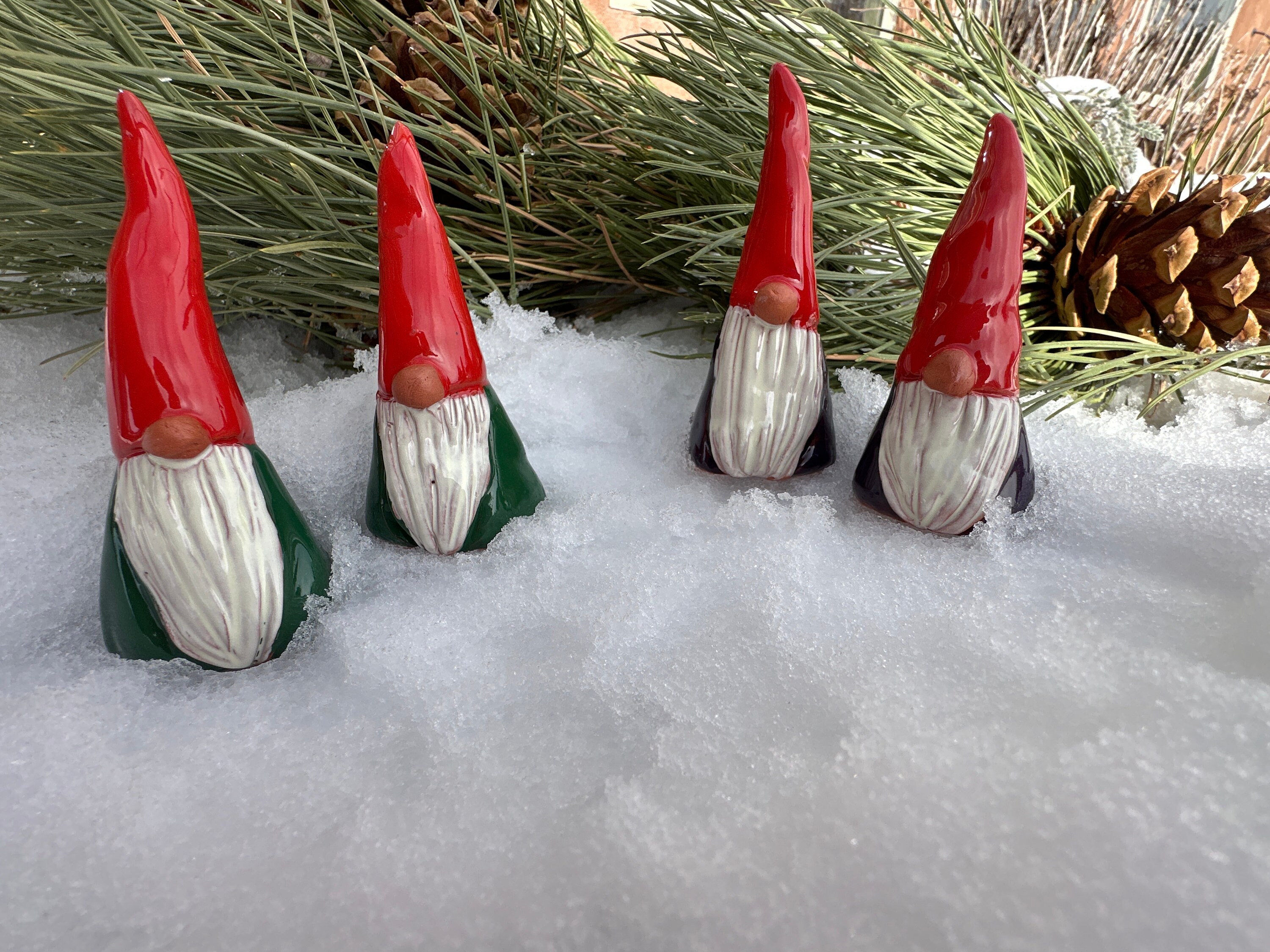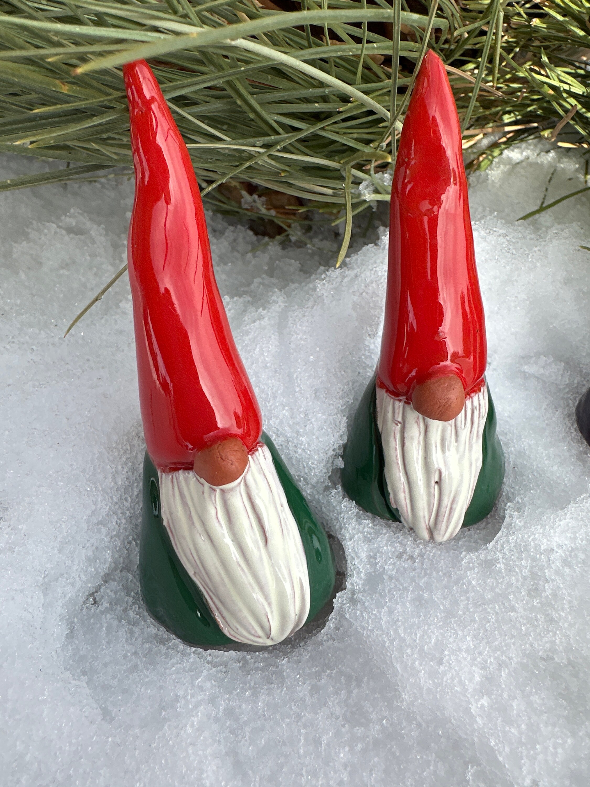 Hand made clay Scandinavian Nisse and Tomte. In Scandinavian folklore, Norwegian Nisse and Swedish Tomte are domestic elves who traditionally took care of livestock and the barn........they now look after our home and pets.