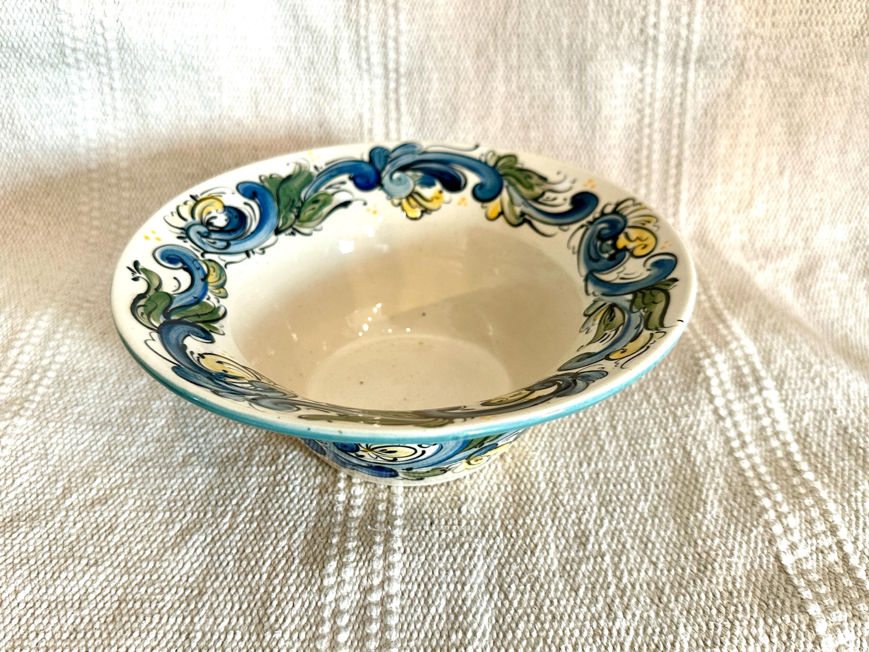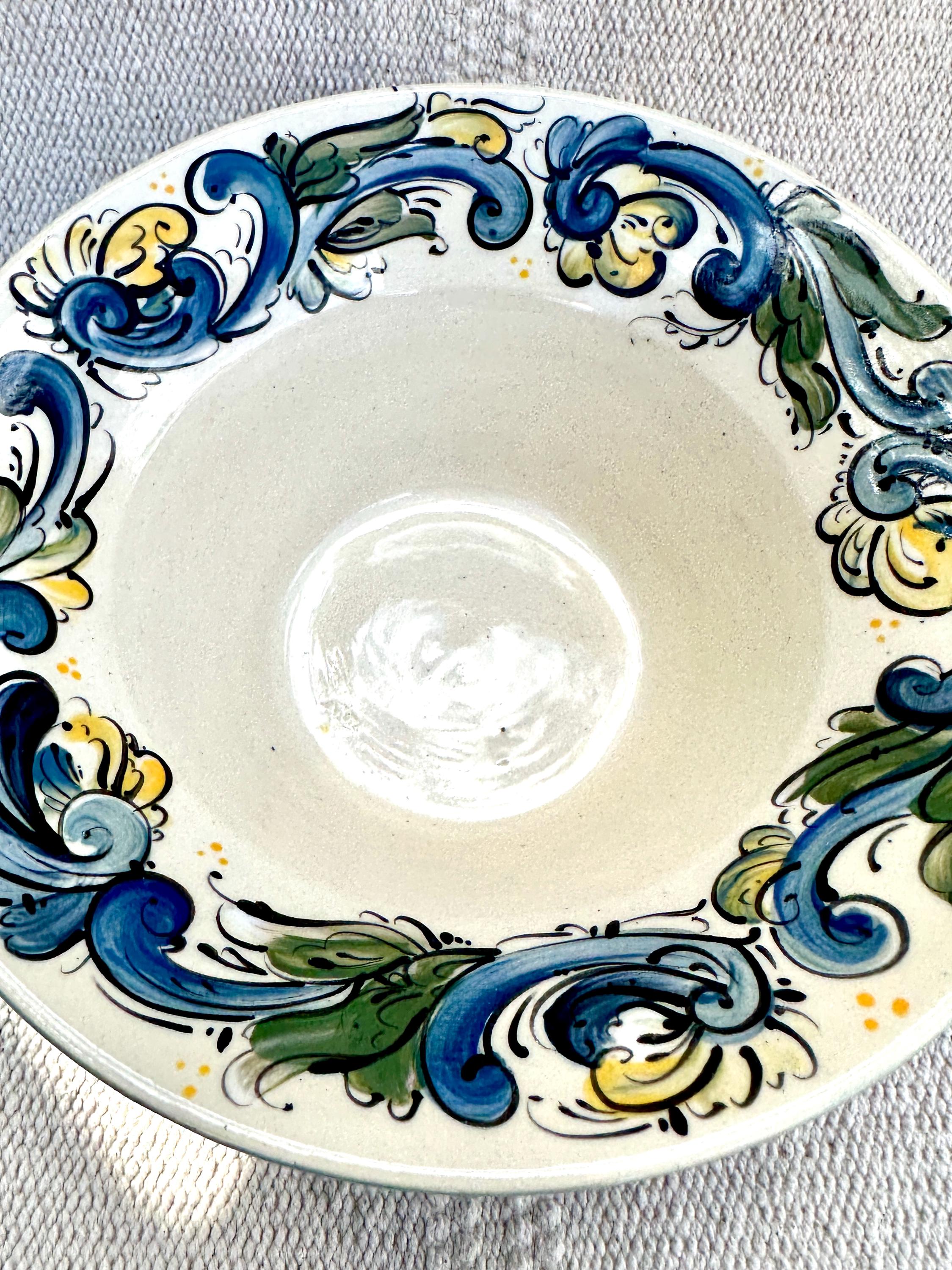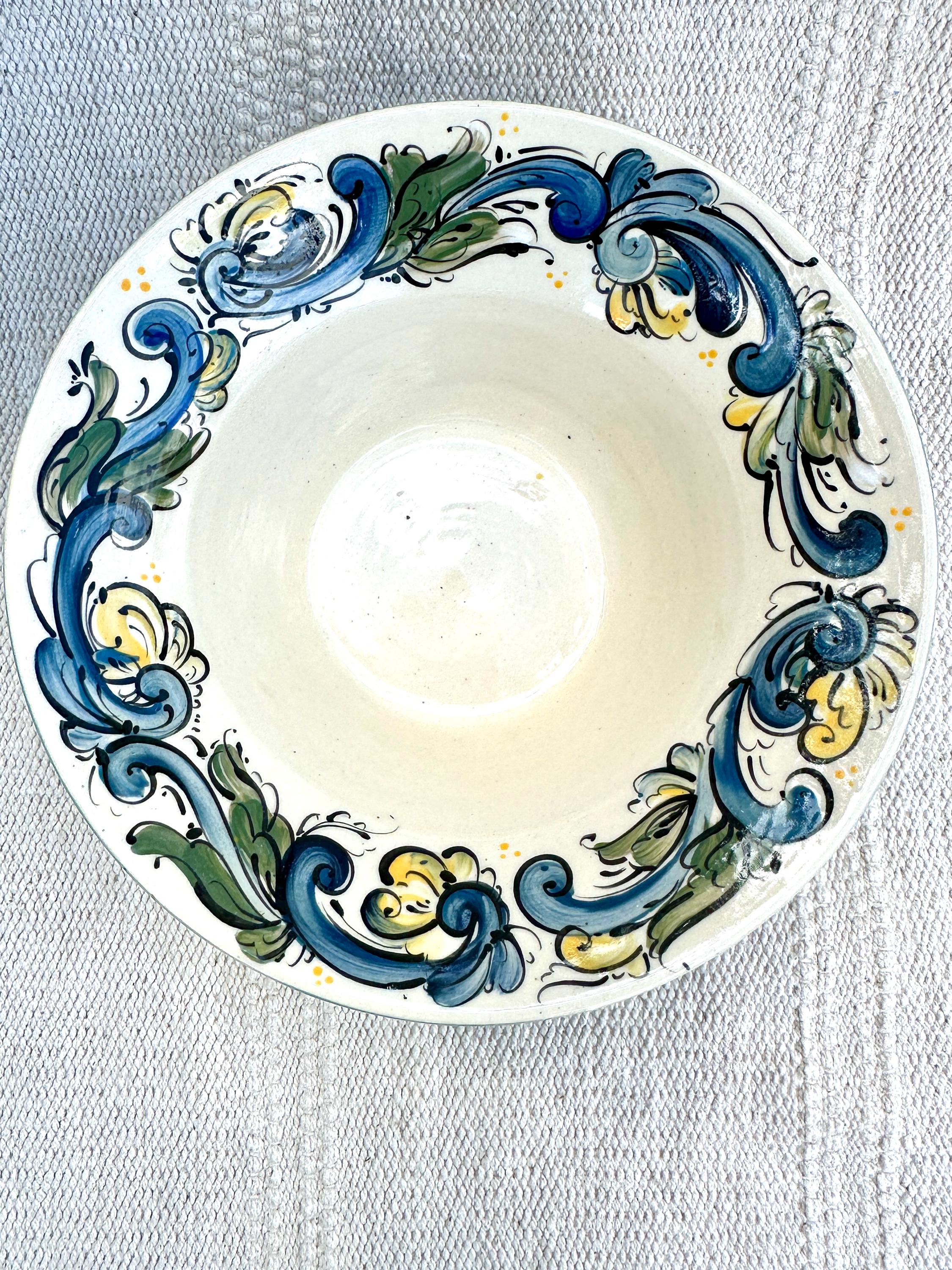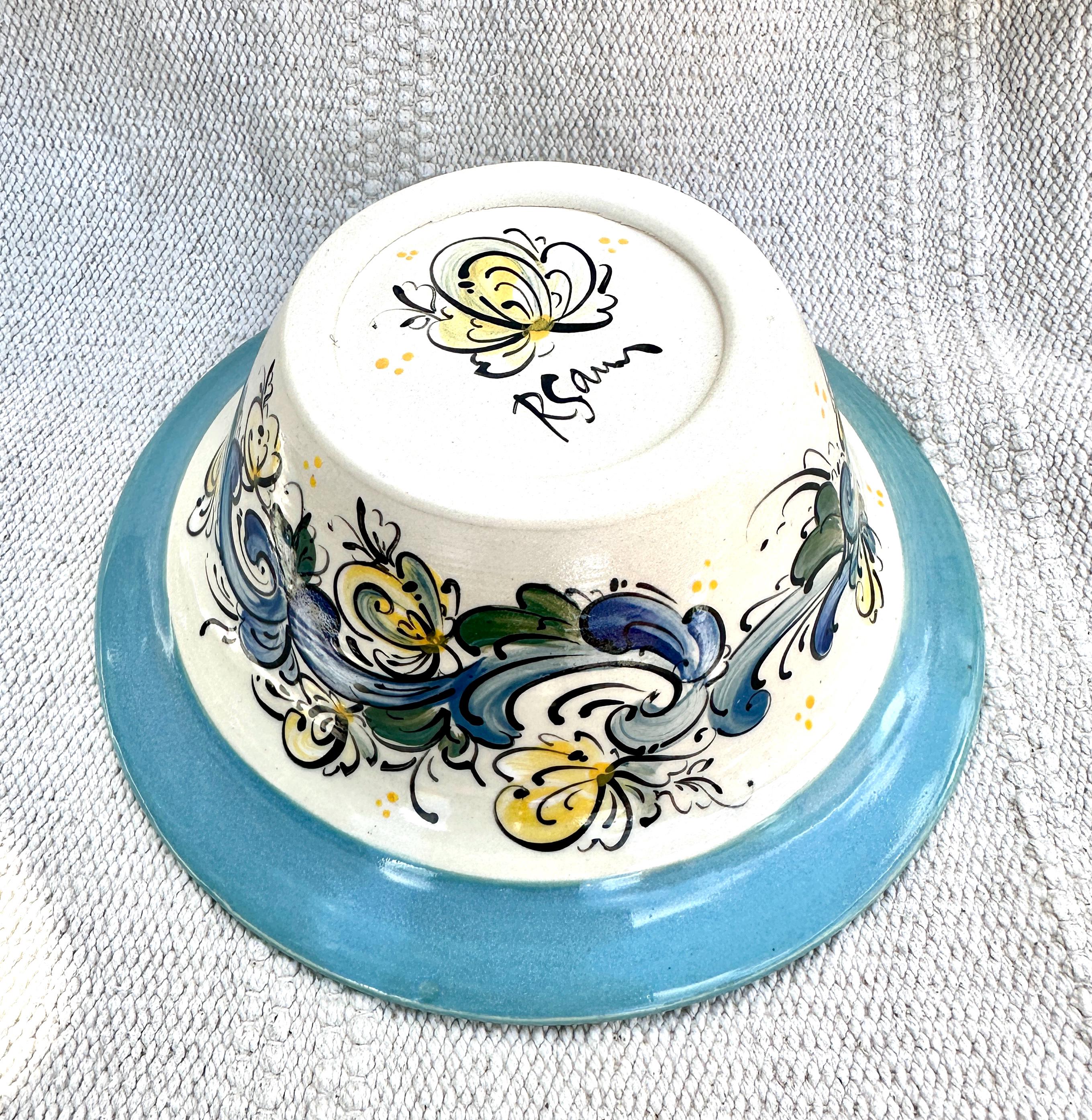 Wheel thrown stoneware serving bowl with handpainted Telemark Rosemaling design. Rosemaling on both the exterior and interior, decorative as an accent, catch all bowl or as a serving bowl.