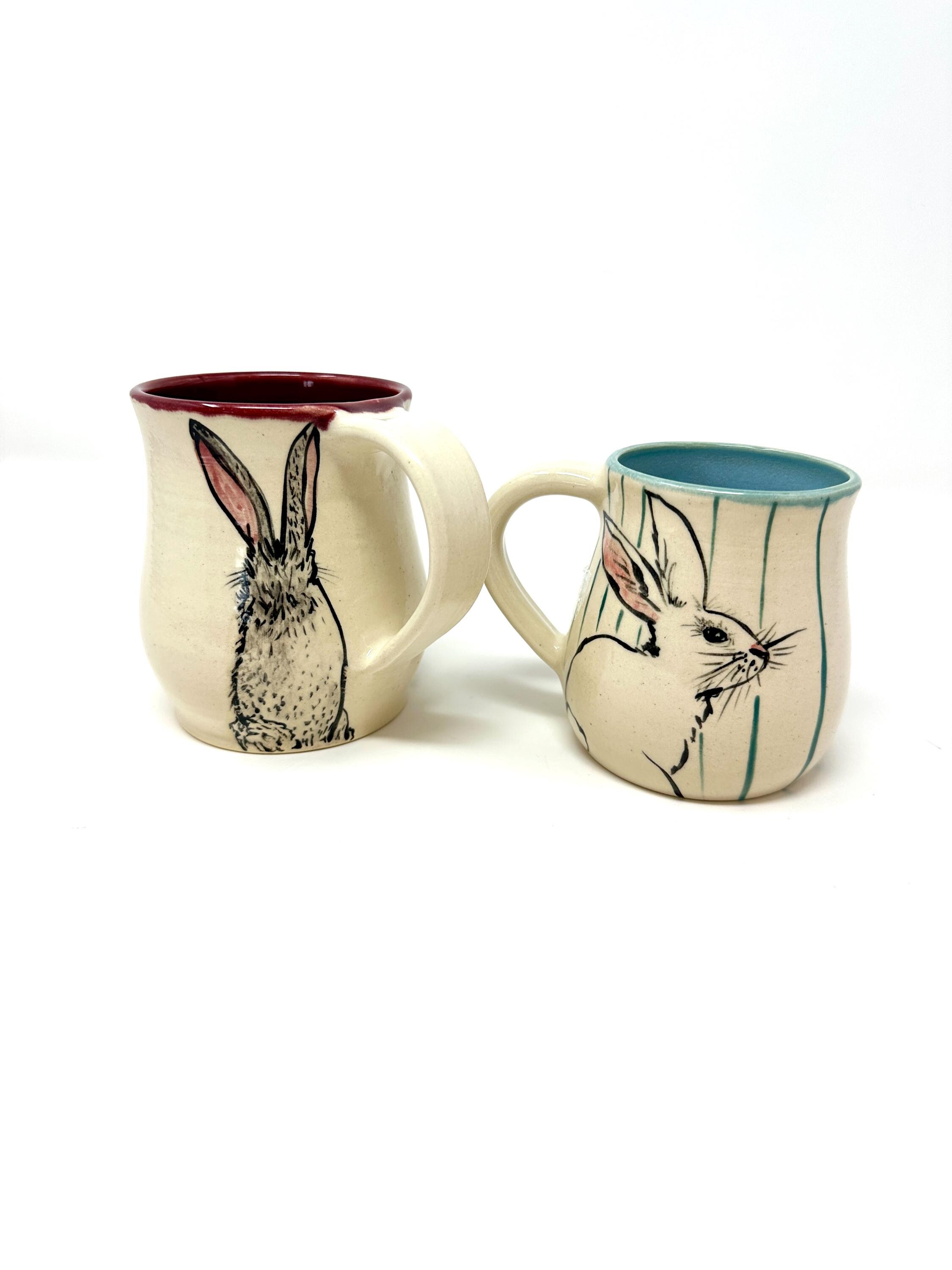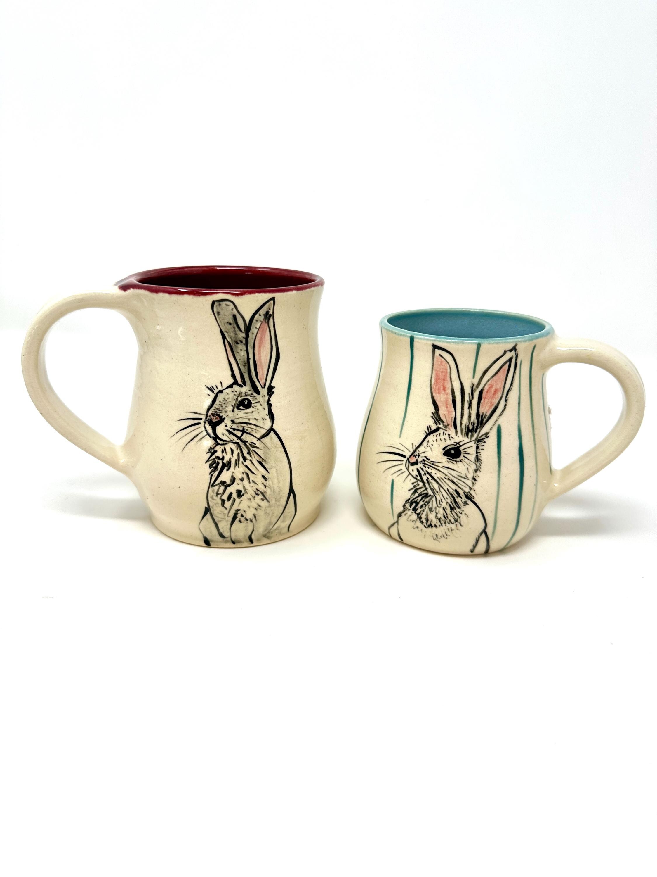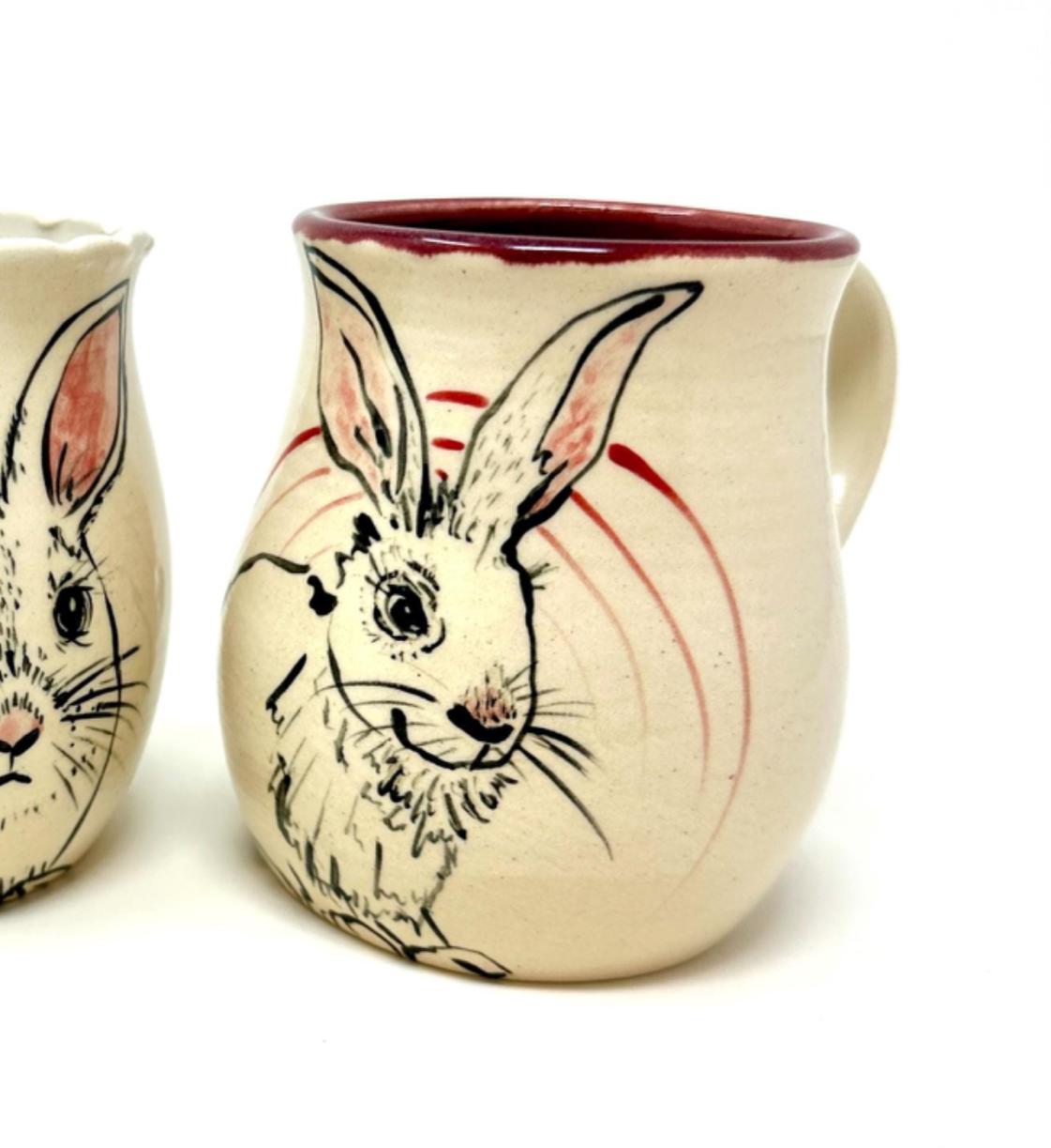 Handpainted wheelthrown stoneware mugs and cups, with jackalopes, rabbits and a fox.