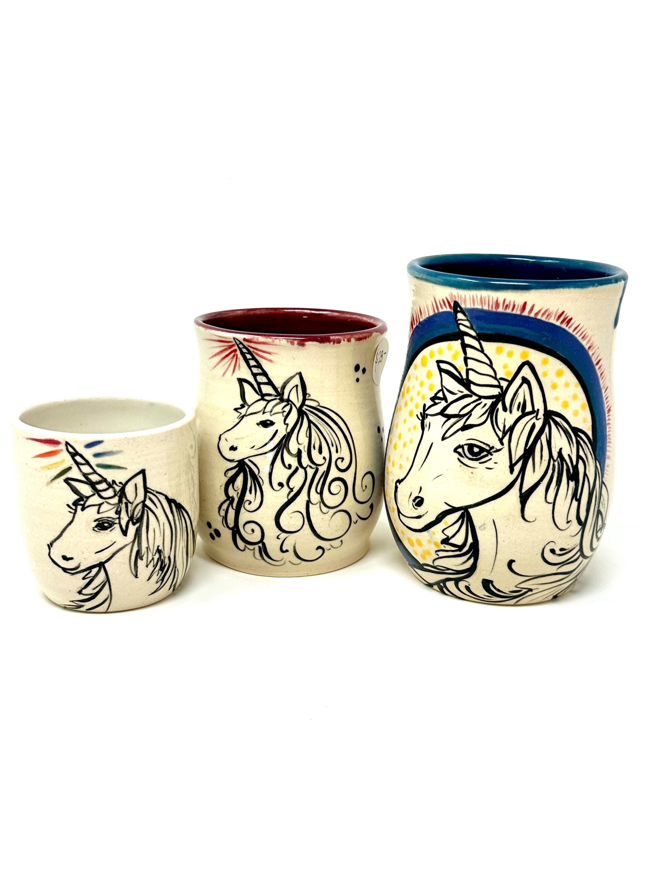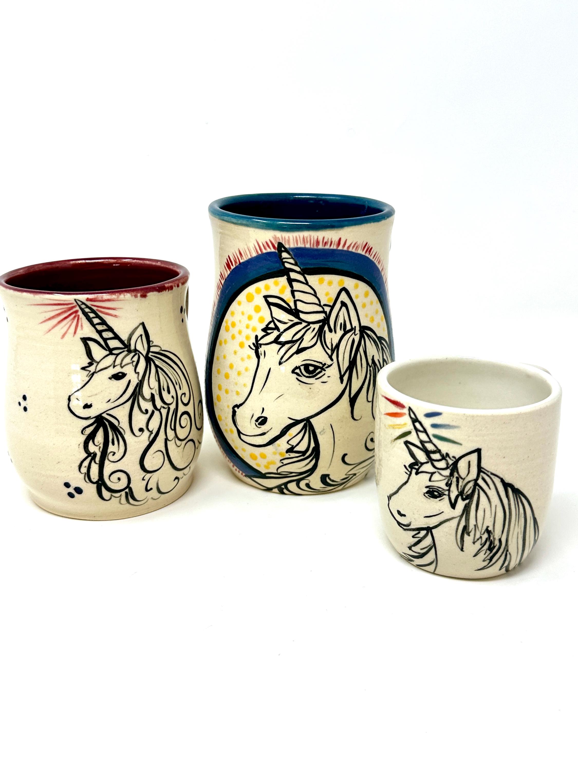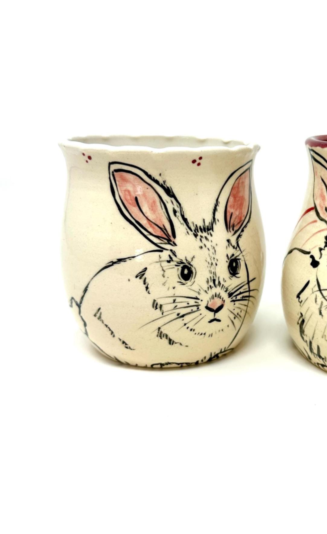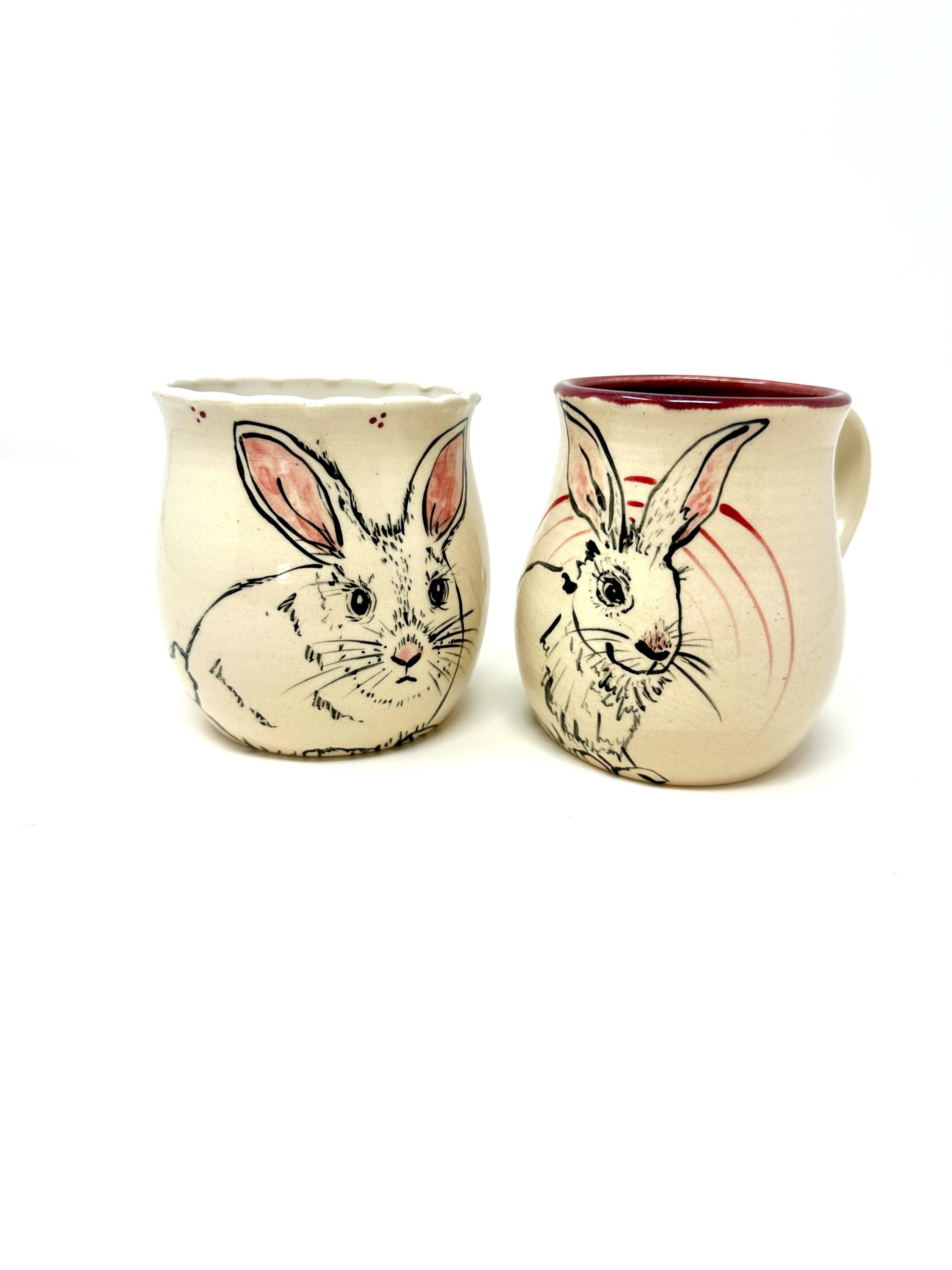 Handpainted wheelthrown stoneware mugs and cups, with jackalopes, rabbits and a fox.
